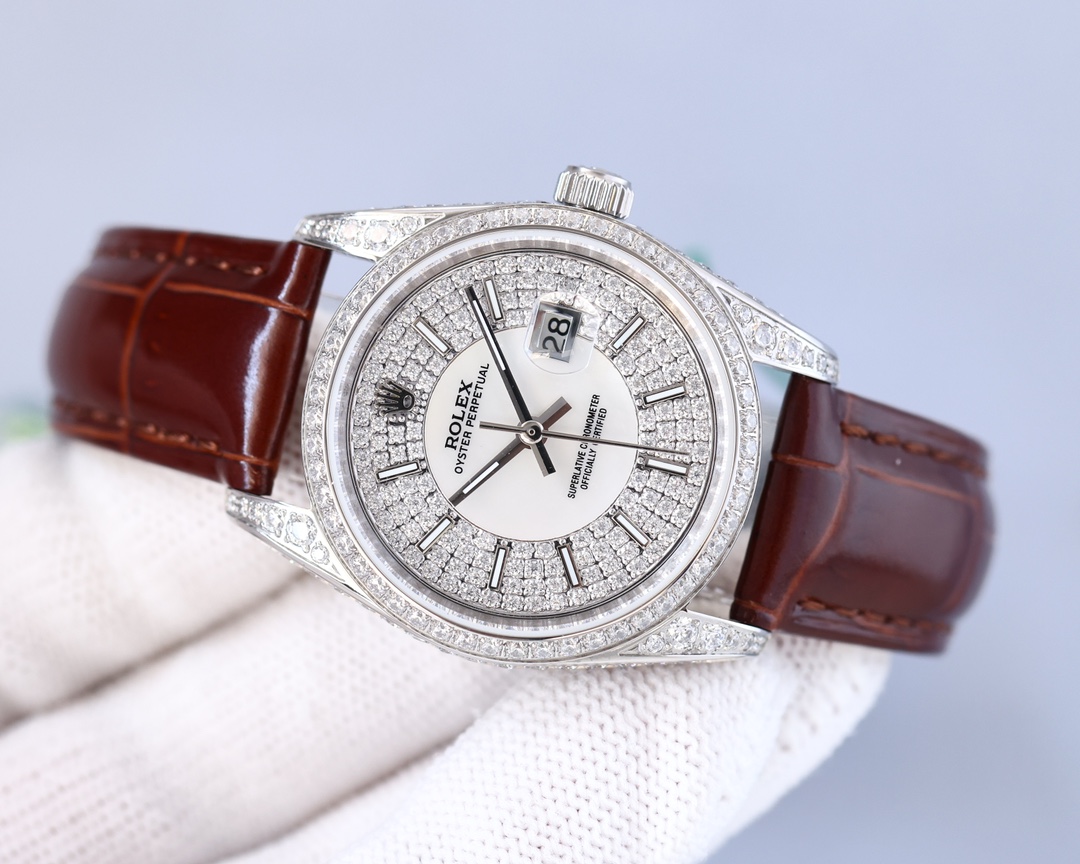 劳力士 Rolex 满钻日志女士款原装扣皮带款式奢华满钻镶嵌工艺不易掉钻5年内掉免费补新钻尺寸:女款32mm。厚度10mm 镜面:蓝宝石玻璃,永不刮花。 材质:实心316L精钢 机芯:进口机nh05机械机芯 振频:21600每小时振荡次数 动力:动力储备48小时 表带:316精钢表链 防水深度: 100米。 顶级出品 精品不断