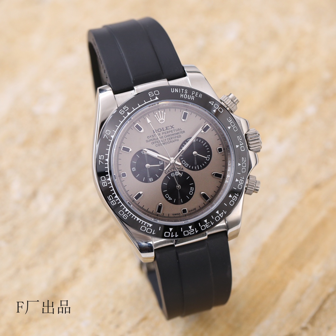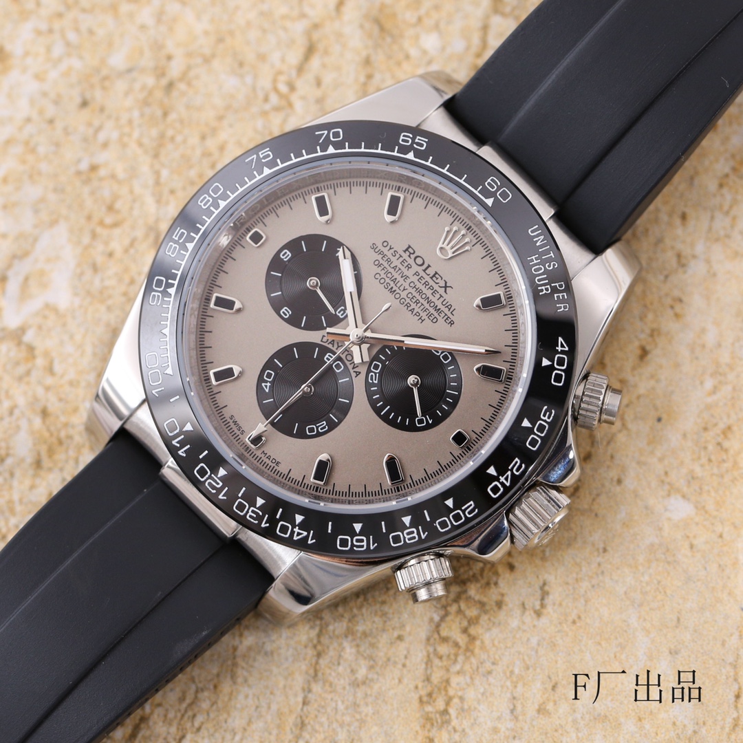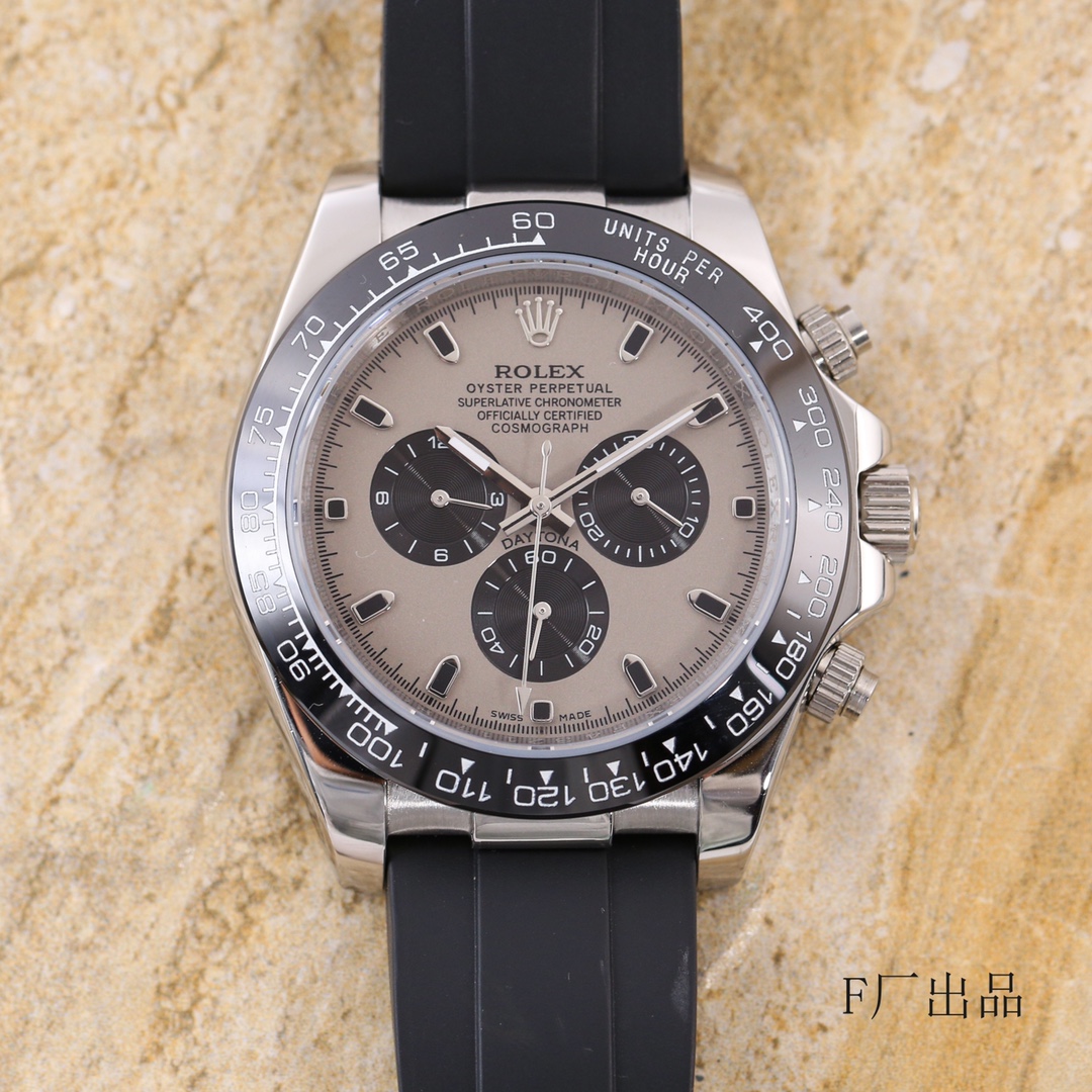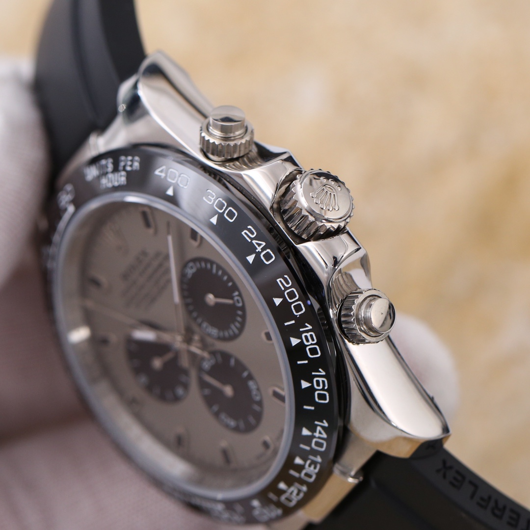 新面来袭:“皓月灰” 欧版“迪通拿”F厂V3 版本改良与V2的所有细节不足 另:量备货 放心选购 经典版全面到货 一直给同级别作为“吊打”对象却从未被超越 以过硬的品质 应对各种挑战 迎回头客 劳力士 Rolex 宇宙计型 迪通拿系列 机芯采用订制的三眼放大版的全自动机械机芯使三个功能盘的距离和正品一致 表壳43mmX13mm“欧陆”版本,深黑色陶质实心外圈连计速刻度采用真陶瓷工艺 刮不花 永不退色 质感和正品一致 表盘功能盘字体和盘面logo采用叠加印刷工艺,从侧面观察会有微微隆起之感。盘面的底色纹路经过无数次过滤改正,确保百分百吻合与原装。其上的 劳力士 Rolex 金属LOGO单独开模,无论是立体感还是圆润度均可PK原装 易读Chroma light夜光显示 配长效夜光物质 表镜平形蓝宝石水晶玻璃 抗刮损,效果绝不重影,吻合正品。六字位劳力仕特有的防伪标志 小皇冠 表扣采用进口316钢 1:1散件打磨而成 拉沙内侧 腐蚀 劳力士 Rolex 钢印 外置正品一模一样的 表扣保险环 F厂出品 完美在每一个