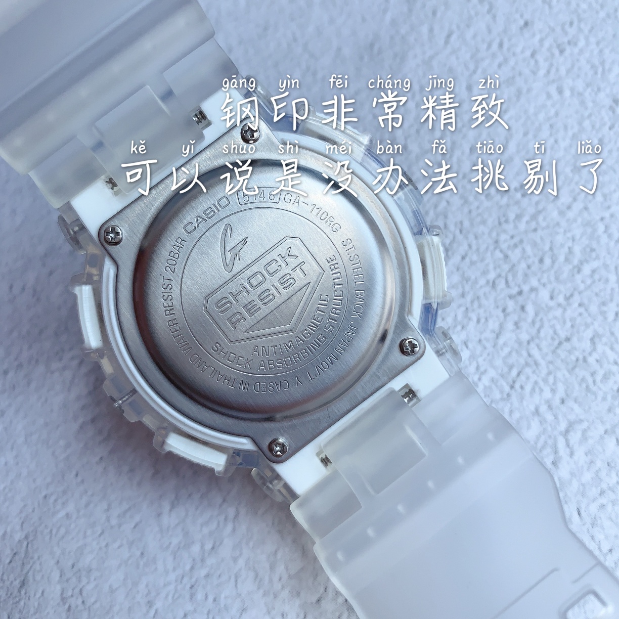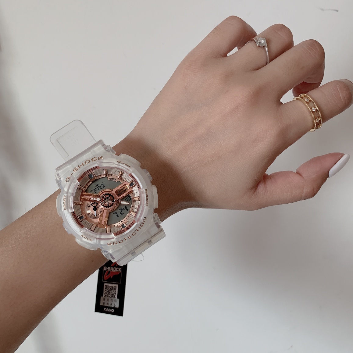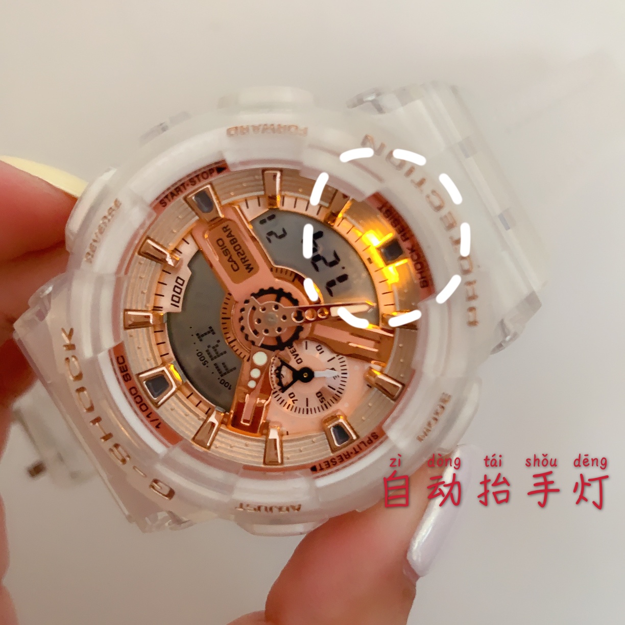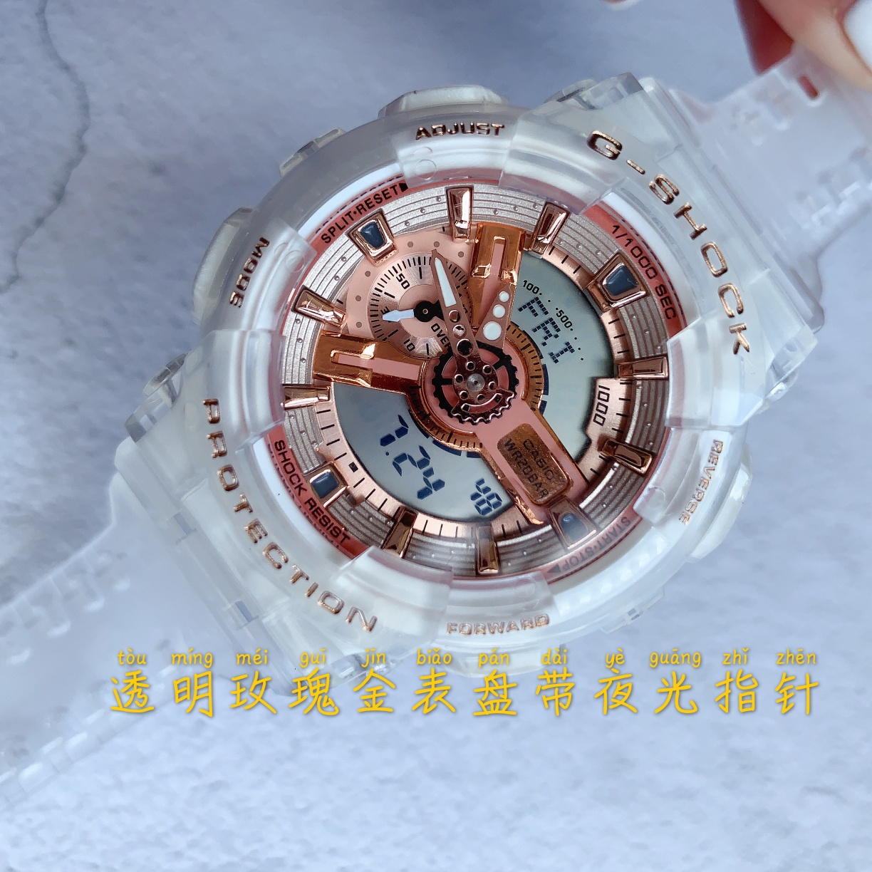 E0 Casio 卡西欧 GA-110全新透明玫瑰金女性系列晶透来袭. 经典的双显大表盘 夜光指针设计.晶透无暇的透明感表身搭配 散发金属光泽的玫瑰金表盘,呈现腕表的骨感线条,金属镜面的冷峻与玫瑰金色的柔美相得益彰 主要功能:防震,200米防水,高亮度自动LED照明 遇水镜面变透明 世界时间48城市 秒表1/100秒 12/24小时时制 每日闹铃,整点响报 倒计时 全自动日历 型号:GA-110