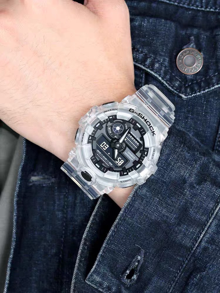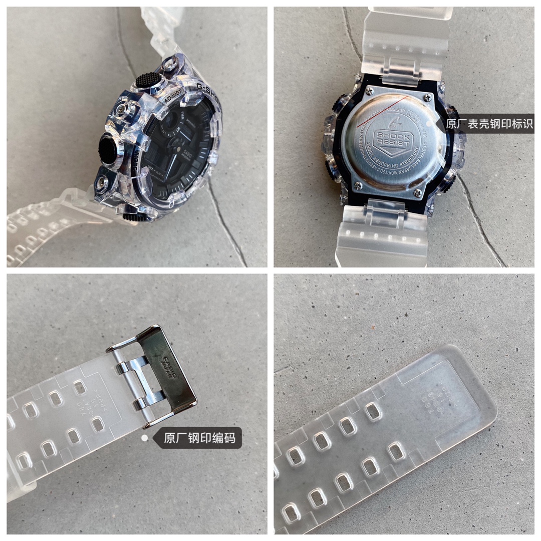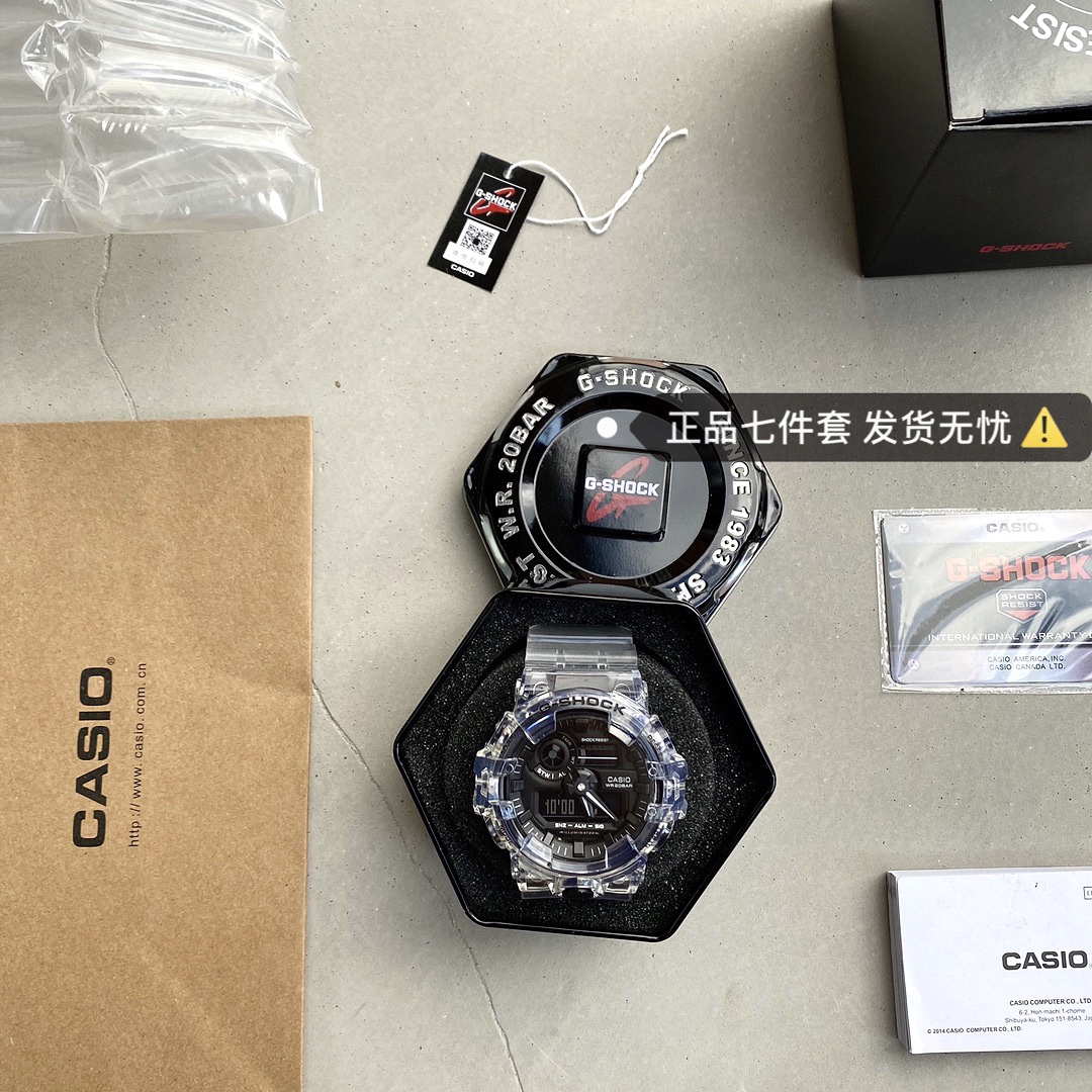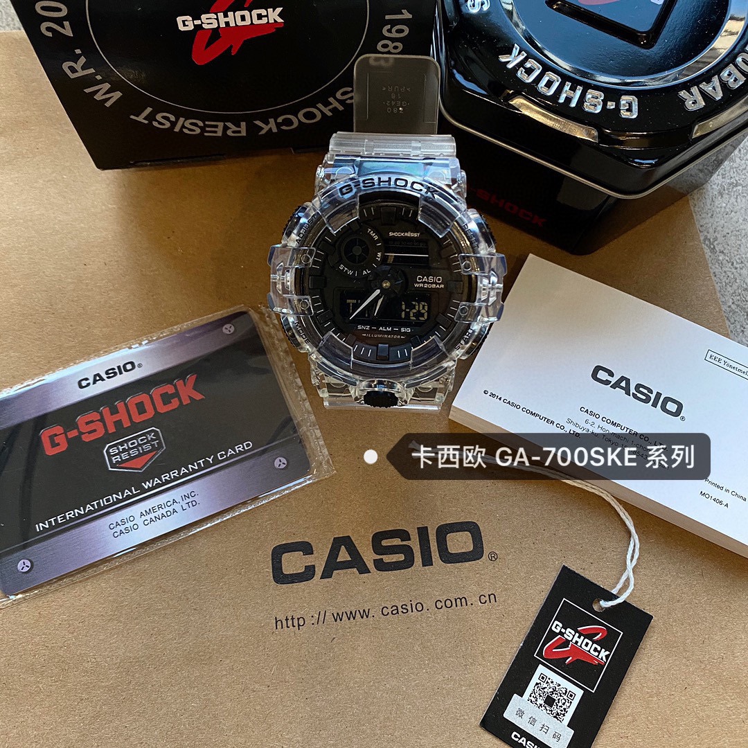 G5 Casio 卡西欧 GA-700SKE透明冰韧系列 产品介绍: 每个手表都配有一个防伪吊卡标签,可扫码 进口原单日本机芯,性能稳定,随意拆机检验 正品开模,正品用料,原版透明树脂表带,手感、重量、质感秒杀普通货 正品200米深度防水,游泳洗澡随意戴 防震、耐振动,好货耐造,不做娇贵宝贝 香港大货订单,经过专业QC质检,做工保证 整套包装: 气泡袋+正品七件套,发货无忧