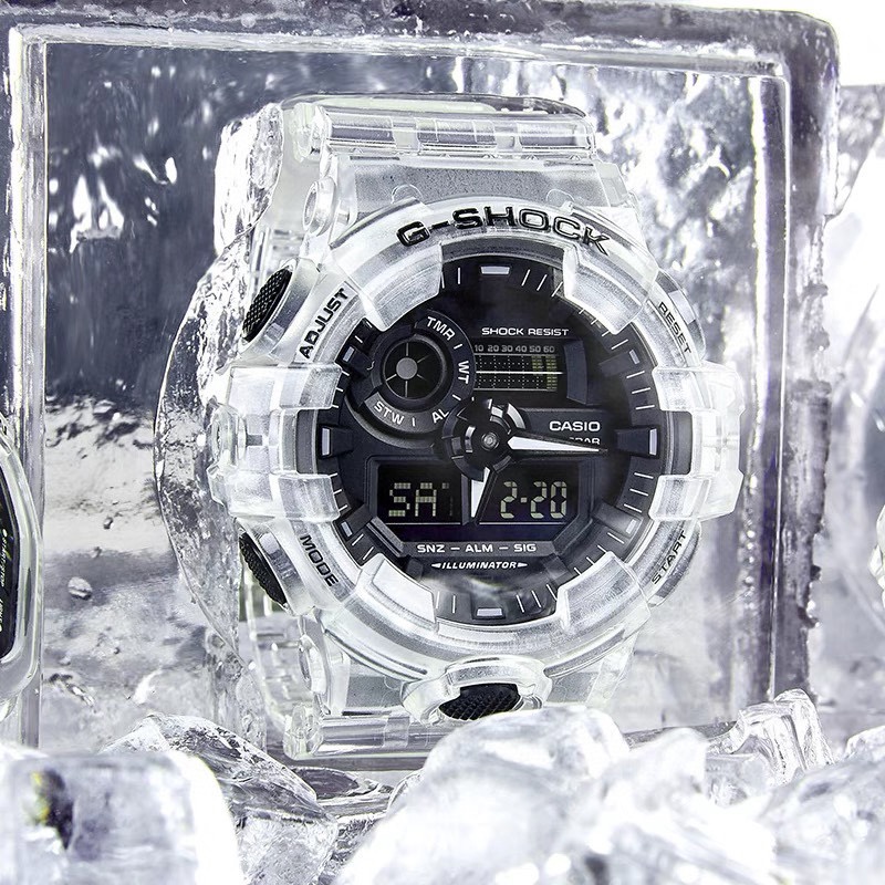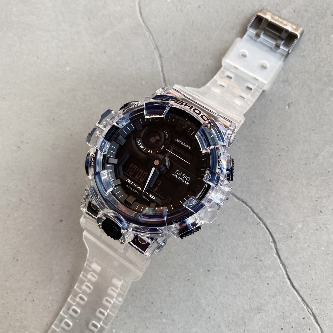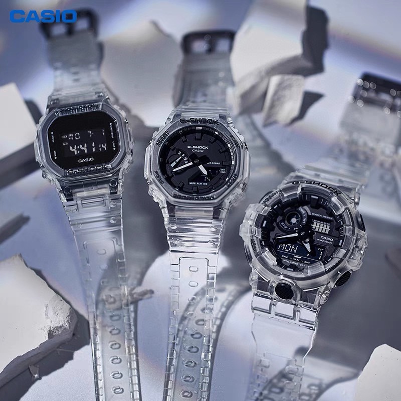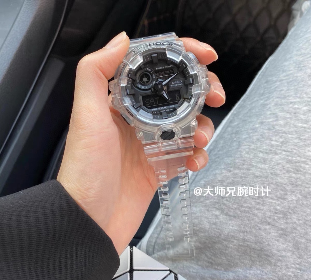 G5 Casio 卡西欧 GA-700SKE透明冰韧系列 产品介绍: 每个手表都配有一个防伪吊卡标签,可扫码 进口原单日本机芯,性能稳定,随意拆机检验 正品开模,正品用料,原版透明树脂表带,手感、重量、质感秒杀普通货 正品200米深度防水,游泳洗澡随意戴 防震、耐振动,好货耐造,不做娇贵宝贝 香港大货订单,经过专业QC质检,做工保证 整套包装: 气泡袋+正品七件套,发货无忧