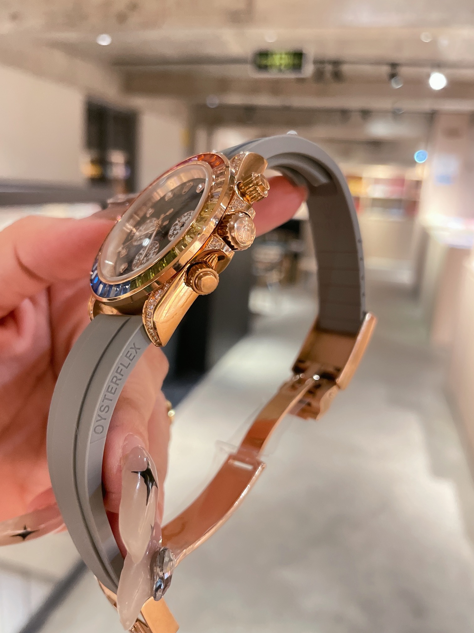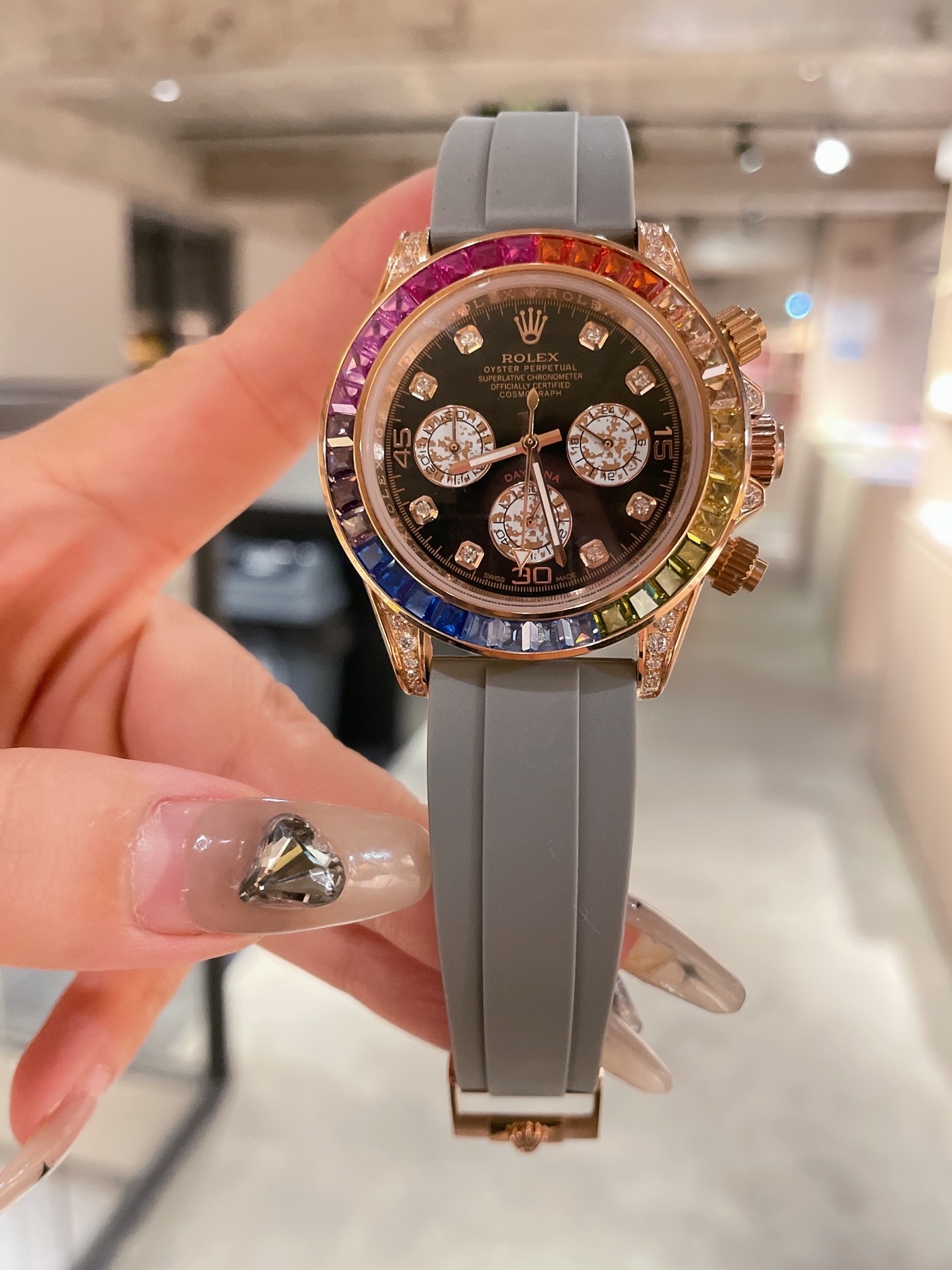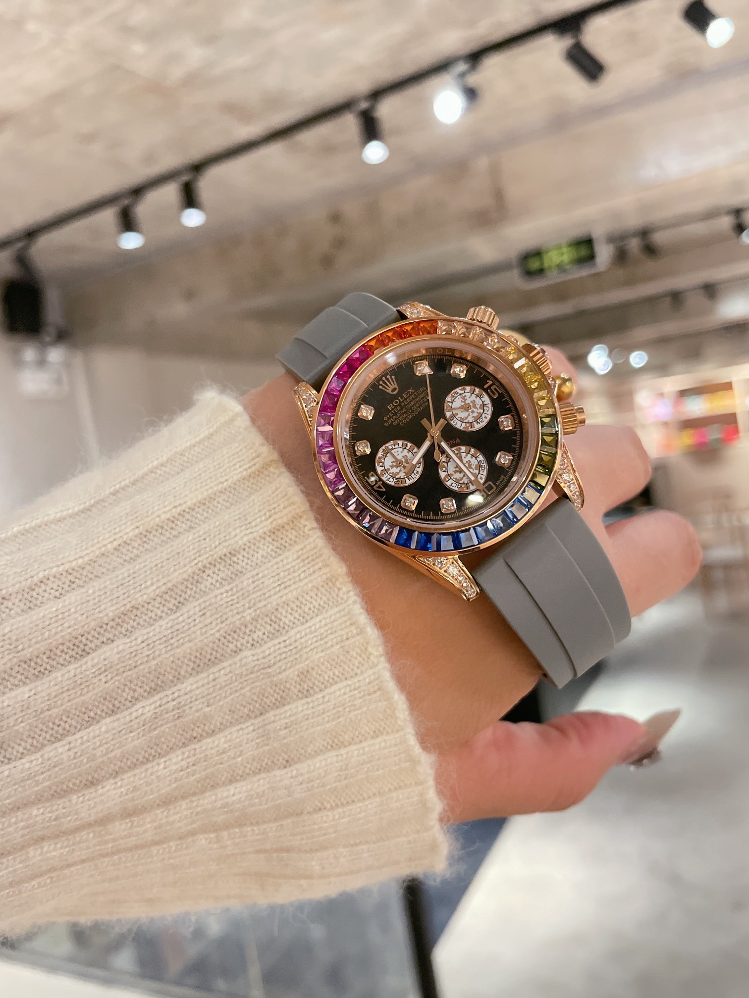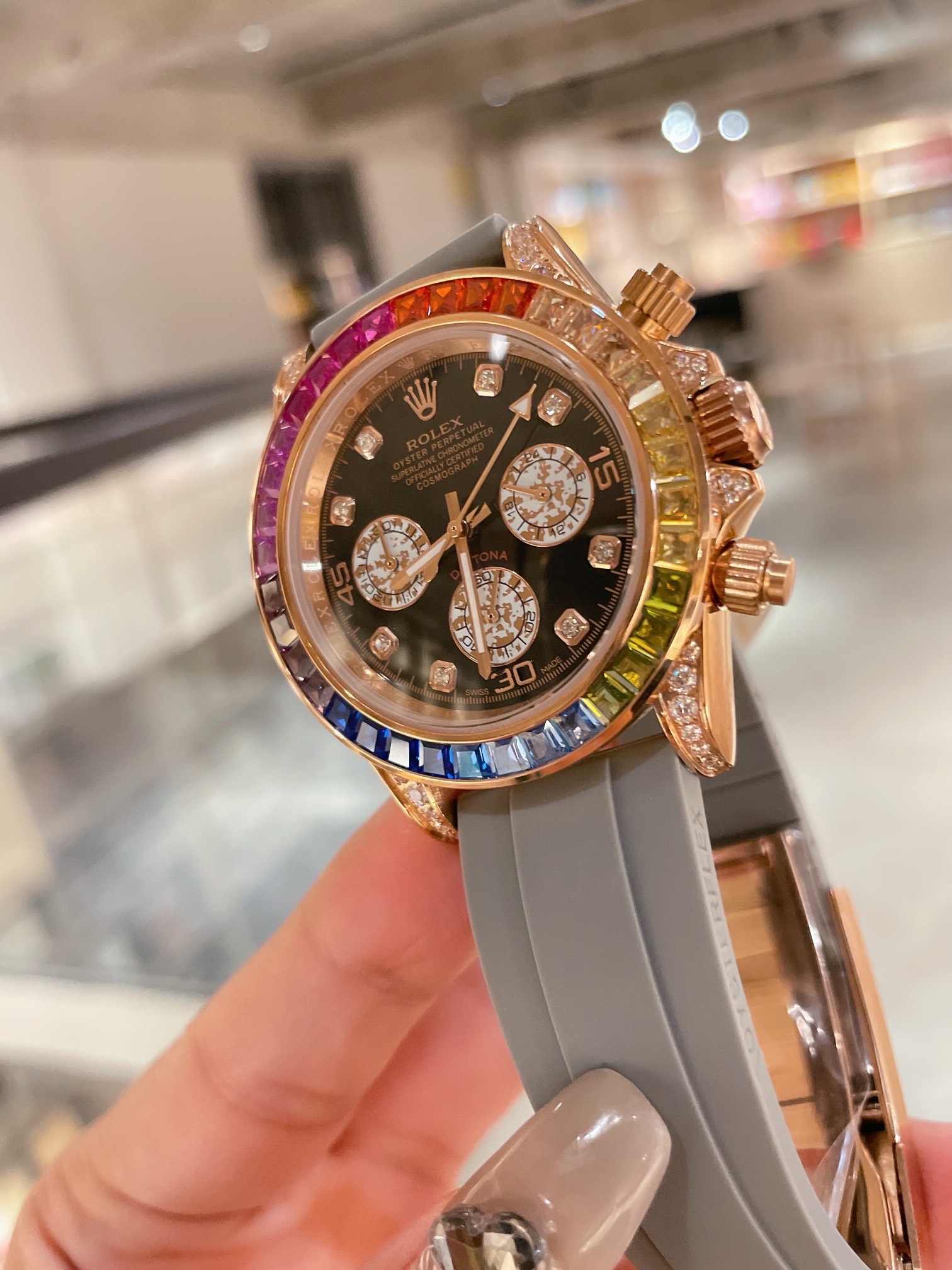 L5 全新 劳力士 Rolex 迪通拿彩虹款。型号:116599RBOW-116598RBOW-116595RBOW.彩虹迪通拿一表难求镶嵌根据原厂颜色渐变过渡最协调的36颗宝石进行优化处理,高度、角度一致,折射效果非常漂亮。字面每个计时盘为光线的不同而发生折射,色泽鲜艳亮丽,独一无二。搭载进口石英机芯 分别有星期 月份 24小时显示Rolex钢实心表扣,硅胶表带 抛光打磨精湛细腻。”},”shop_minicode”:”https://xcimg.szwego.com/minicode_A201905280027053260099382_20190528002705.png_180