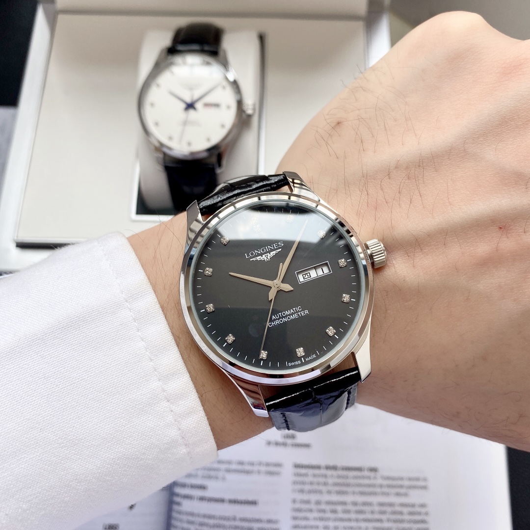 , 特别推荐 经典热卖浪琴 Longines 男士腕表 全自动机械机芯 矿物强化玻璃 316L精钢表壳 真皮/精钢表带 简约设计 商务休闲 尺寸:直径40mm 厚度12mm