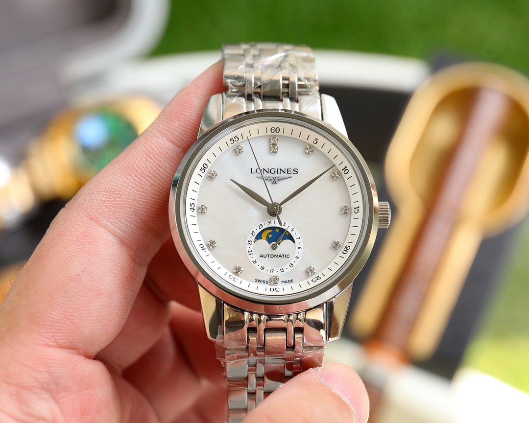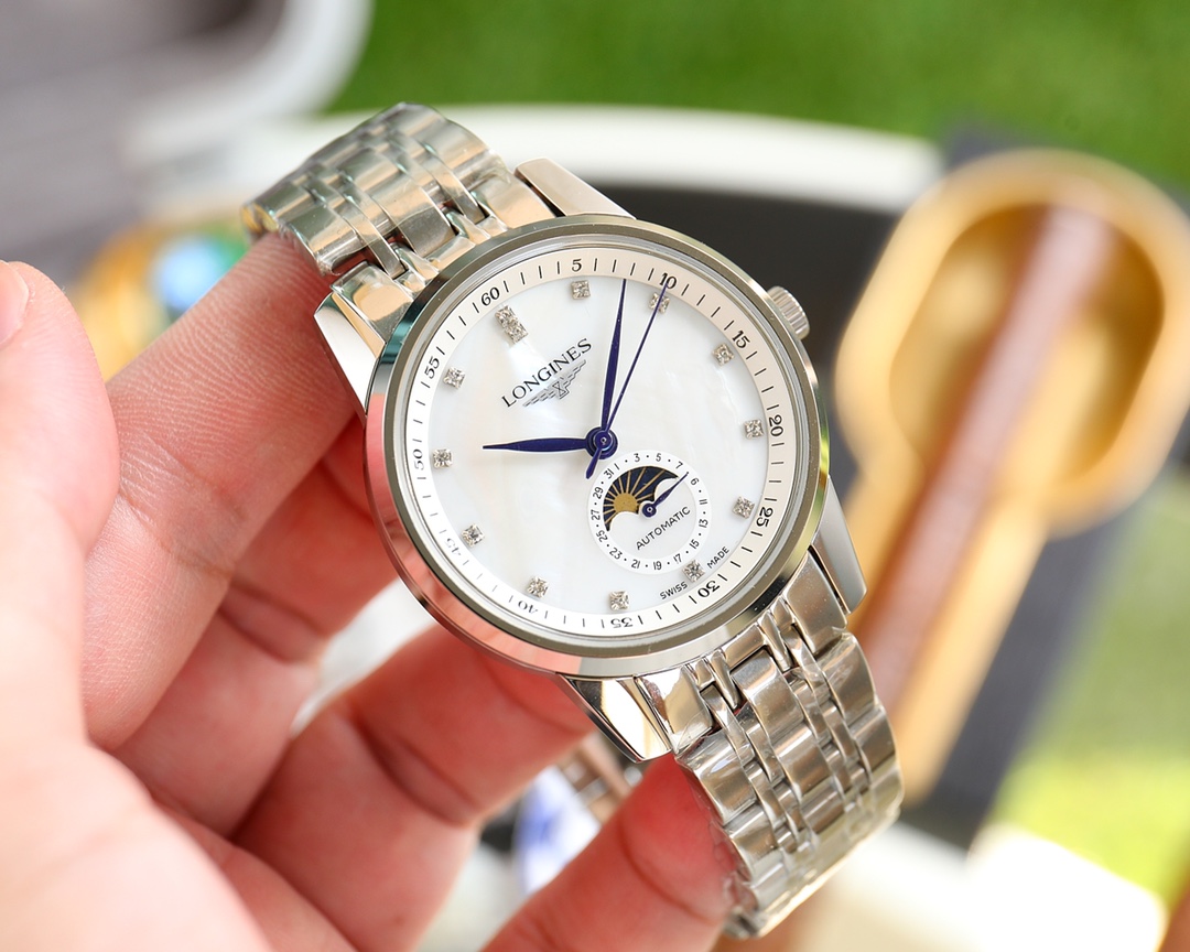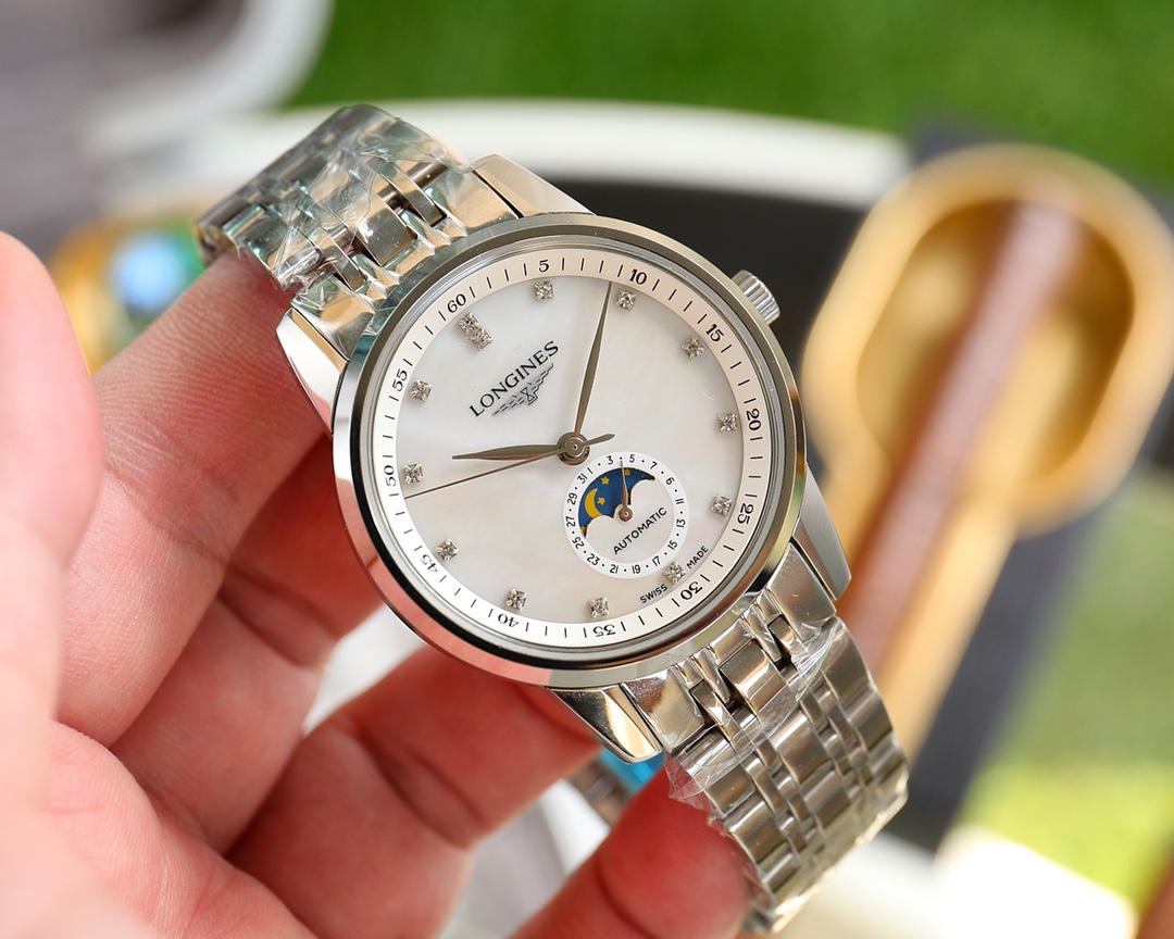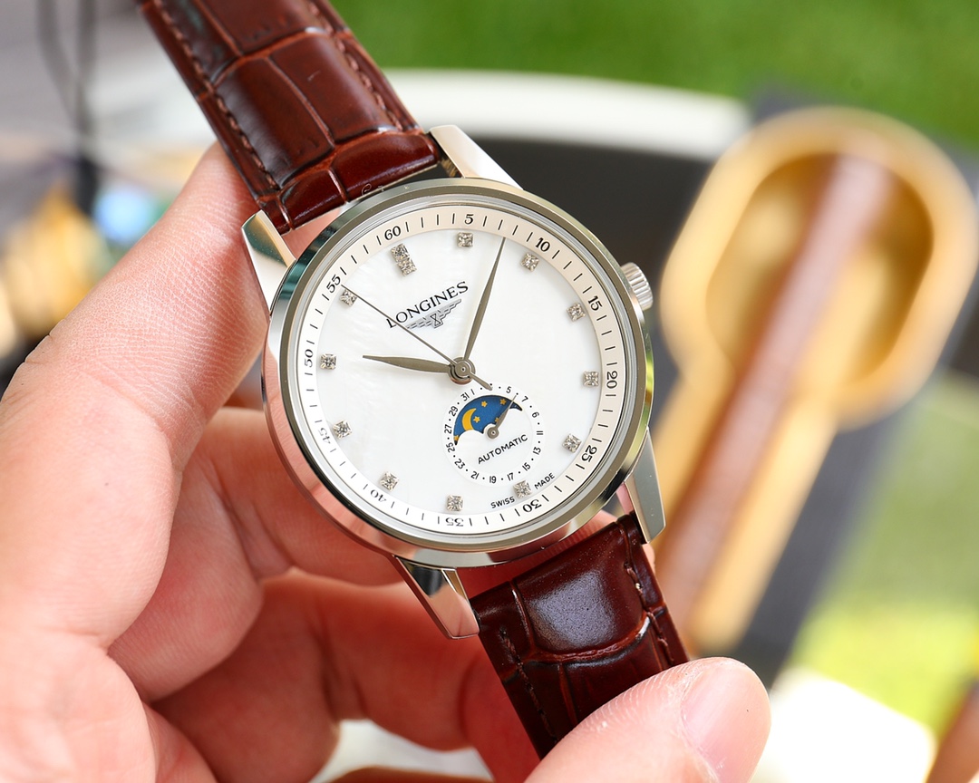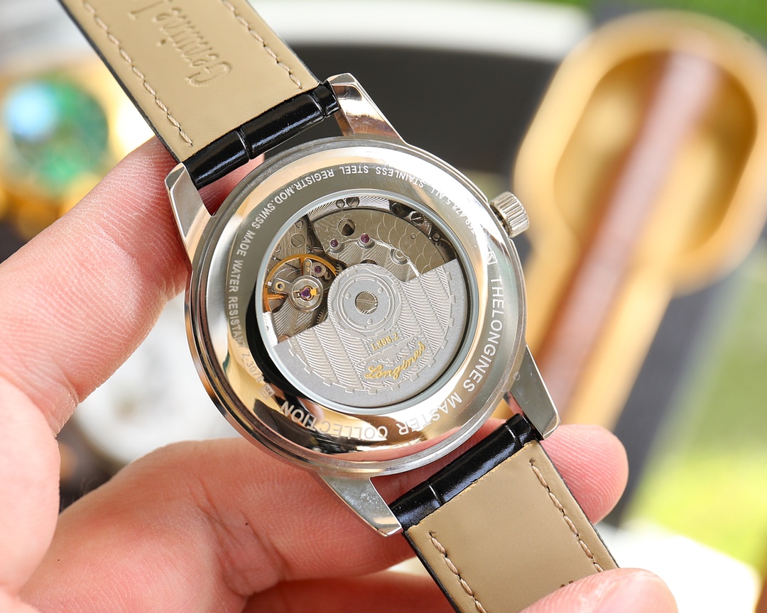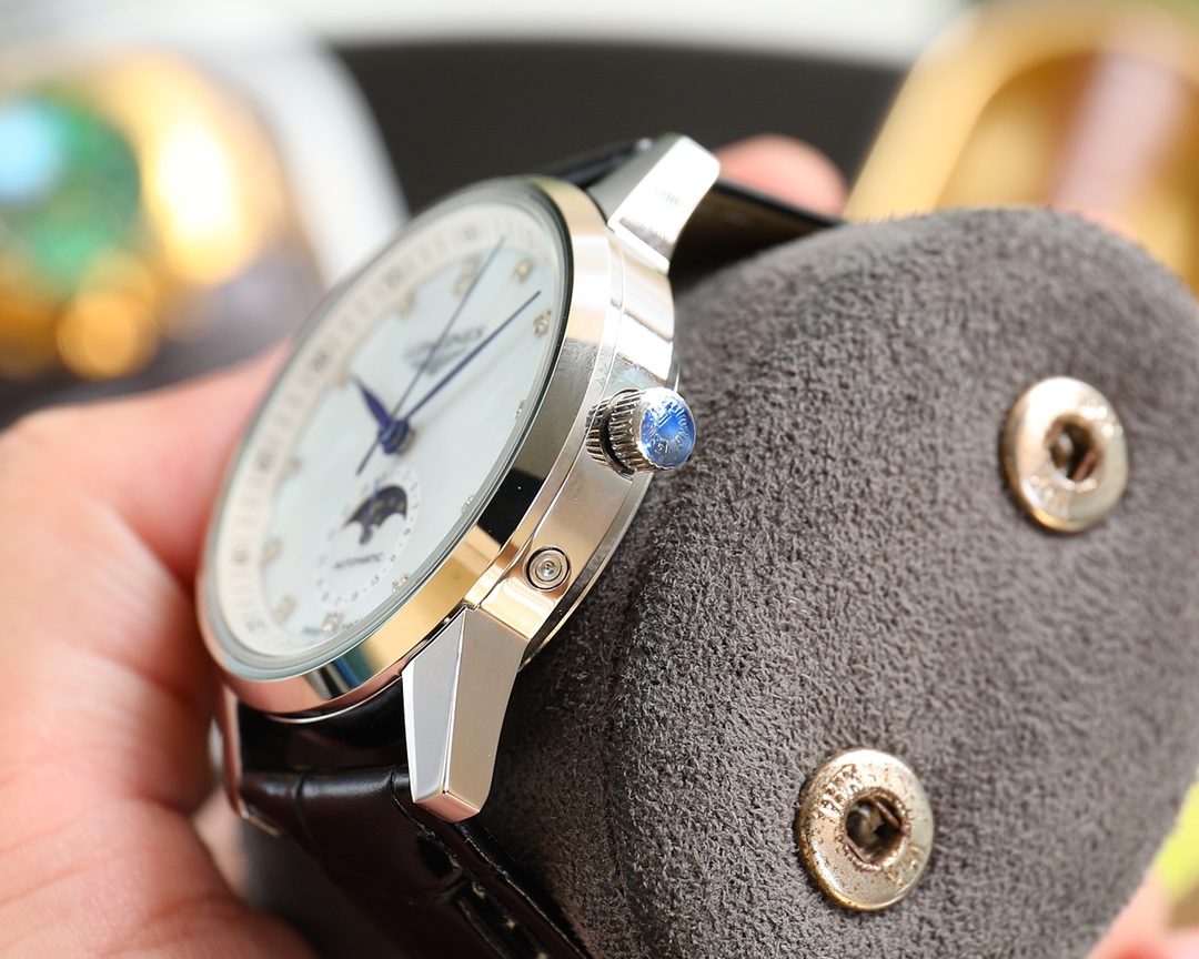 , 皮带,钢带 全新升级高端系列浪琴 Longines 复古系列L2.9.4.78.3月相腕表压轴登场简约优雅尽显从容气度表壳1.腕表尺寸40X11.5毫米,细节一丝不苟的还原复古系列表壳独特的优雅精髓,让佩戴者在佩戴过程中既贴手,且舒适。2.柳叶形蓝钢淬火表针,3.六点钟的月相功能与原装无二,均是一个月转一圈,操作和调试的方法吻合原版4.表盘上的贝壳纹理。表带扣意大利小牛皮表带搭配浪琴 Longines 经典蝴蝶式精钢表扣.4点位有快调按钮调6点位星辰日历