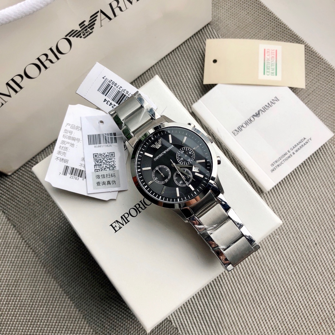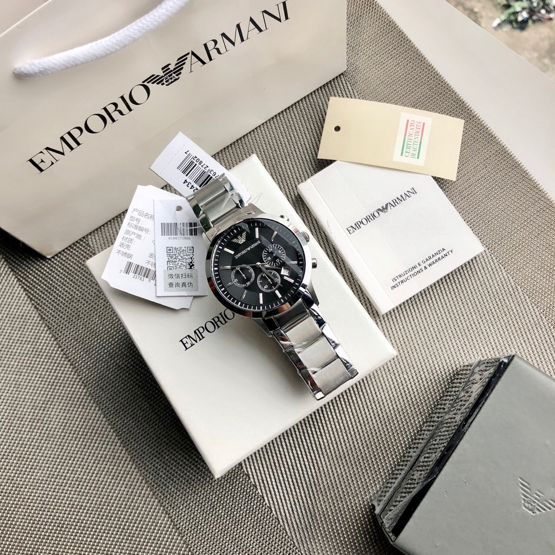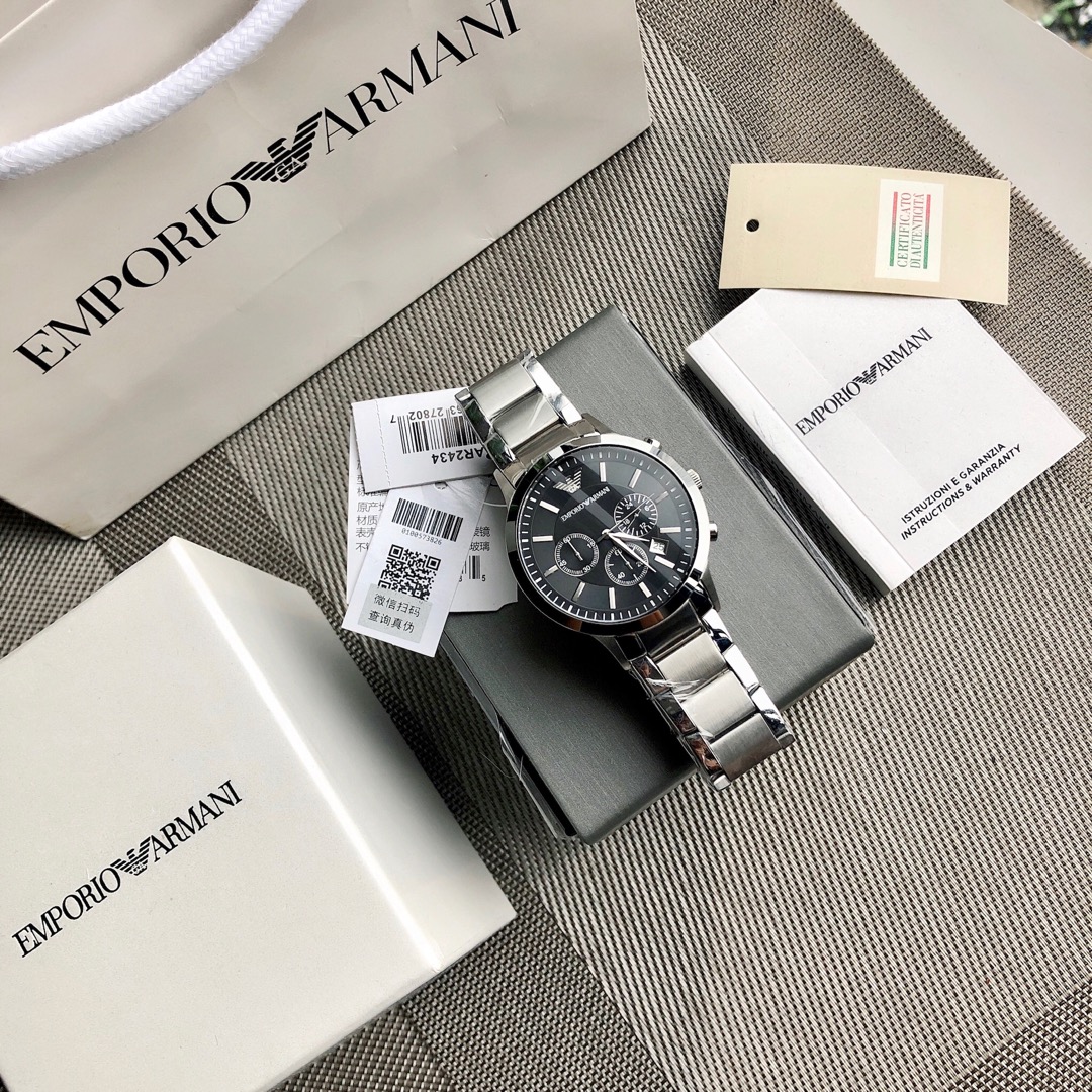 J0 Armani AR2434 阿玛尼 Armani 经典休闲商务款,316钢表带,黑色表盘,三眼设计,带日期,316钢表带石英表,表盘直径43mm 矿物质玻璃镜面,清晰高透,设计超级精致,表盘表带都十分简约大气,整个气质马上不一样了,小红书剁手款,男神钟爱款,上班不失风度,体现男性硬朗之风和成熟稳重的气质,休闲商务不二之选,生活防水30米