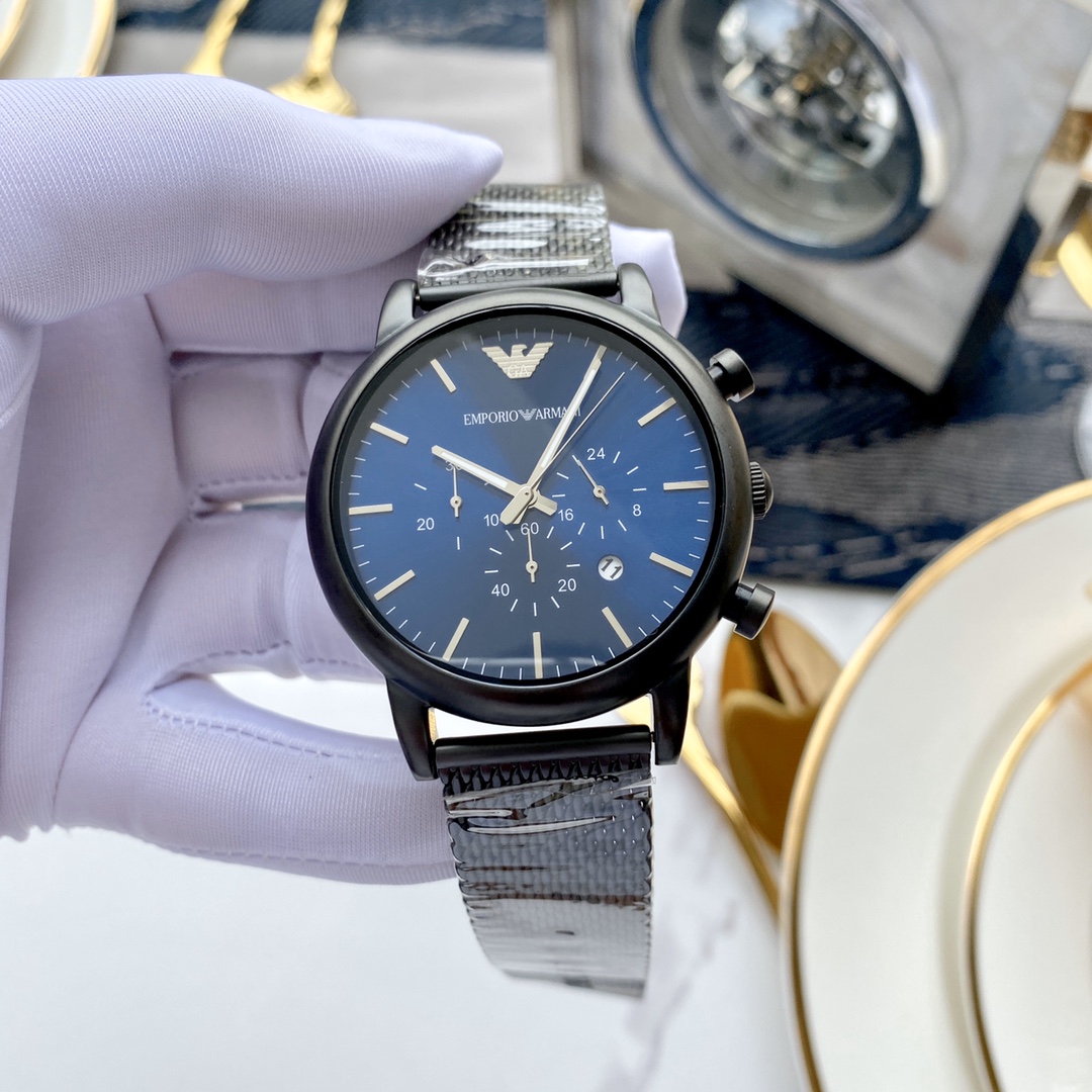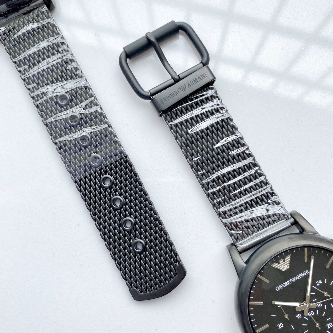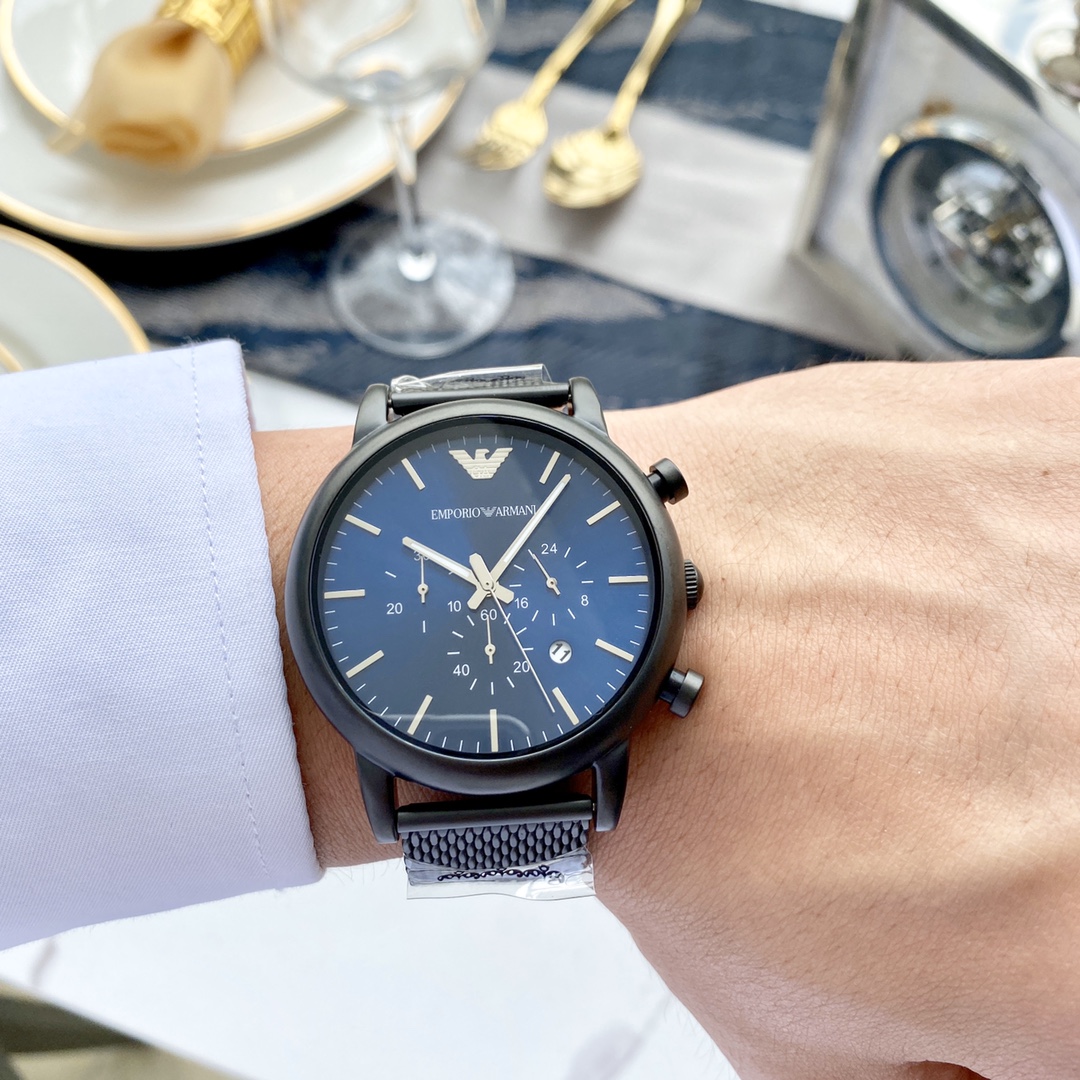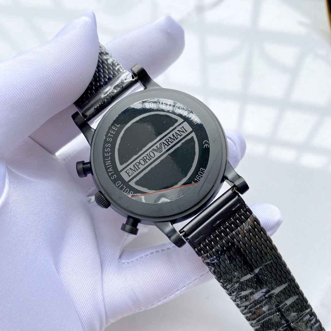 J5 原单 Armani 阿玛尼 141000 型号:Ar1979 表壳:316L精钢 表镜:强化矿物质玻璃 表带:316L精钢编制网带 表扣:针扣 尺寸:43mm*12mm 气场十足的大三眼设计 壳身的流畅线条诠释简致 暗蓝色的绅士格调打造男士沉稳魅力 所有原单型号可上网搜索_底盖附有相应型号二维码
