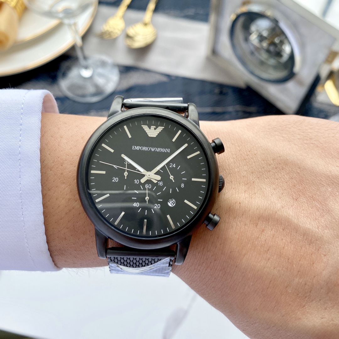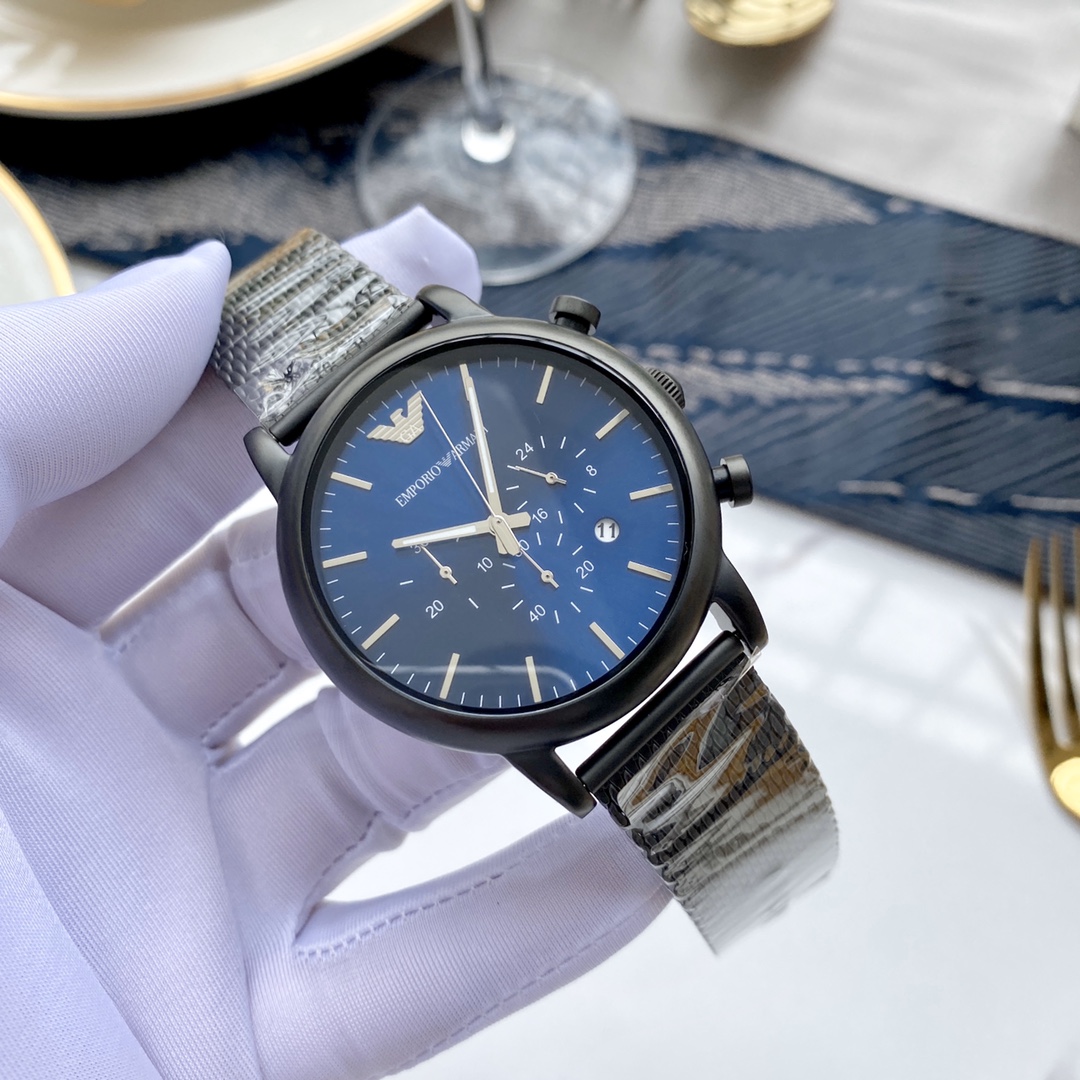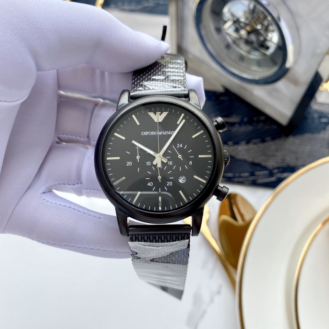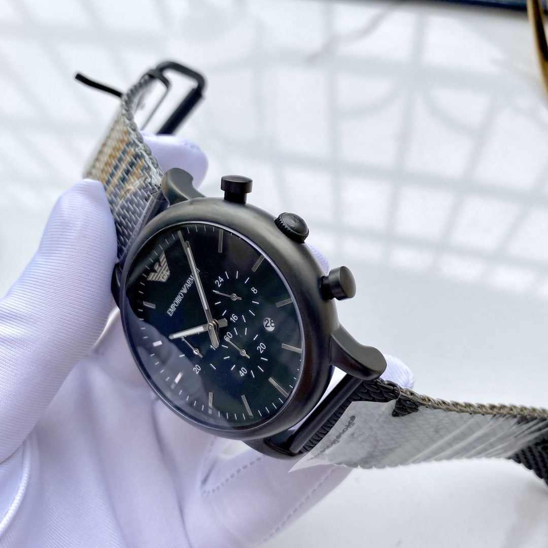 J5 原单 Armani 阿玛尼 141000 型号:Ar1979 表壳:316L精钢 表镜:强化矿物质玻璃 表带:316L精钢编制网带 表扣:针扣 尺寸:43mm*12mm 气场十足的大三眼设计 壳身的流畅线条诠释简致 暗蓝色的绅士格调打造男士沉稳魅力 所有原单型号可上网搜索_底盖附有相应型号二维码