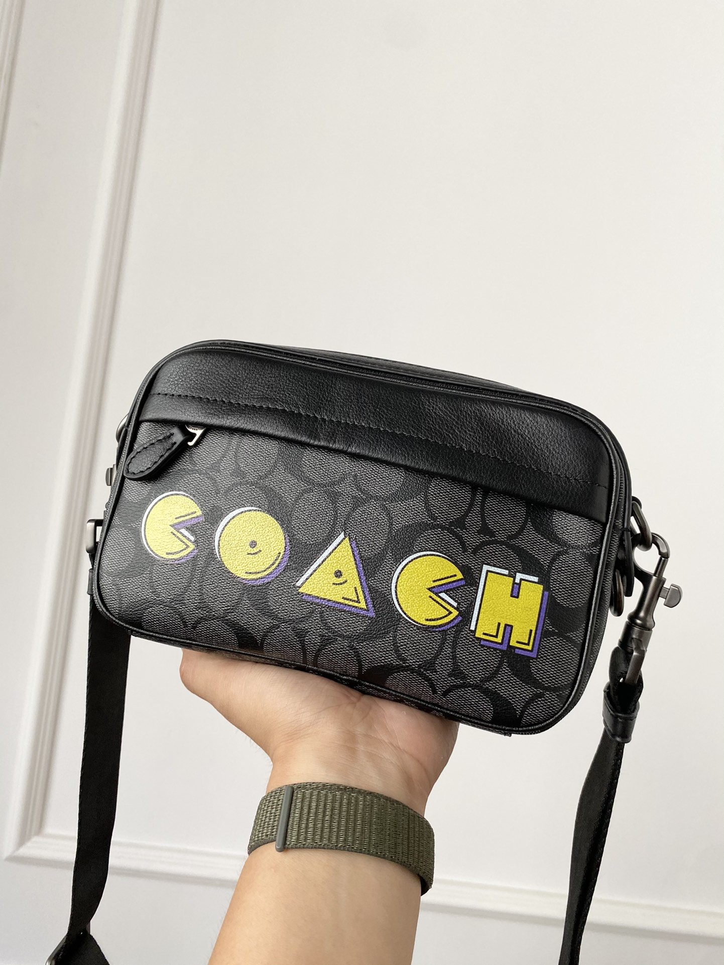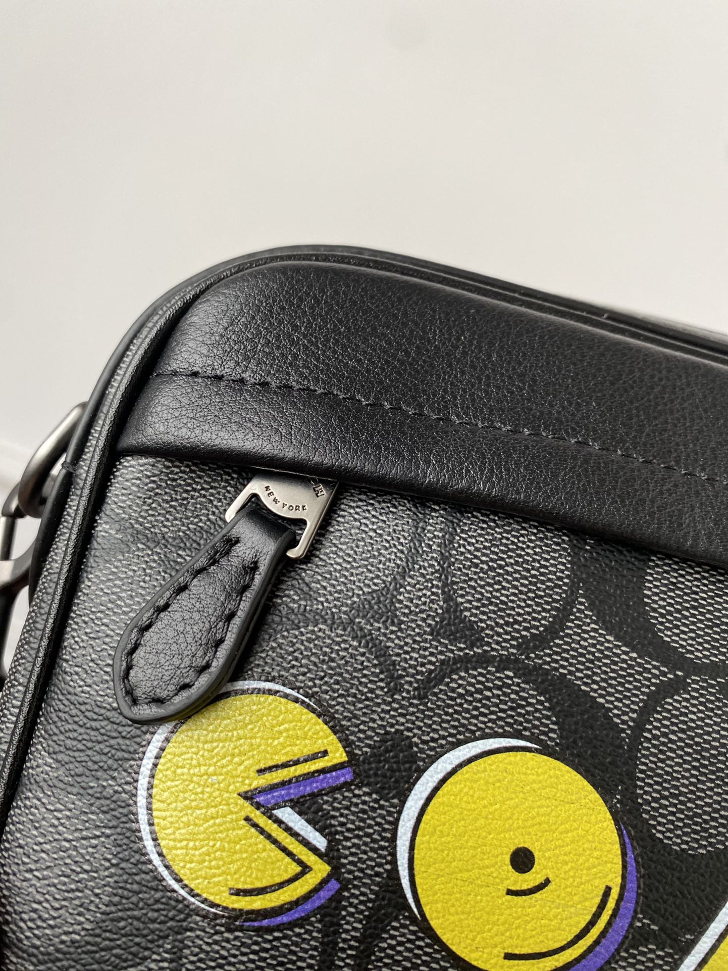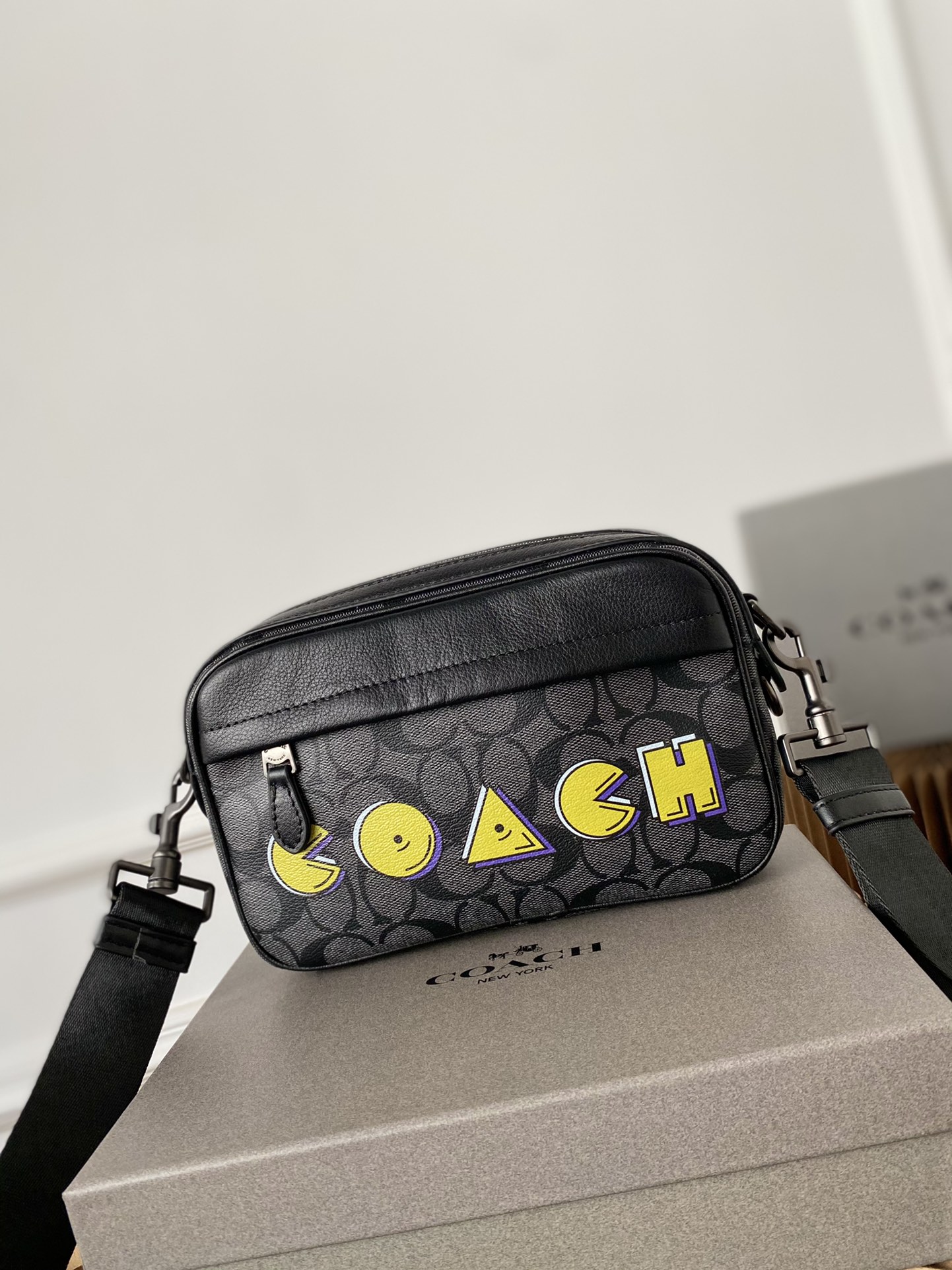 J0 Coach 蔻驰 牛皮版本吃豆人联名相机包 Graham 单肩包 男士斜挎包 经典Logo搭配原厂工艺材质 休闲百搭斜挎包 采用精湛镶嵌细工,实物拍摄 原厂原版面料 配送小票防尘袋 礼盒 14 x 23 cm。