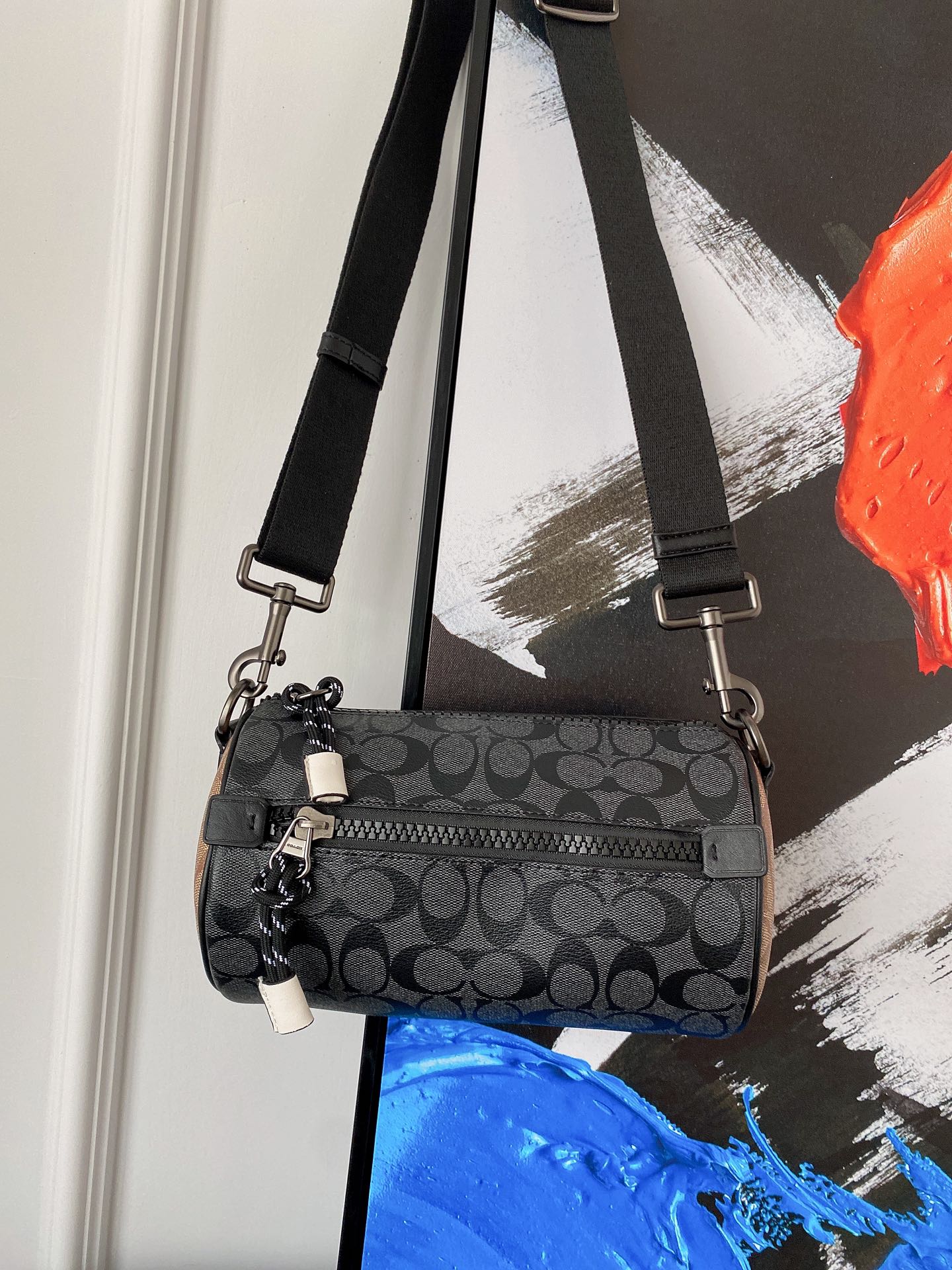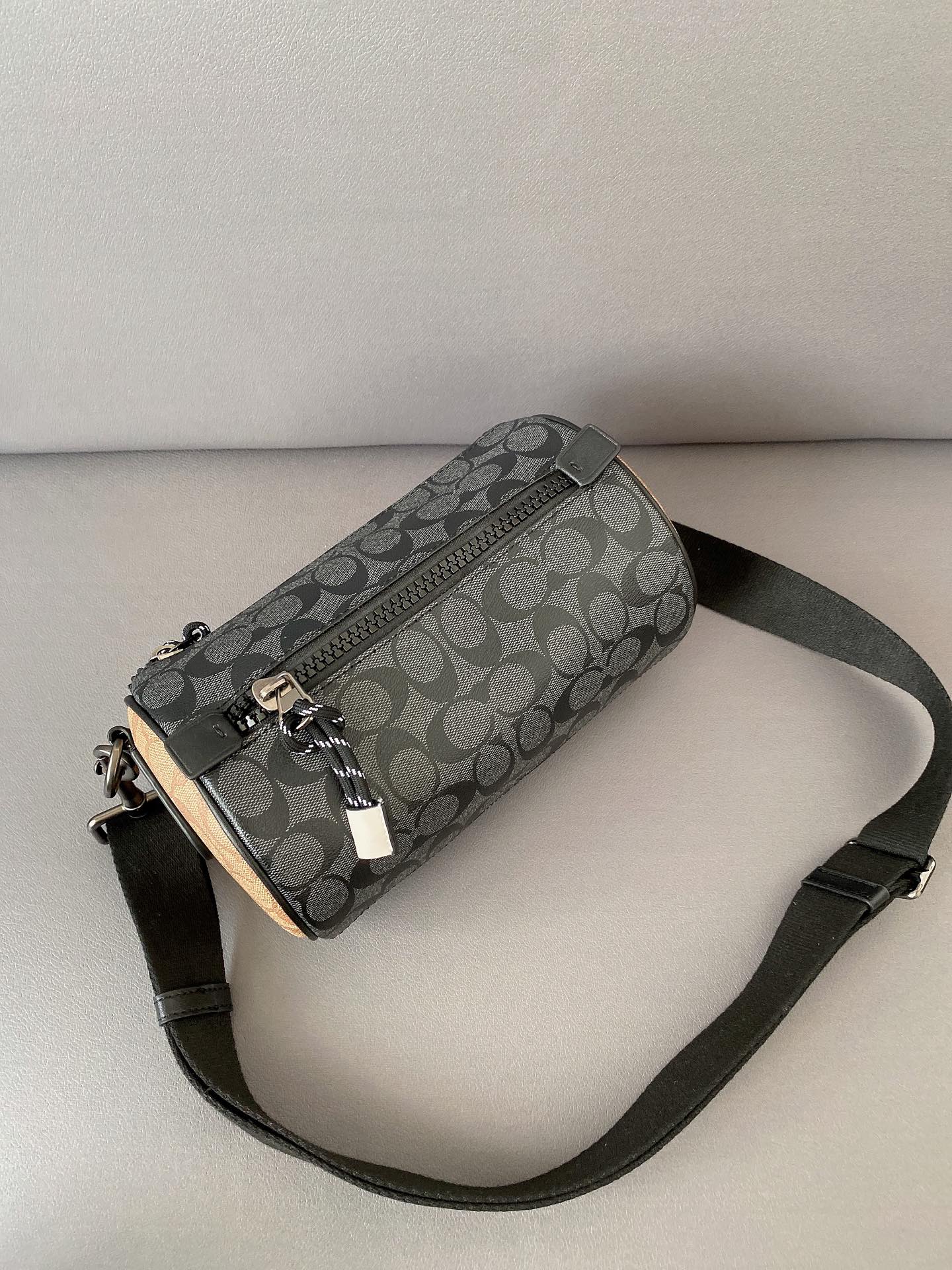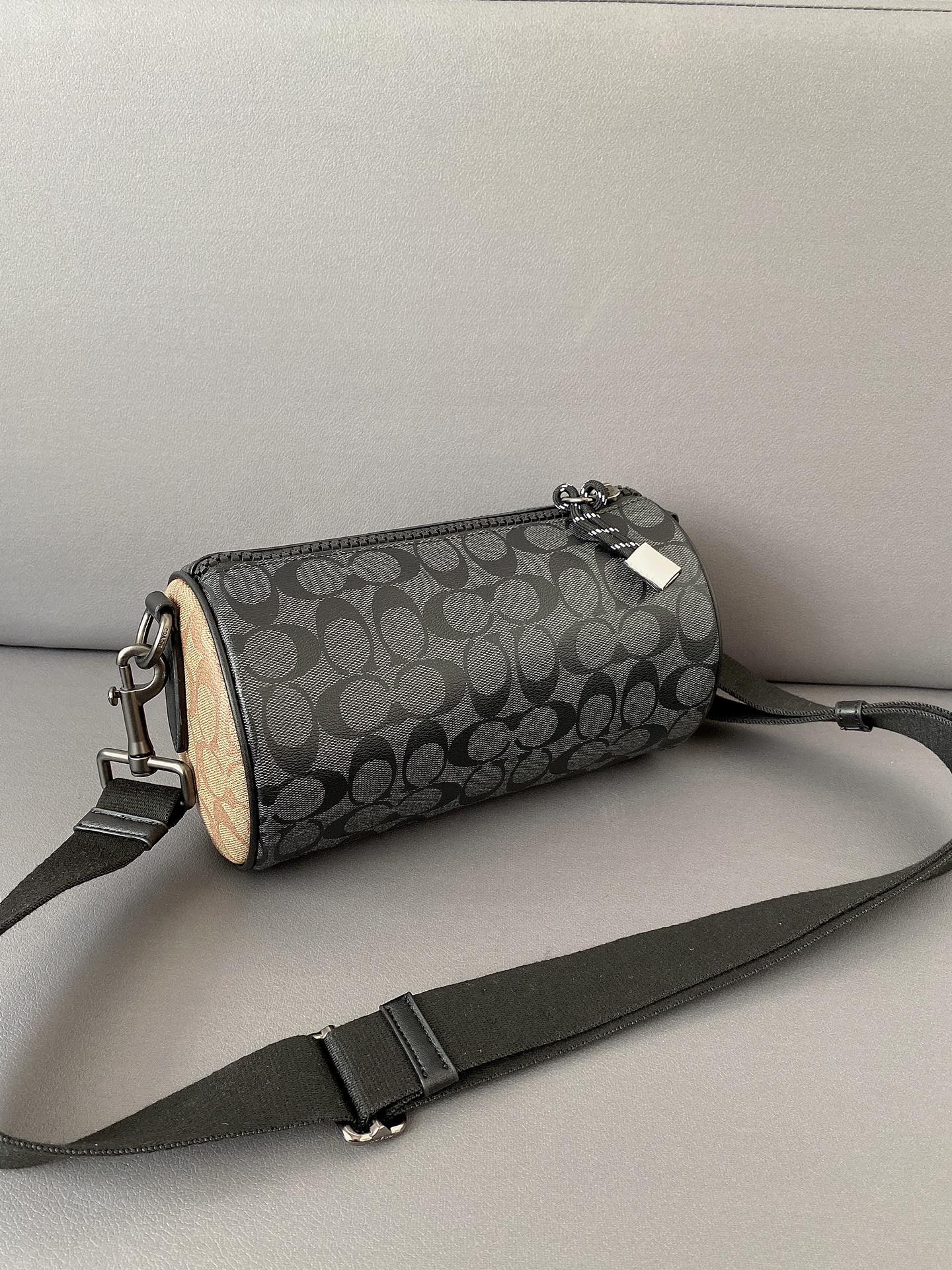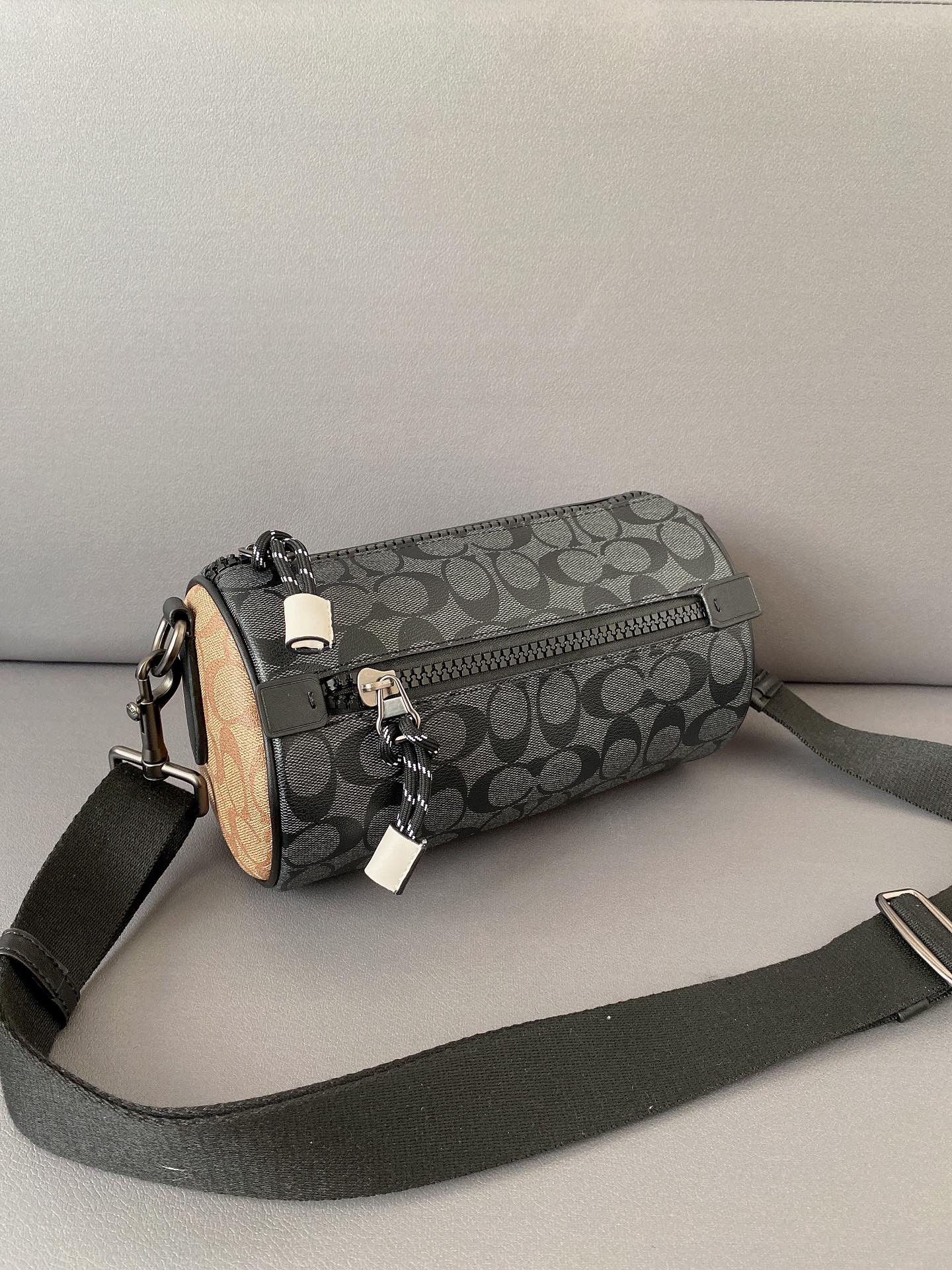 J5 Coach 蔻驰 Barrel 老花圆筒包 单肩包 男女通用斜挎包 经典Logo搭配原厂工艺材质 休闲百搭斜挎包 采用精湛镶嵌细工,实物拍摄 原厂原版面料 配送小票防尘袋 礼盒 13 x 23 cm。