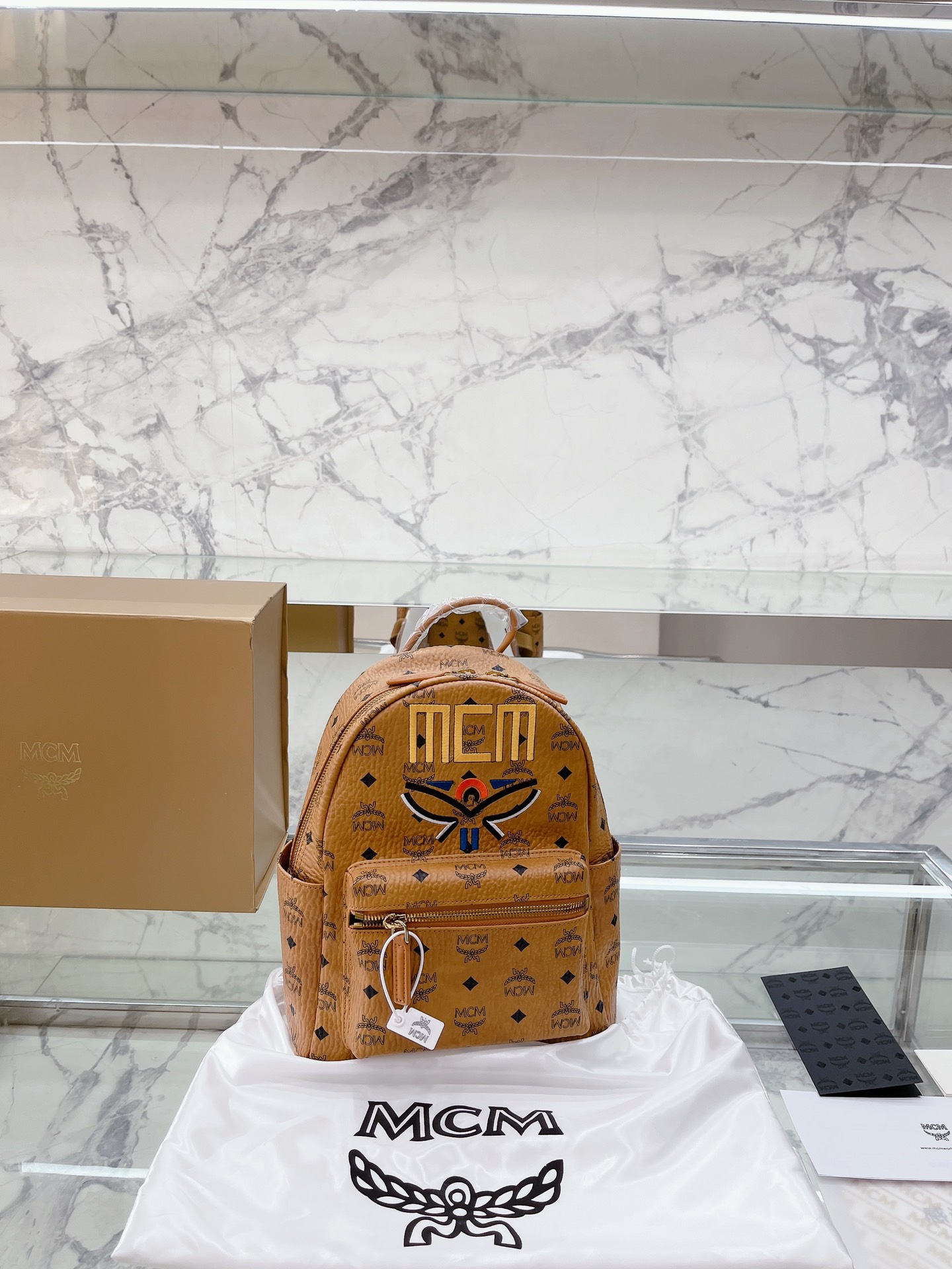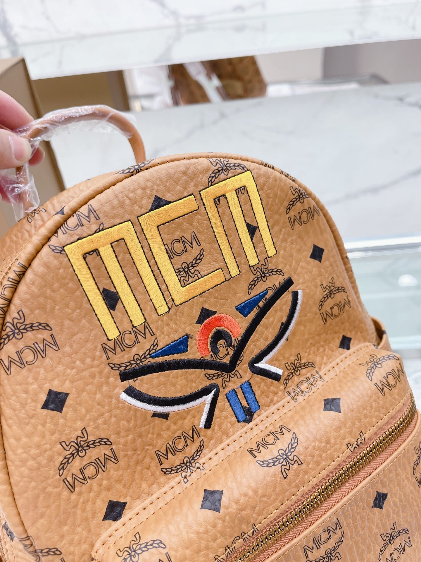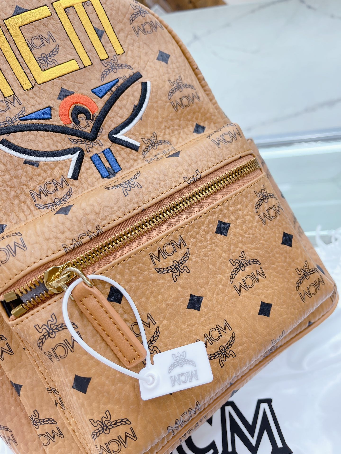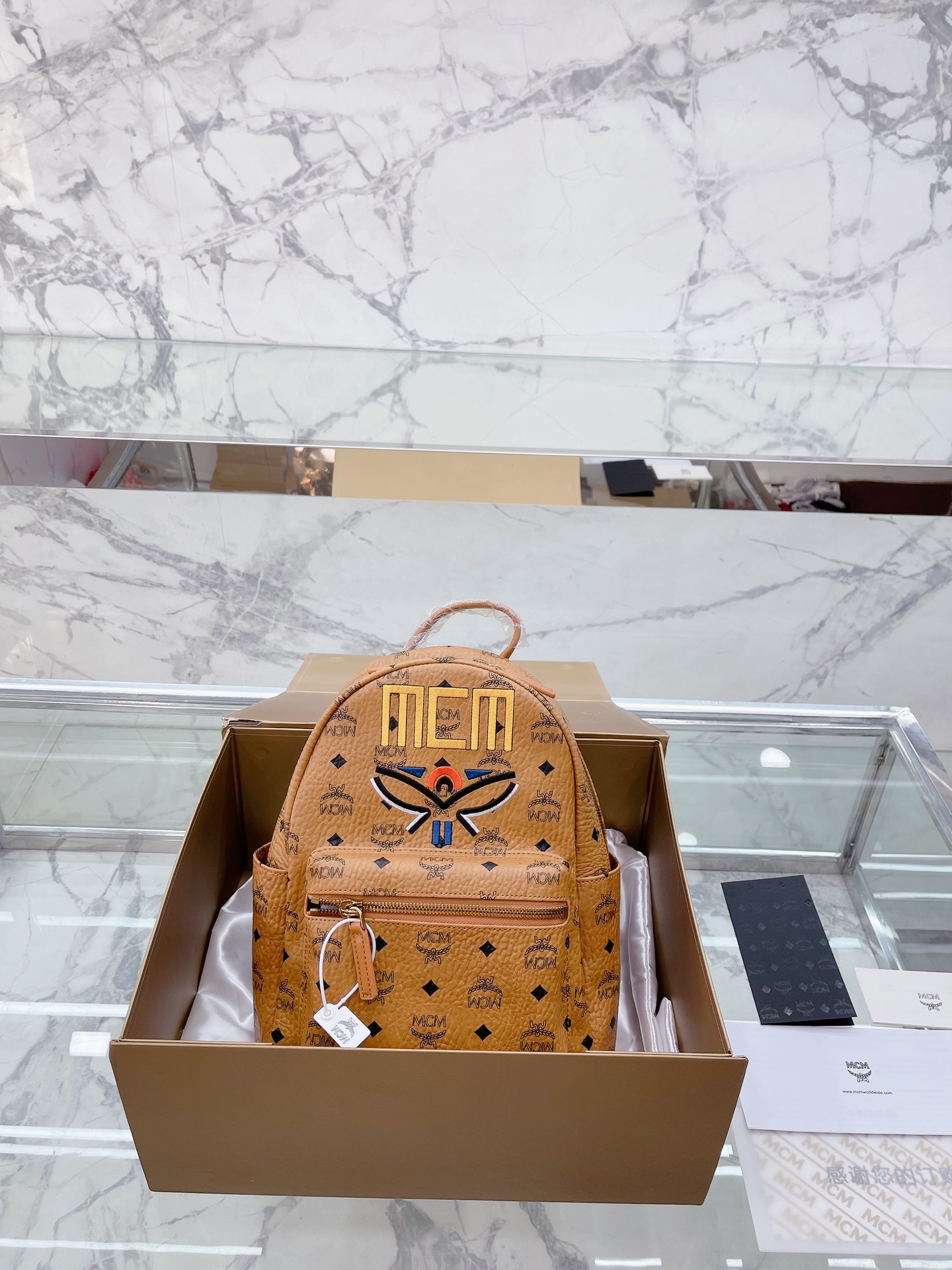 牛皮 全套礼盒包装 MCM STARK Visetos月桂叶刺绣女包双肩包背包 经典的MCM双肩包型 手工3D立体刺绣的 Logo和月桂叶图案,采用红黑蓝三 色设计,寓意天空大地和红花,体现品牌对保护地球 我和实现可持续化发展的不断探求。 结构化设计使其拥有宽敞的内部空间 尺寸大小:27 32cm
