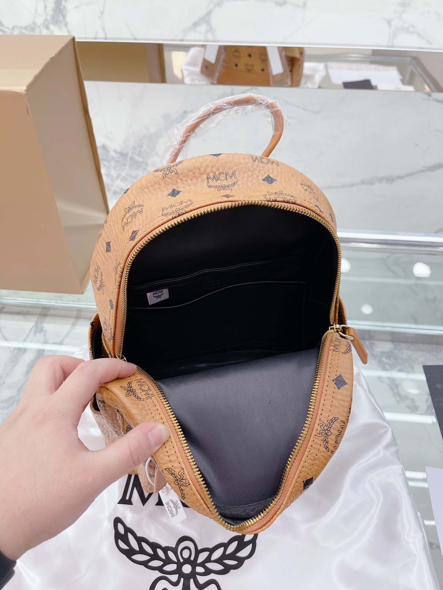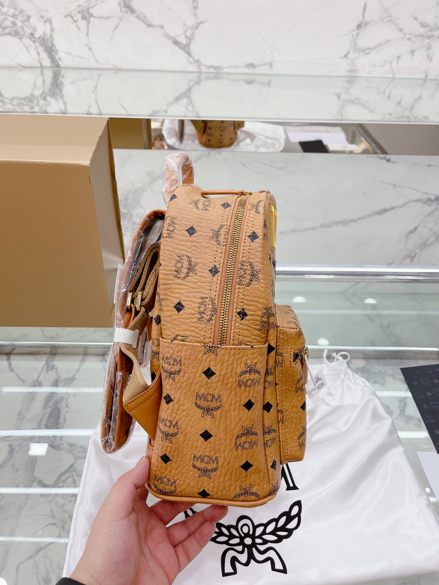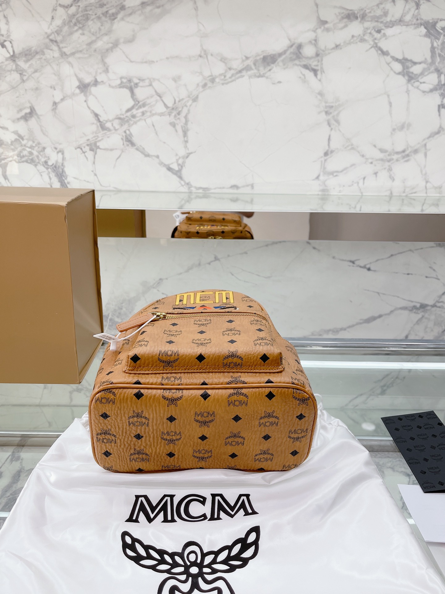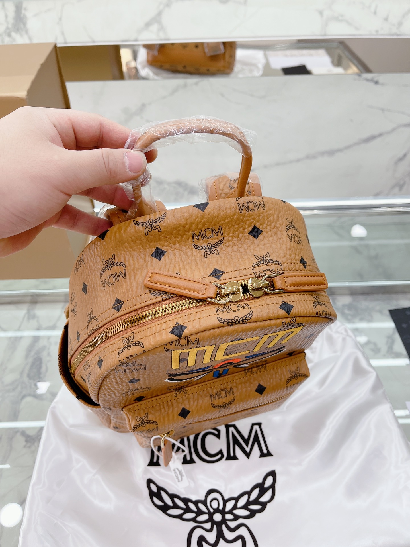 牛皮 全套礼盒包装 MCM STARK Visetos月桂叶刺绣女包双肩包背包 经典的MCM双肩包型 手工3D立体刺绣的 Logo和月桂叶图案,采用红黑蓝三 色设计,寓意天空大地和红花,体现品牌对保护地球 我和实现可持续化发展的不断探求。 结构化设计使其拥有宽敞的内部空间 尺寸大小:27 32cm