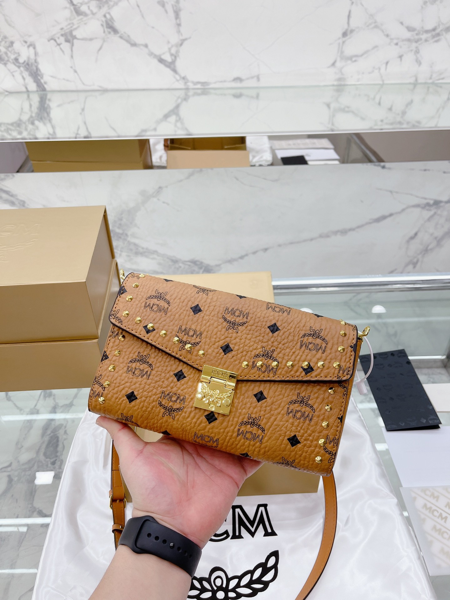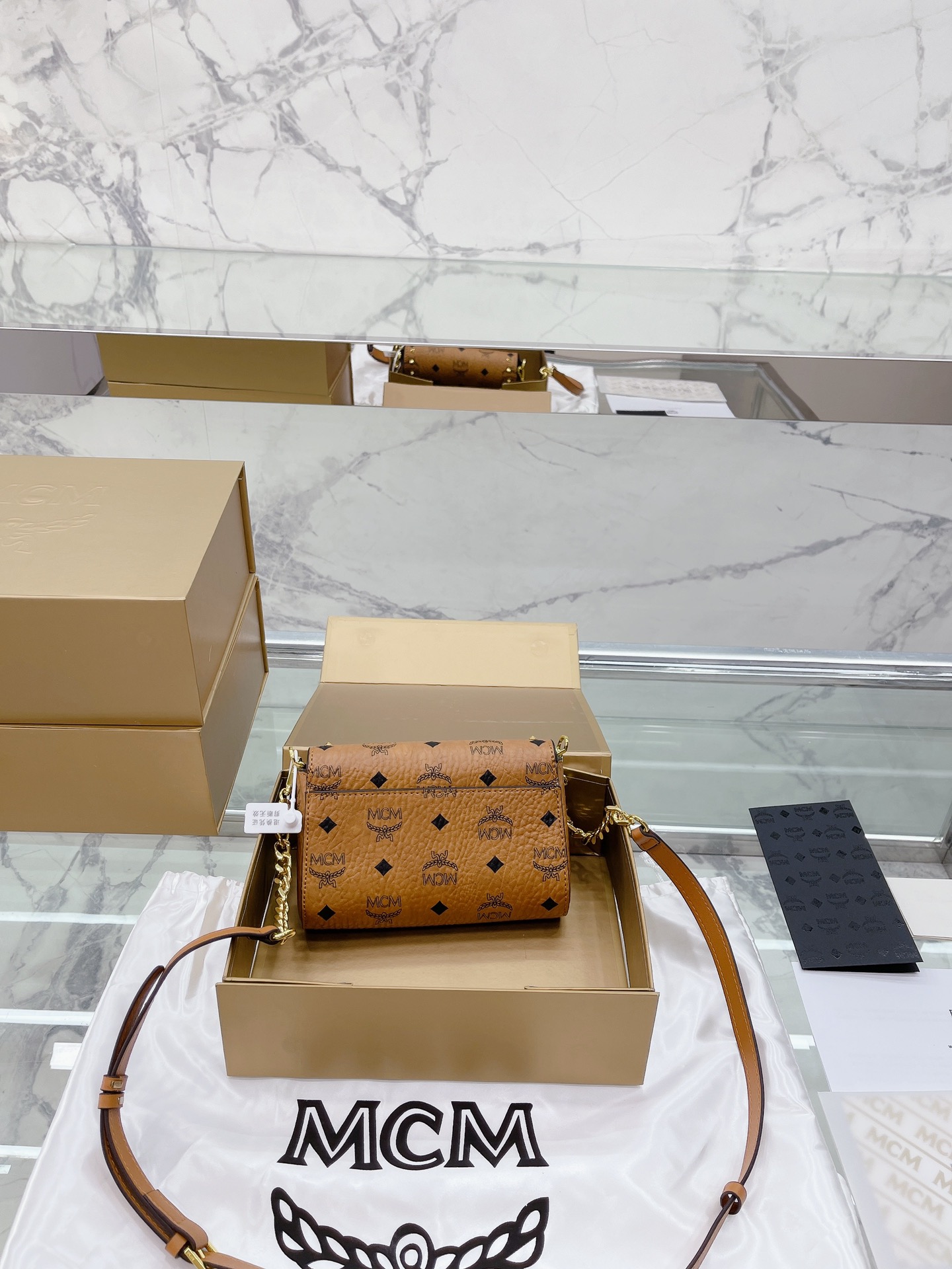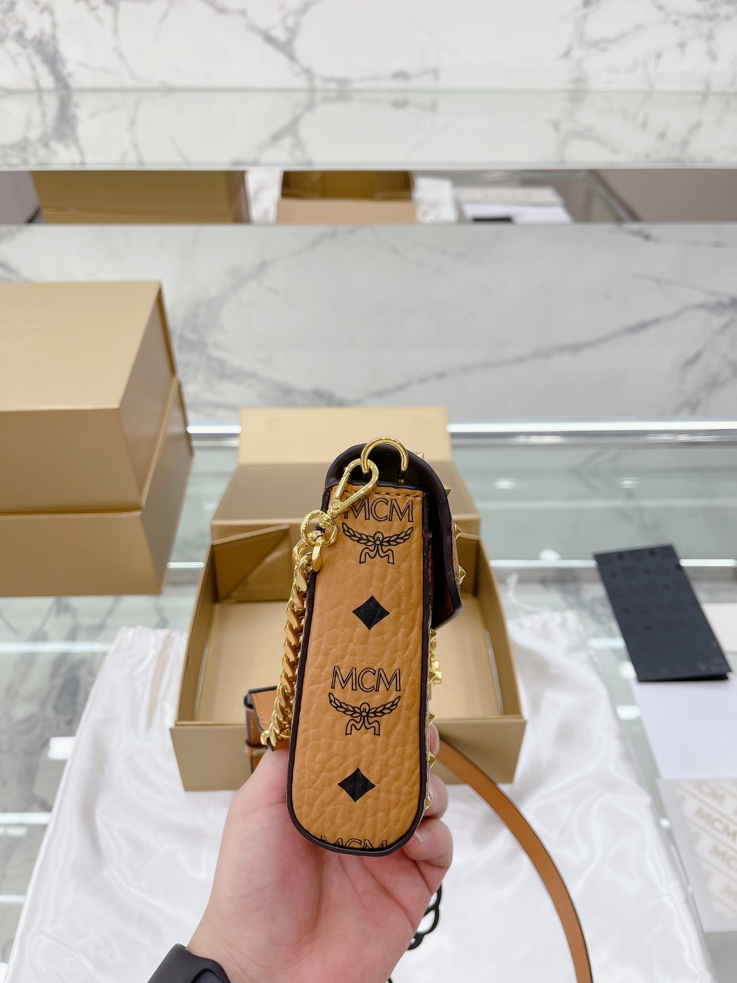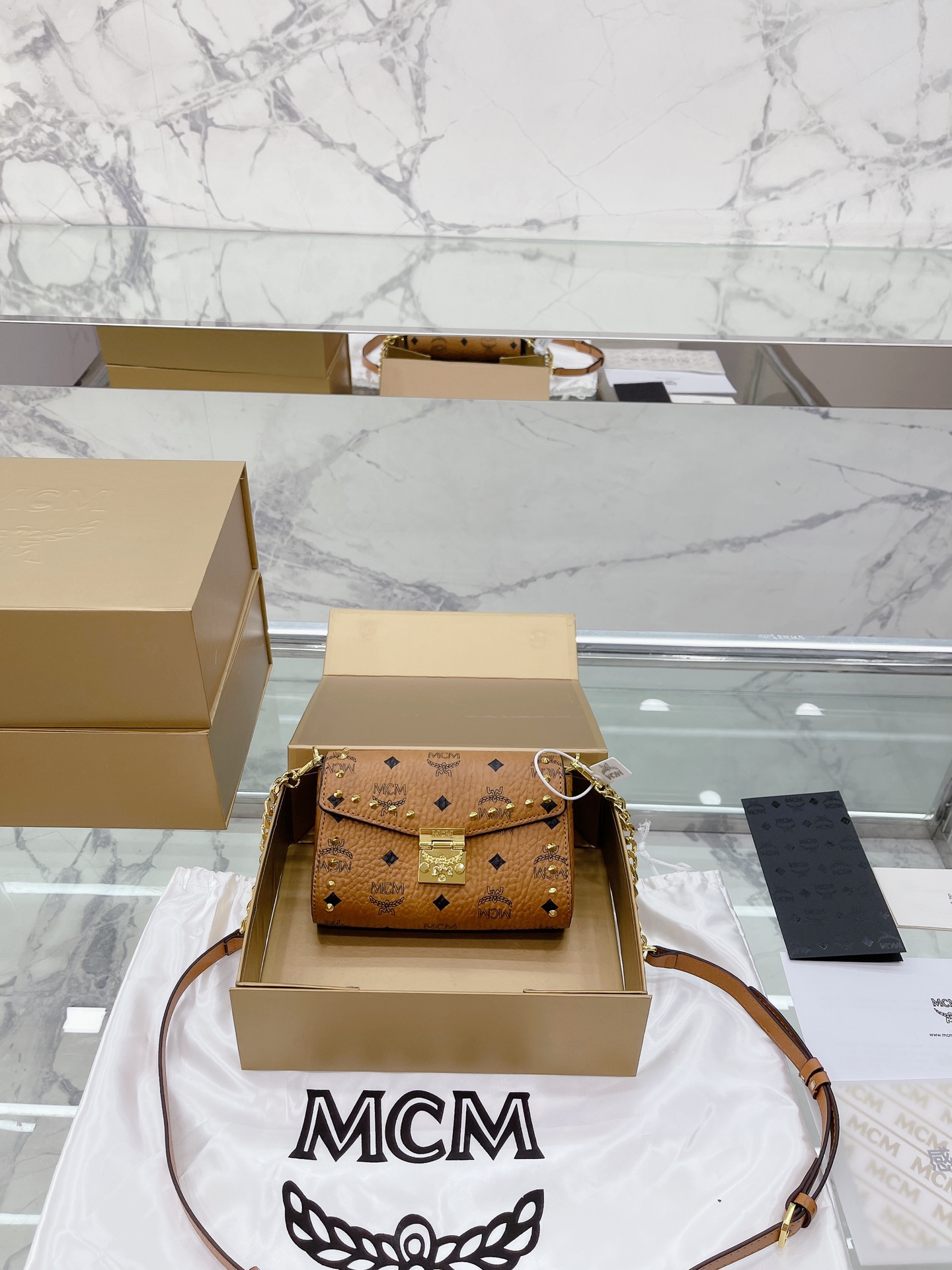 铆钉 |免税店包装 礼盒 Mcm 原单茶金 链条信封包 单肩包 ,折叠翻盖钱包,采用涂层帆布制成,风琴式隔层,内部零钱袋 ,现金夹层及多个卡槽,外面镶有月桂锁扣。搭配可拆卸式链条,可以手拿,也可以肩挎尺寸: 大号23 14cm 小号18 12cm