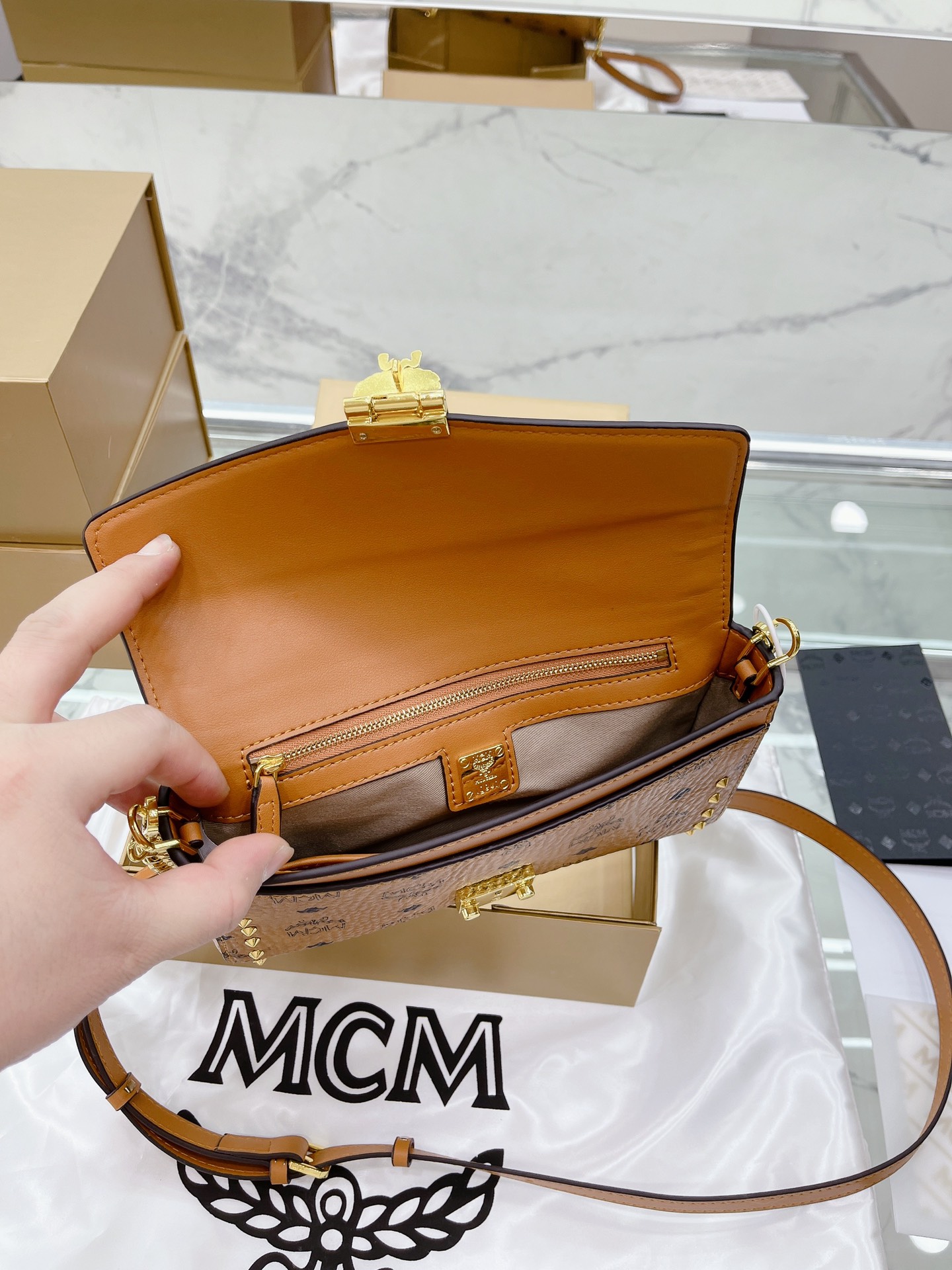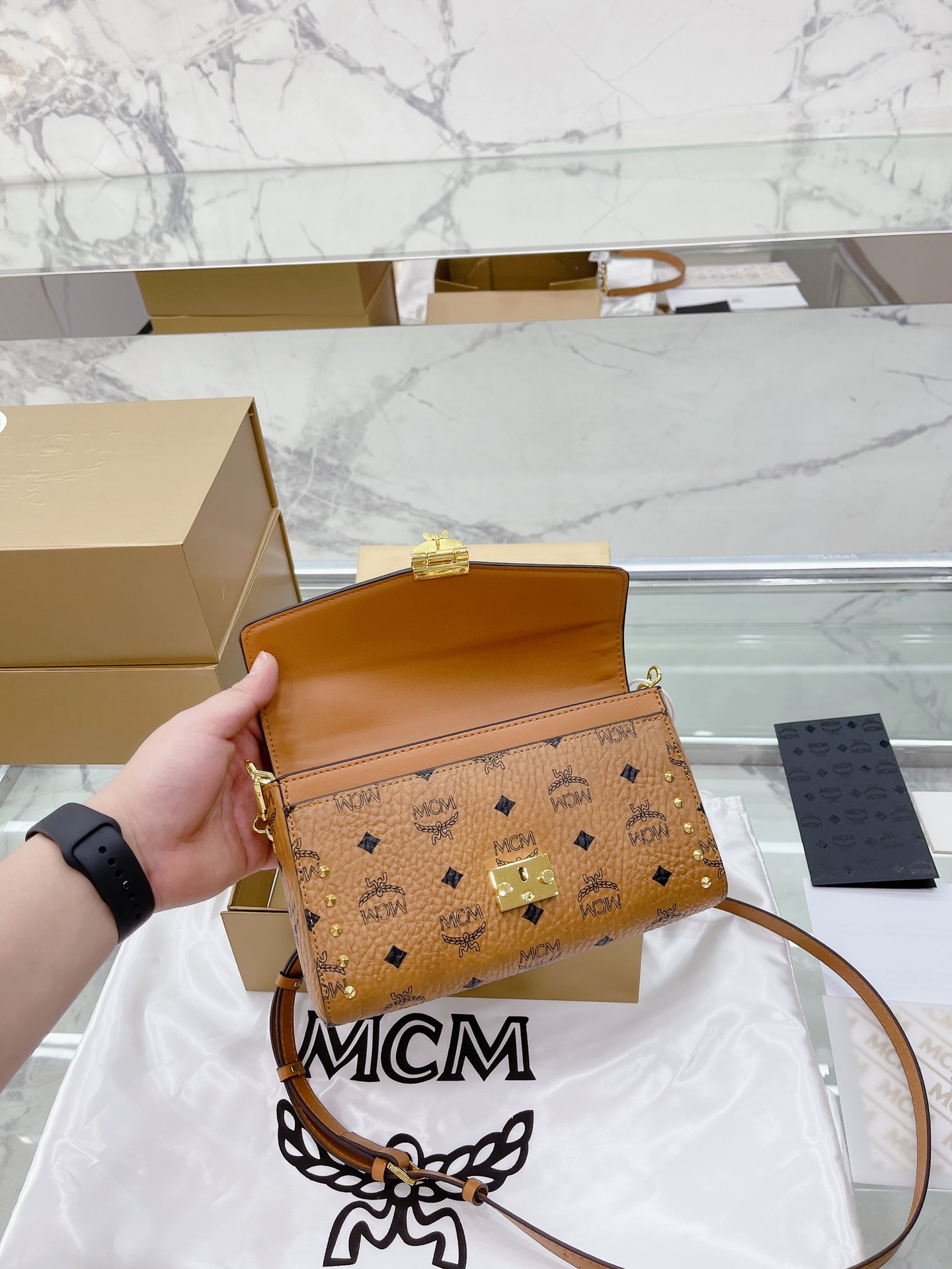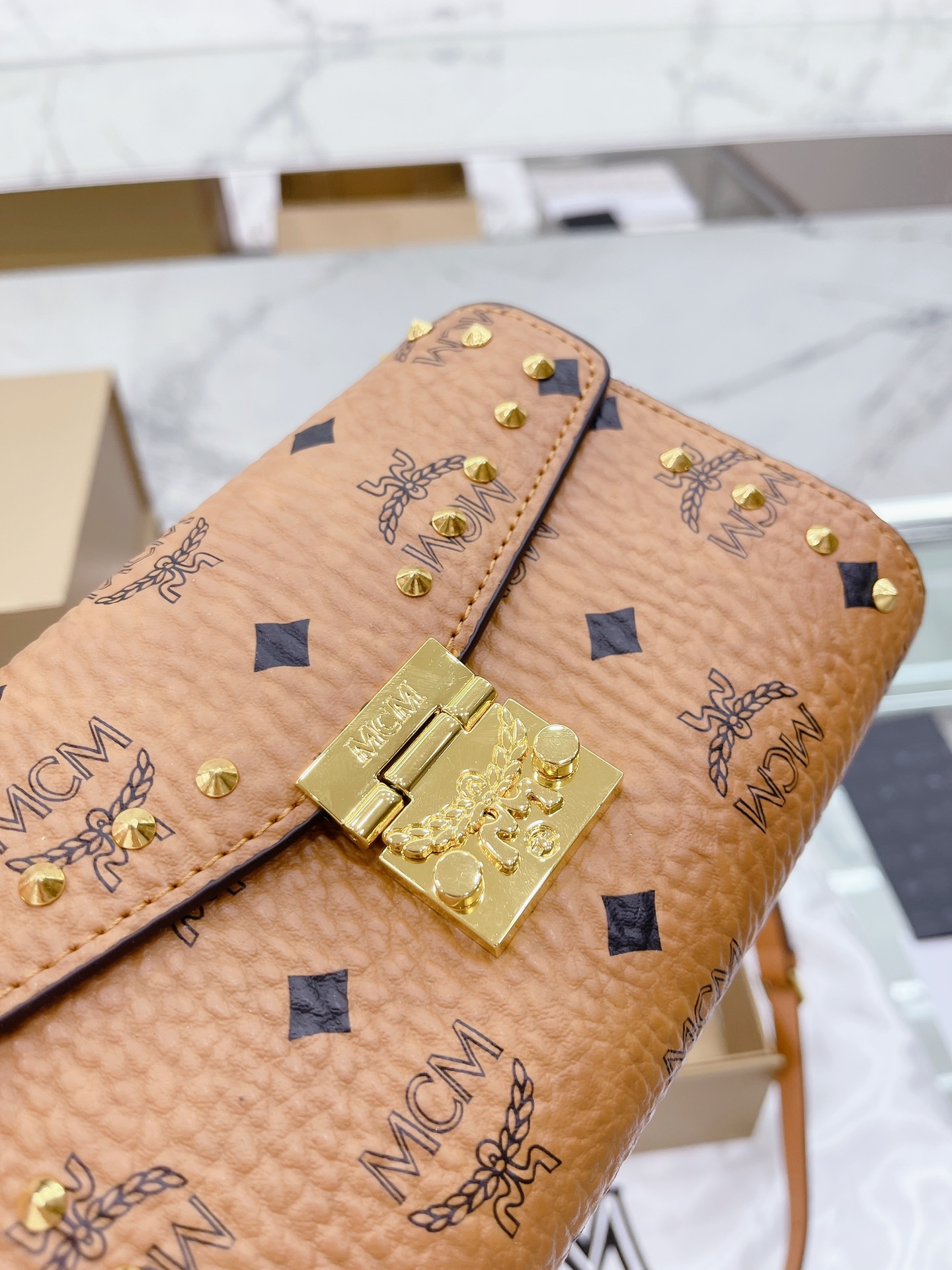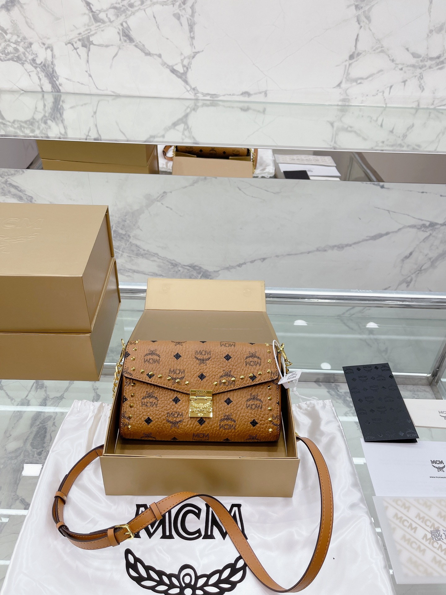 铆钉 |免税店包装 礼盒 Mcm 原单茶金 链条信封包 单肩包 ,折叠翻盖钱包,采用涂层帆布制成,风琴式隔层,内部零钱袋 ,现金夹层及多个卡槽,外面镶有月桂锁扣。搭配可拆卸式链条,可以手拿,也可以肩挎尺寸: 大号23 14cm 小号18 12cm