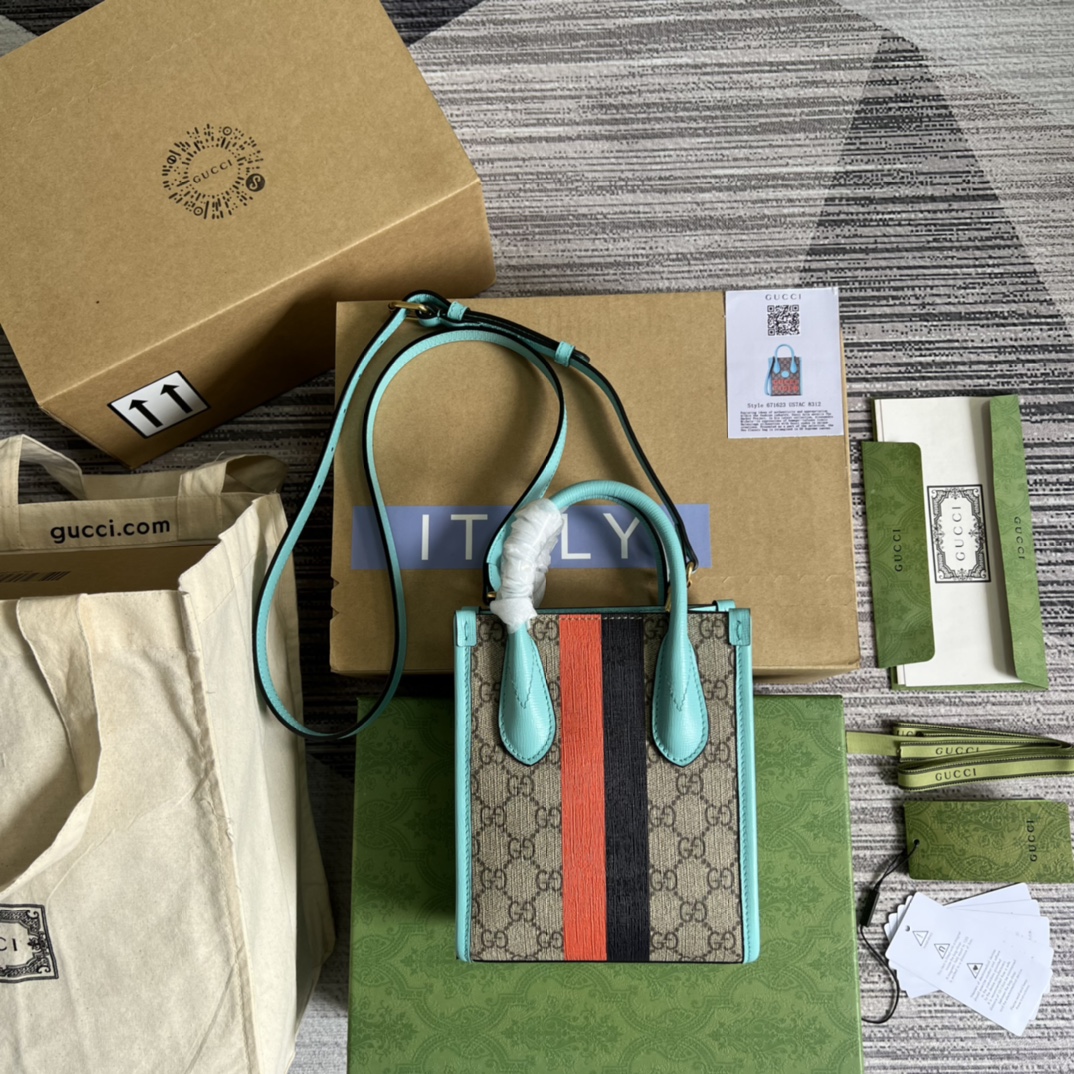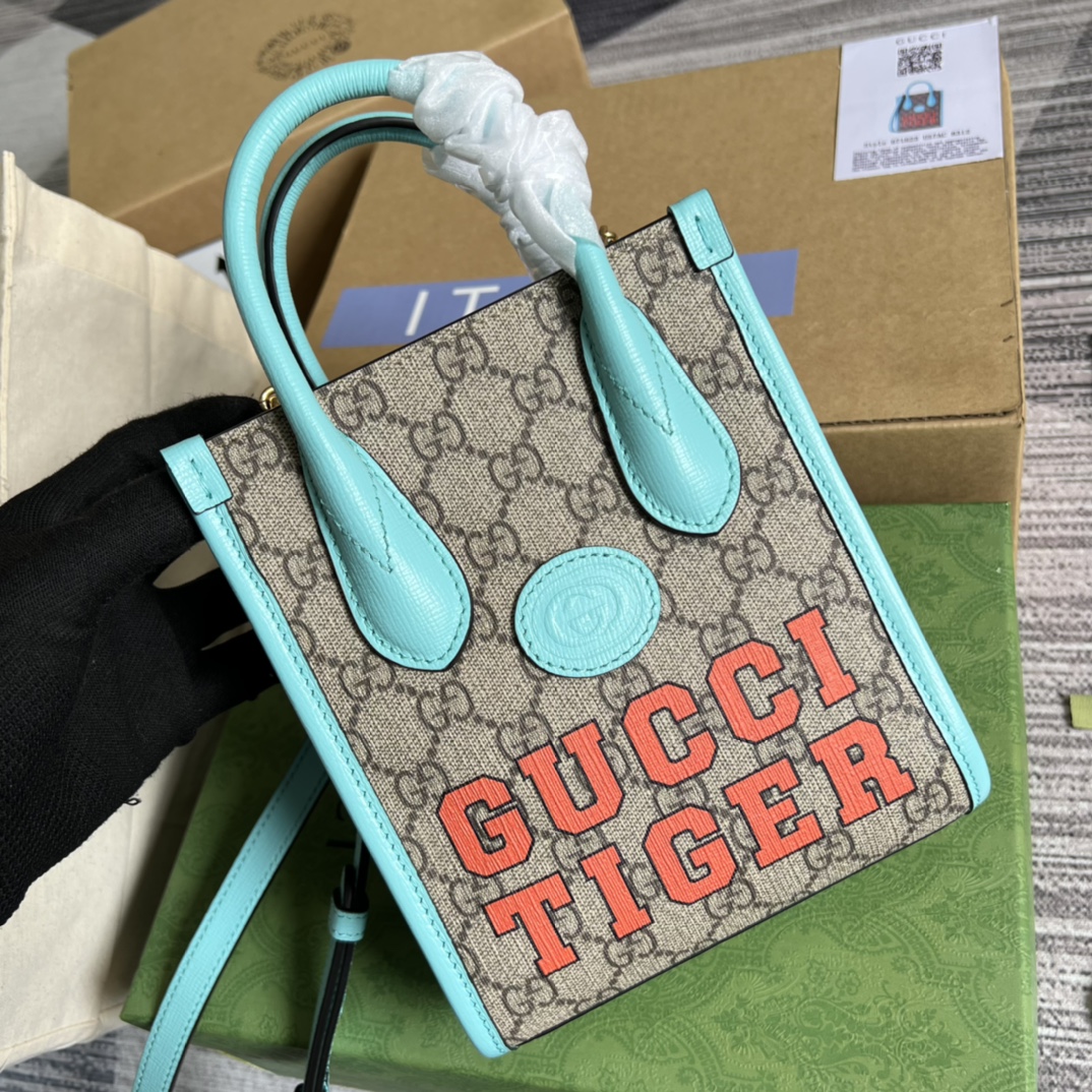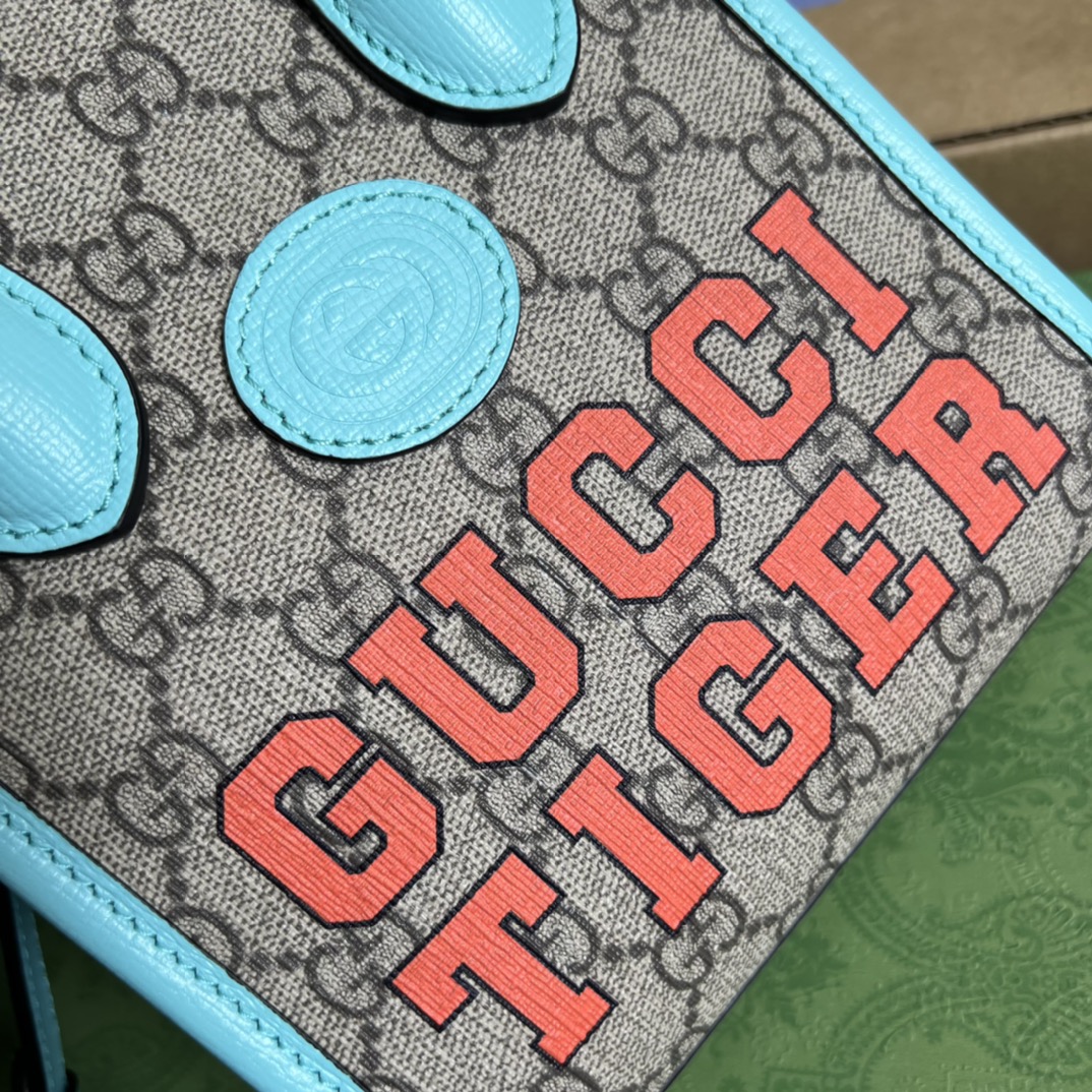 全套专柜绿色包装中国新年系列迷你托特包为庆祝虎年新年的到来,Gucci对GG Su隐藏 详细信息 米色和乌木色GG Su棕色皮革细节 红色“Gucci Tiger”印花 红绿条纹细节 棉麻衬里 互扣式双G椭圆形皮革标牌 内部:1个卡片隔层 提手高7厘米 可拆卸肩带高56厘米 16厘米宽x 20厘米高x 7厘米深 重量:约0.435千克 型号:671623。