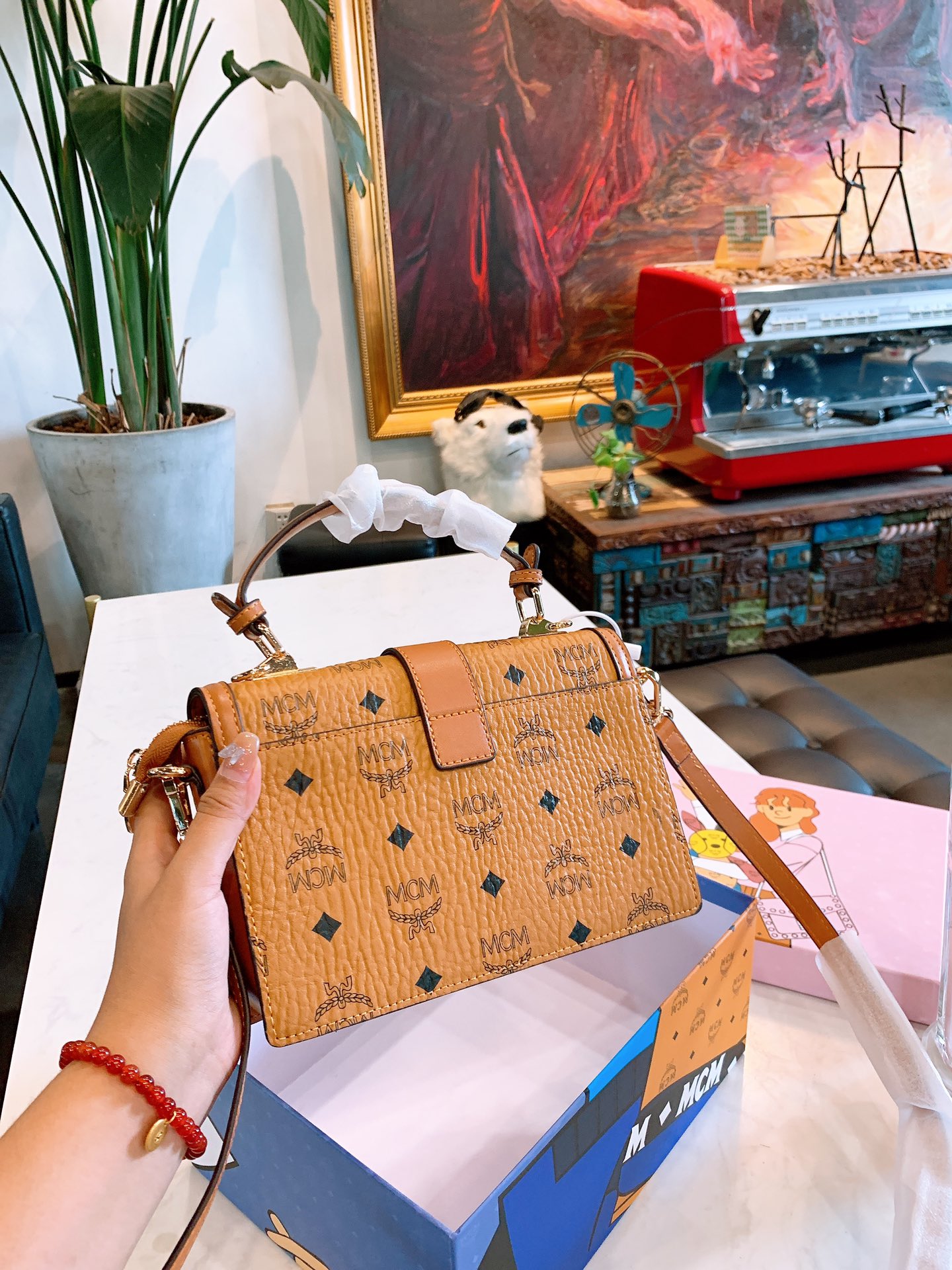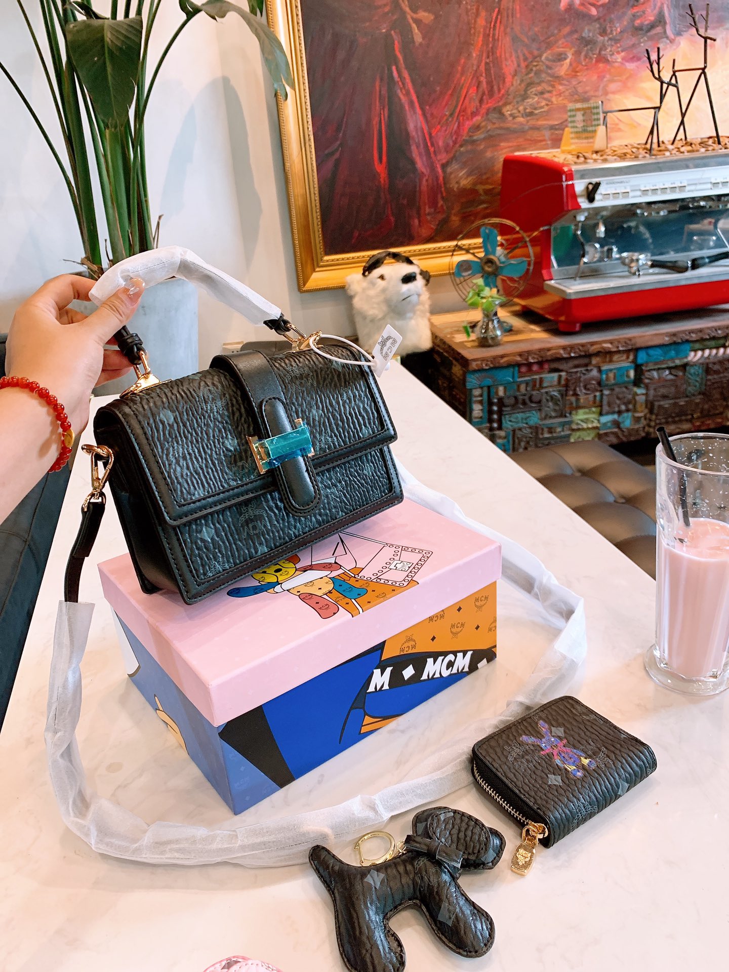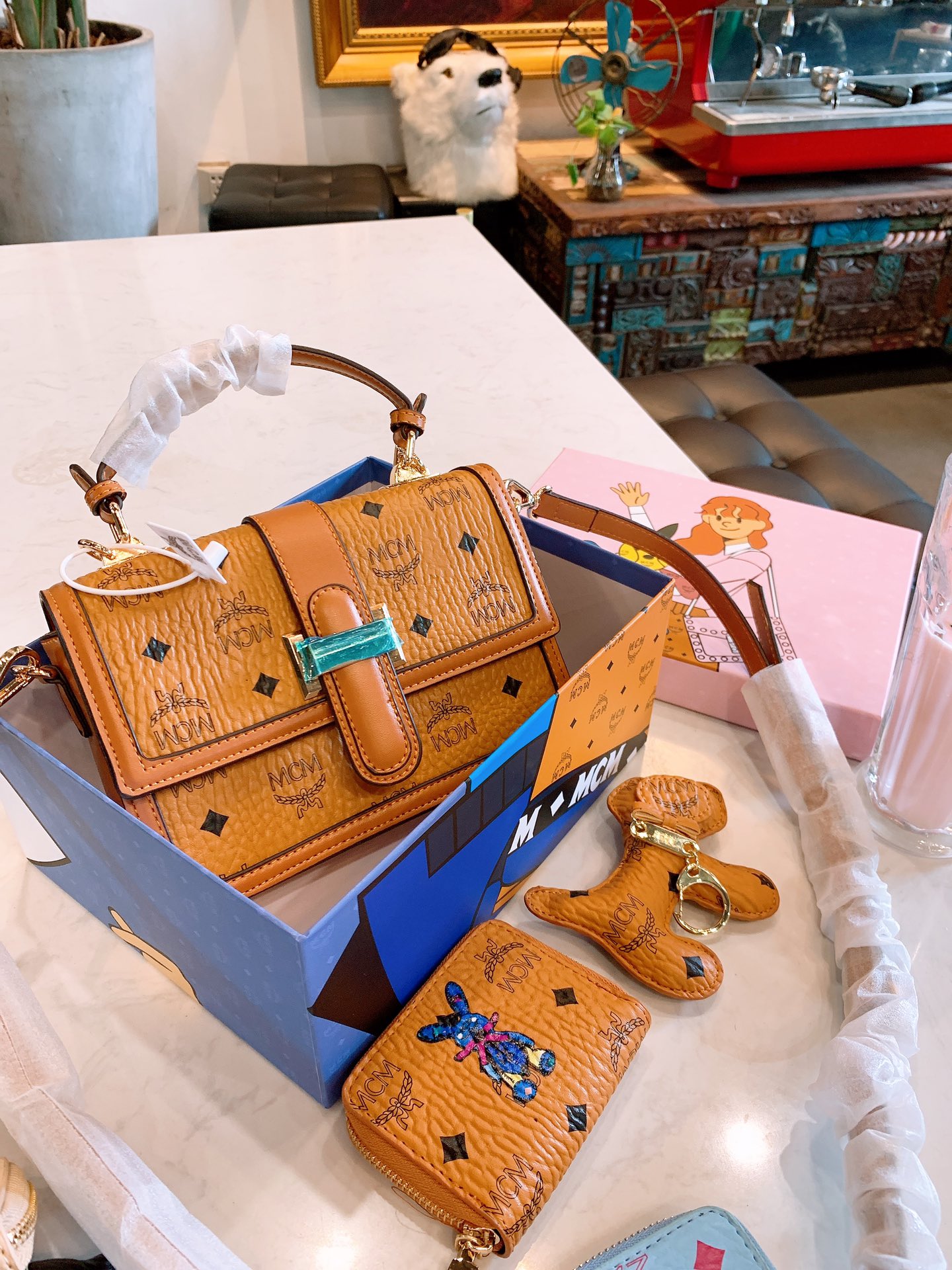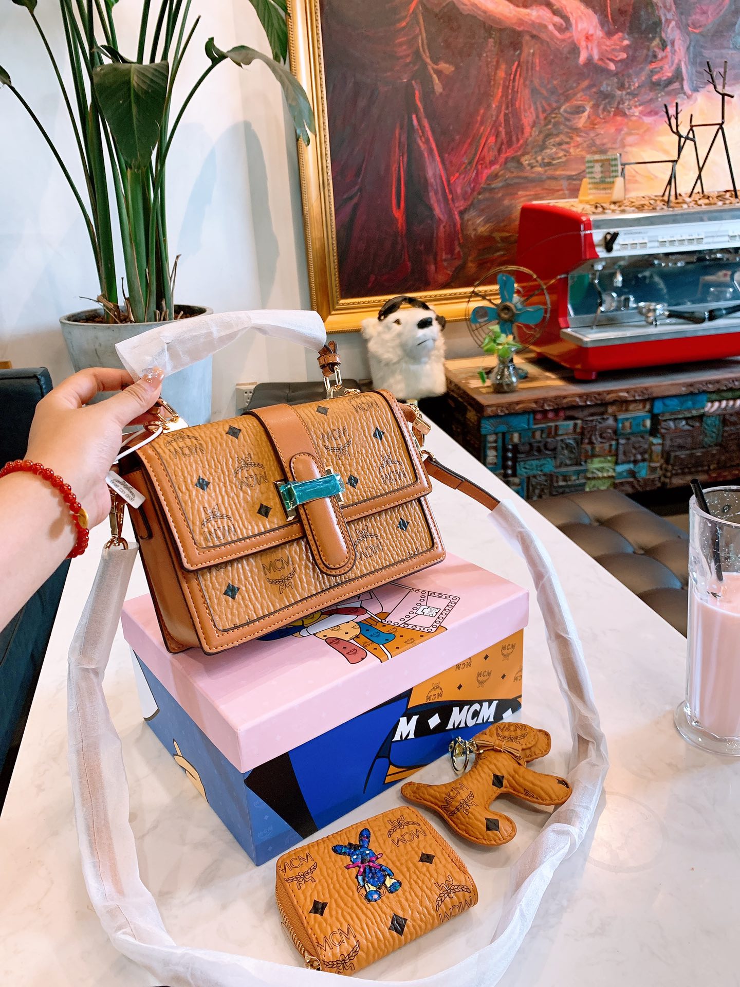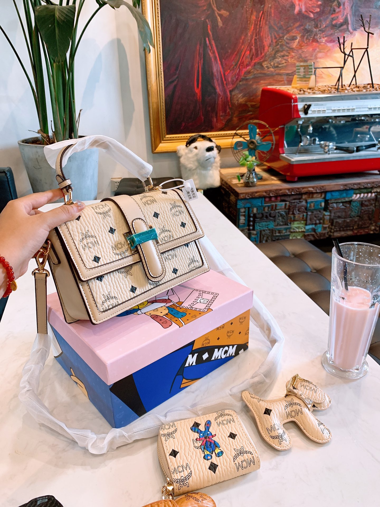 J5 220 mcm邮差包手提包三件套配送小狗挂件钱包mcm中古包,最近mcm中古包款式可以说的不能再了,大小非常合适呦造型也很特别,肩带质感很舒服,不会勒肩,颜值与实用兼备尺寸:22cm配礼盒编码202045