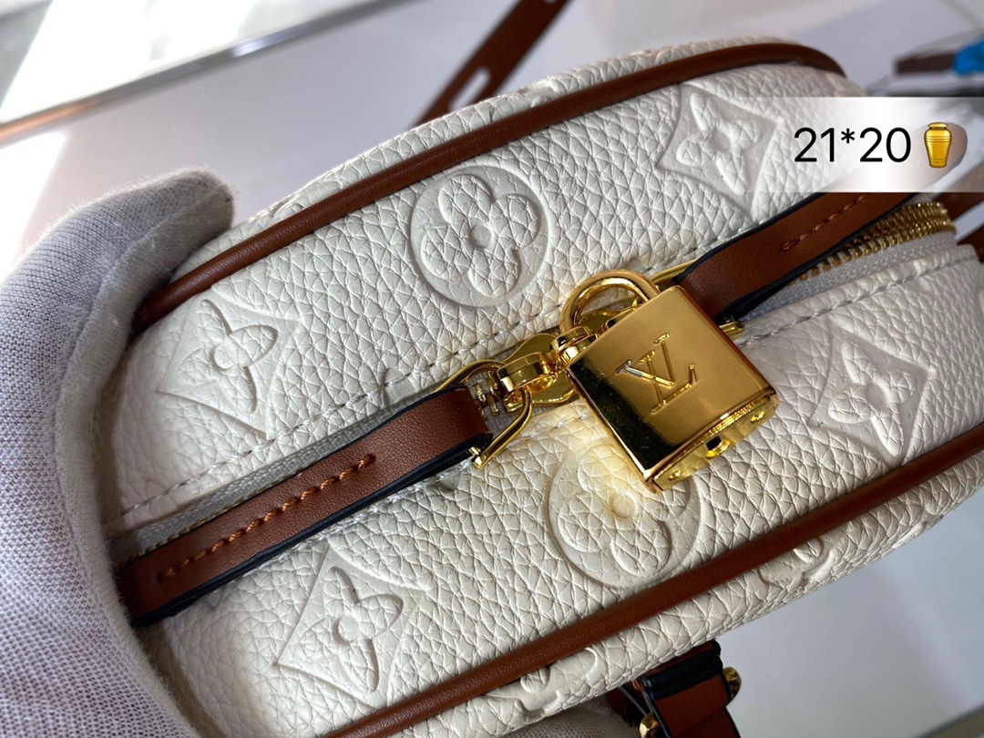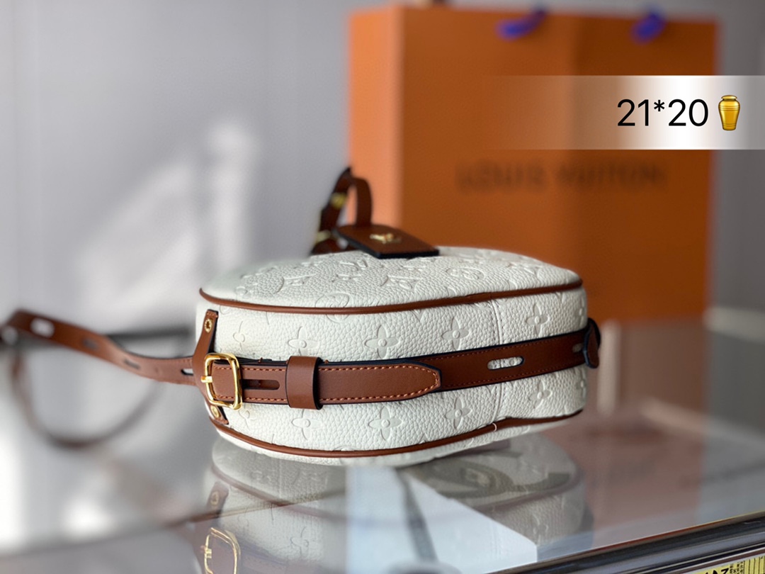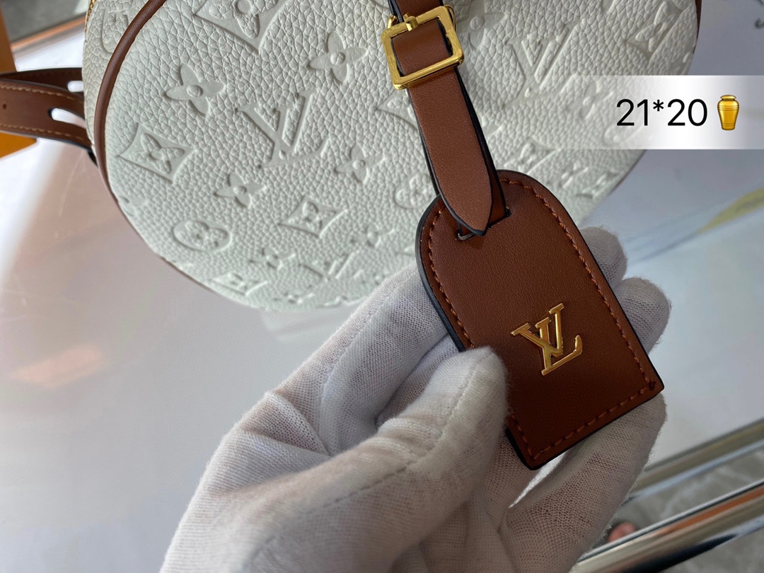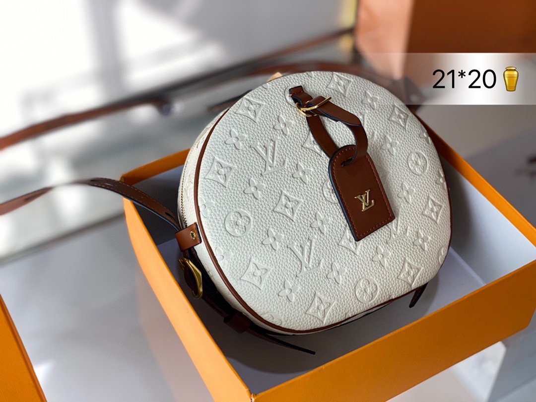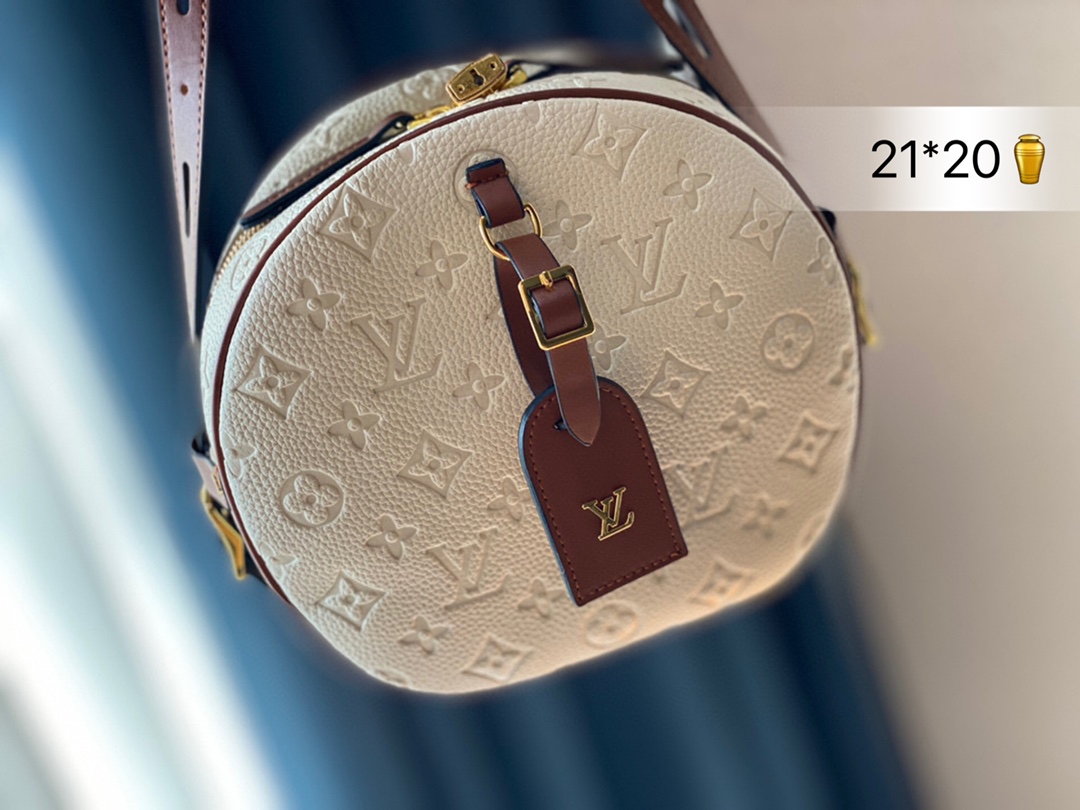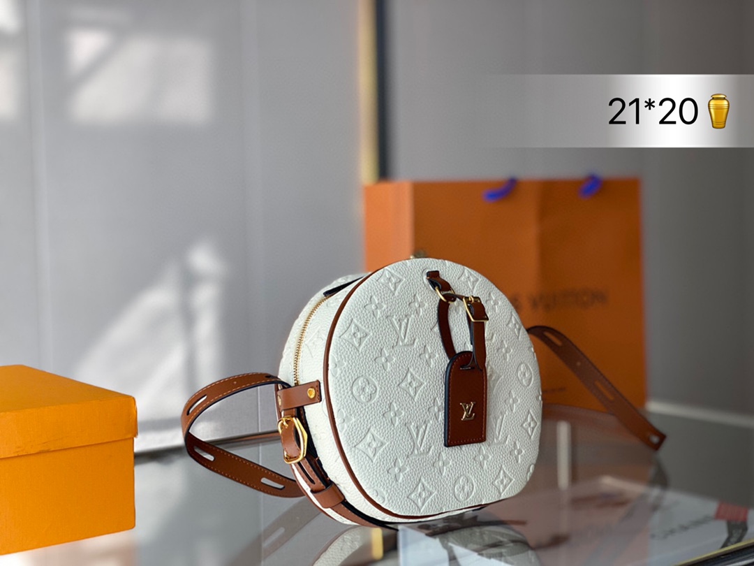 J5 Louis Vuitton 路易威登 LV 小苹果包 圆饼包经典的路易*威登帽盒摇身变为此款风格可爱的随身小袋。小巧而实用 双版本设计:经典Monogram帆布搭配牛皮饰边;新潮的Reverse Monogram帆布搭配饰边。配小挂件 尺寸:大号21*20cm
