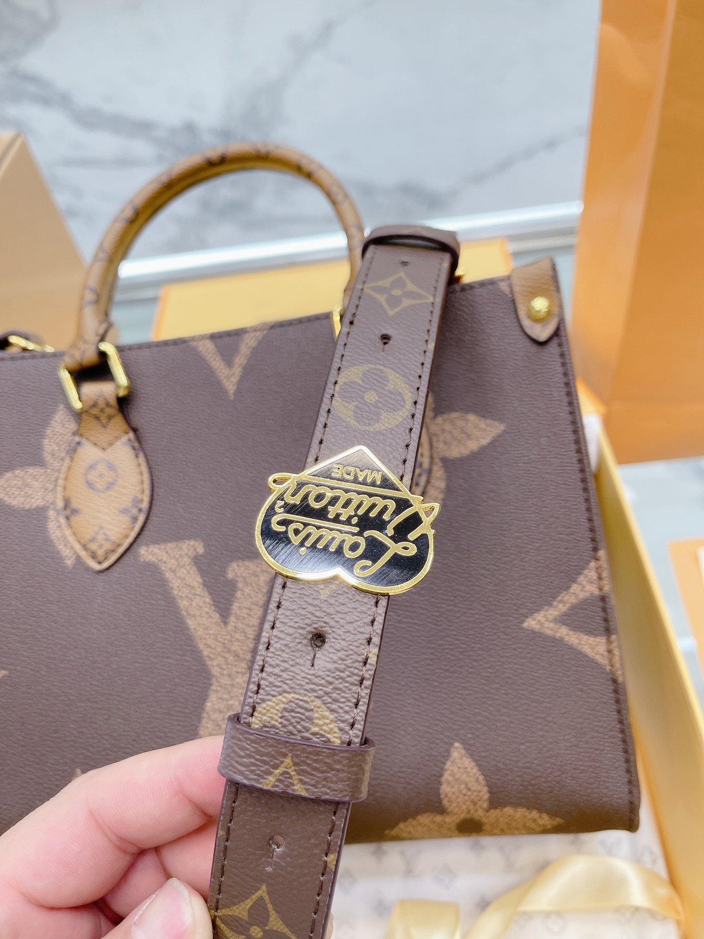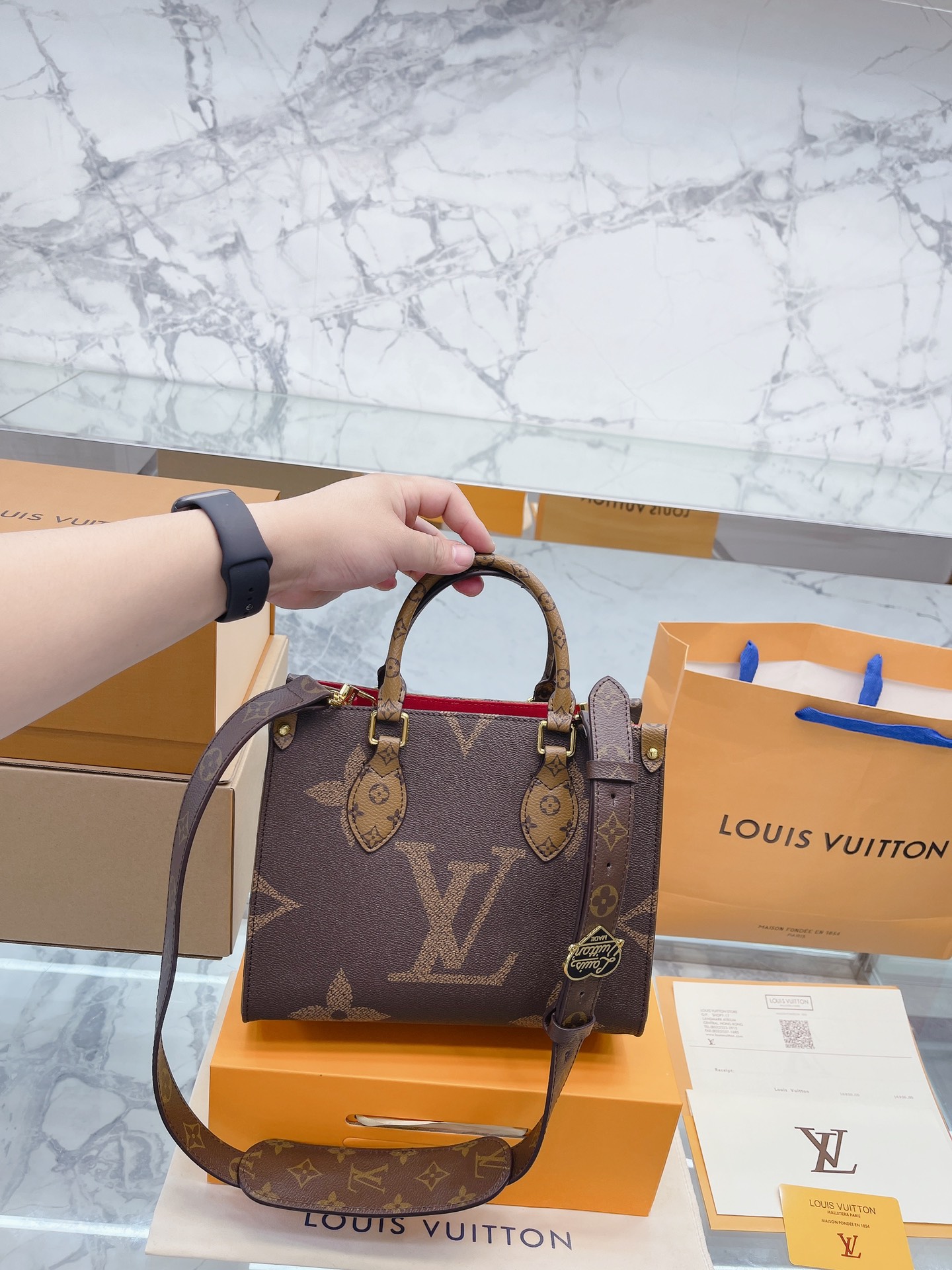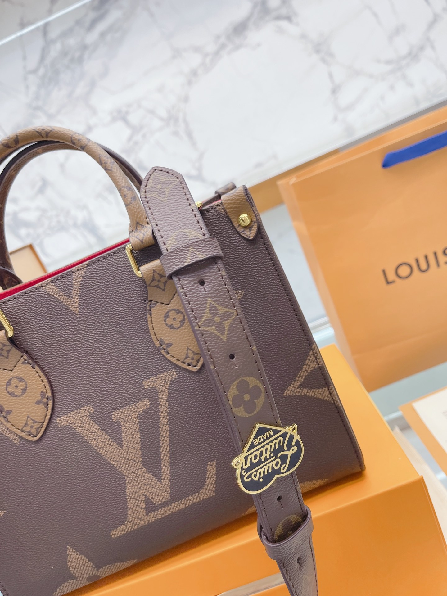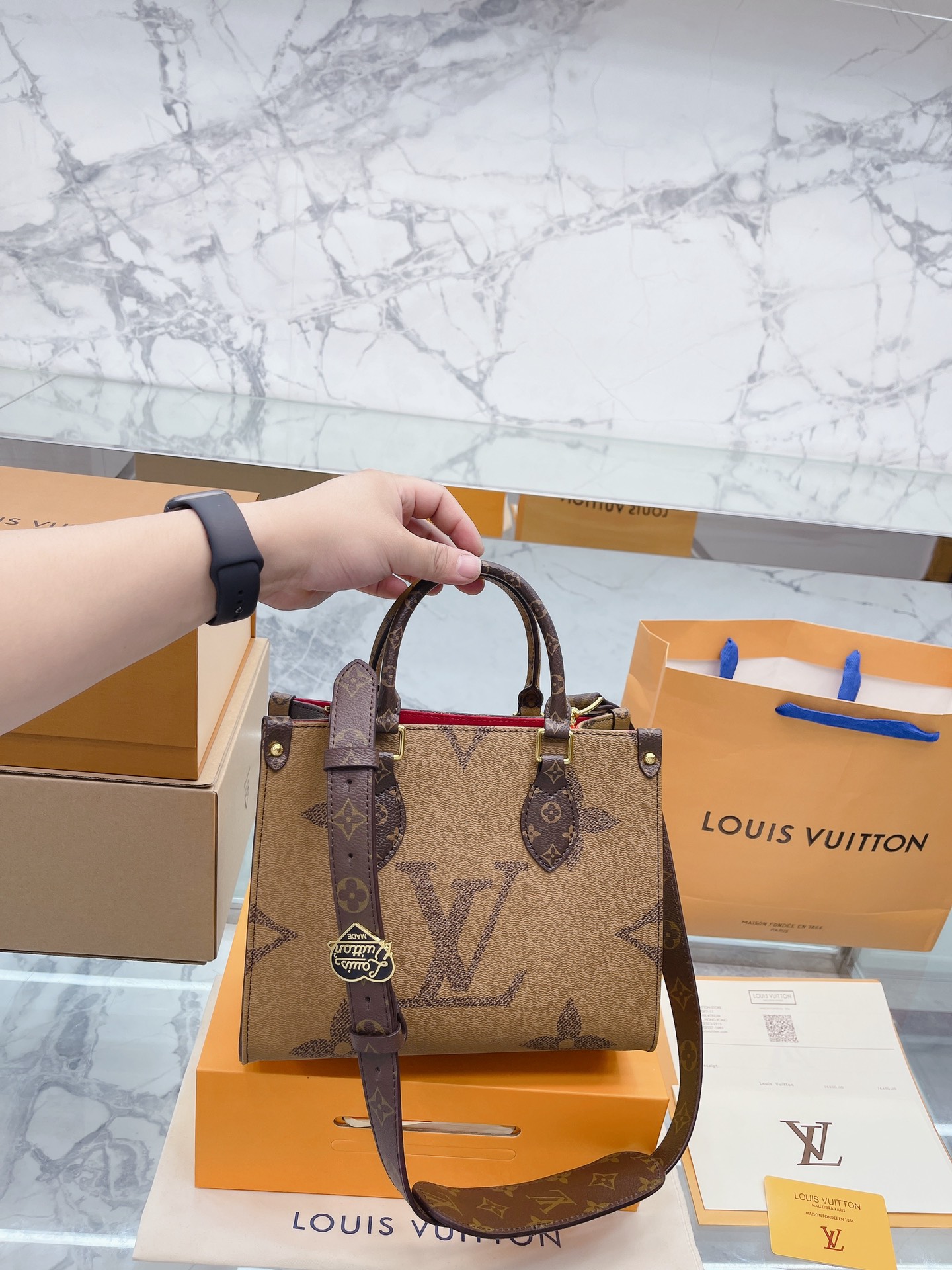K0 升级款 高品质 Louis Vuitton 路易威登 LV onthego妈咪袋 性价比之王这是一款超赞的包型,灵感来自于恶搞 Louis Vuitton 路易威登 LV 的街头品牌,曾经的曾经,Louis Vll litton永远不会走下神坛,1:1品质 非常值得入的一季,超大购物袋,不容易变形 而且大Logo的设计超级好看。除了手拎以外,还非常贴心的加了中长的肩挎的肩带,可以说是非常赞了,对花品质 秒杀市场一切低端货 上身真的很有气质尺寸25 20cm 全套包装