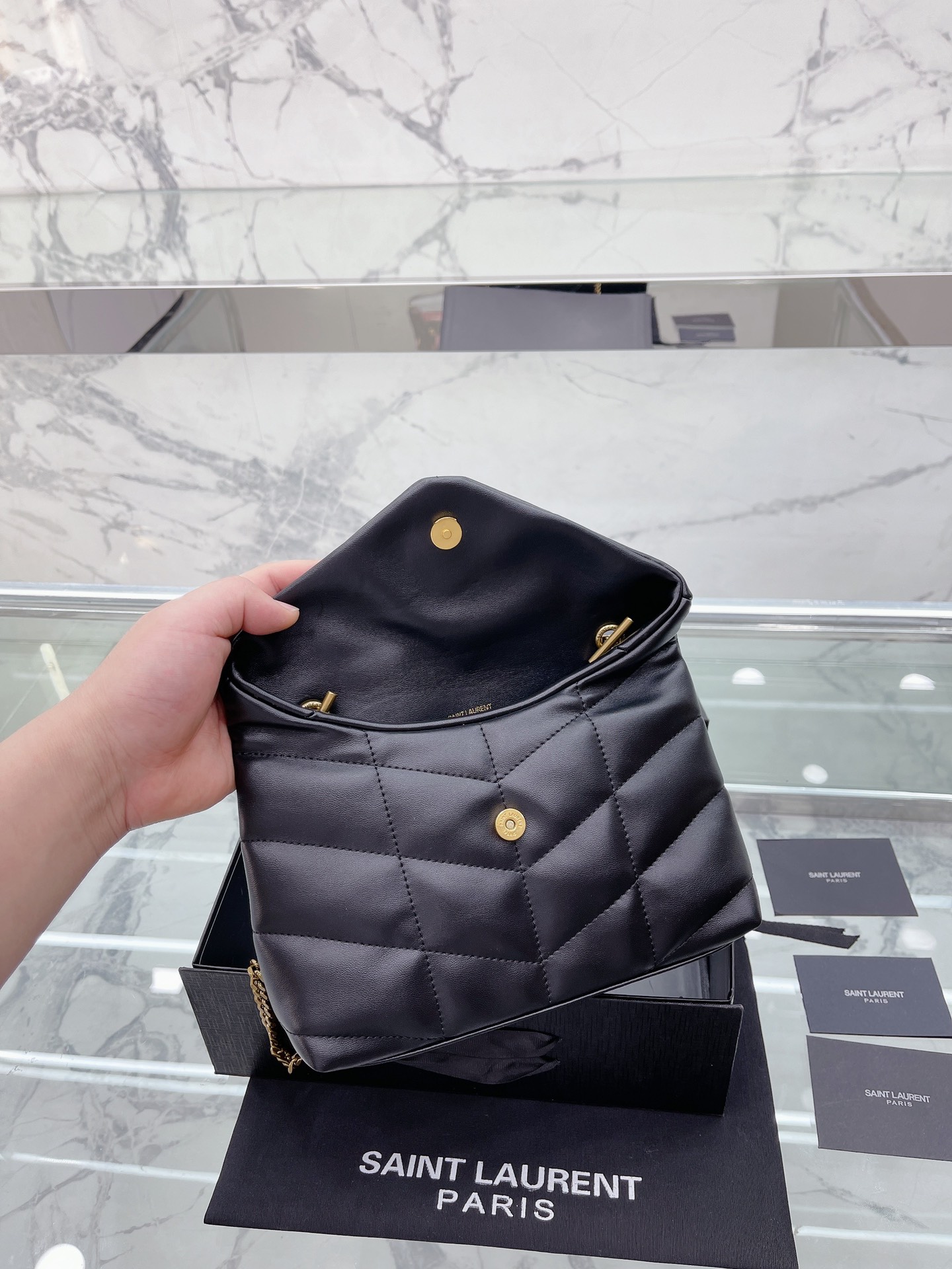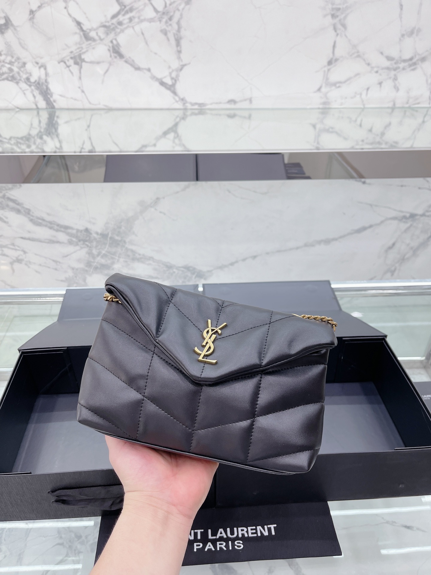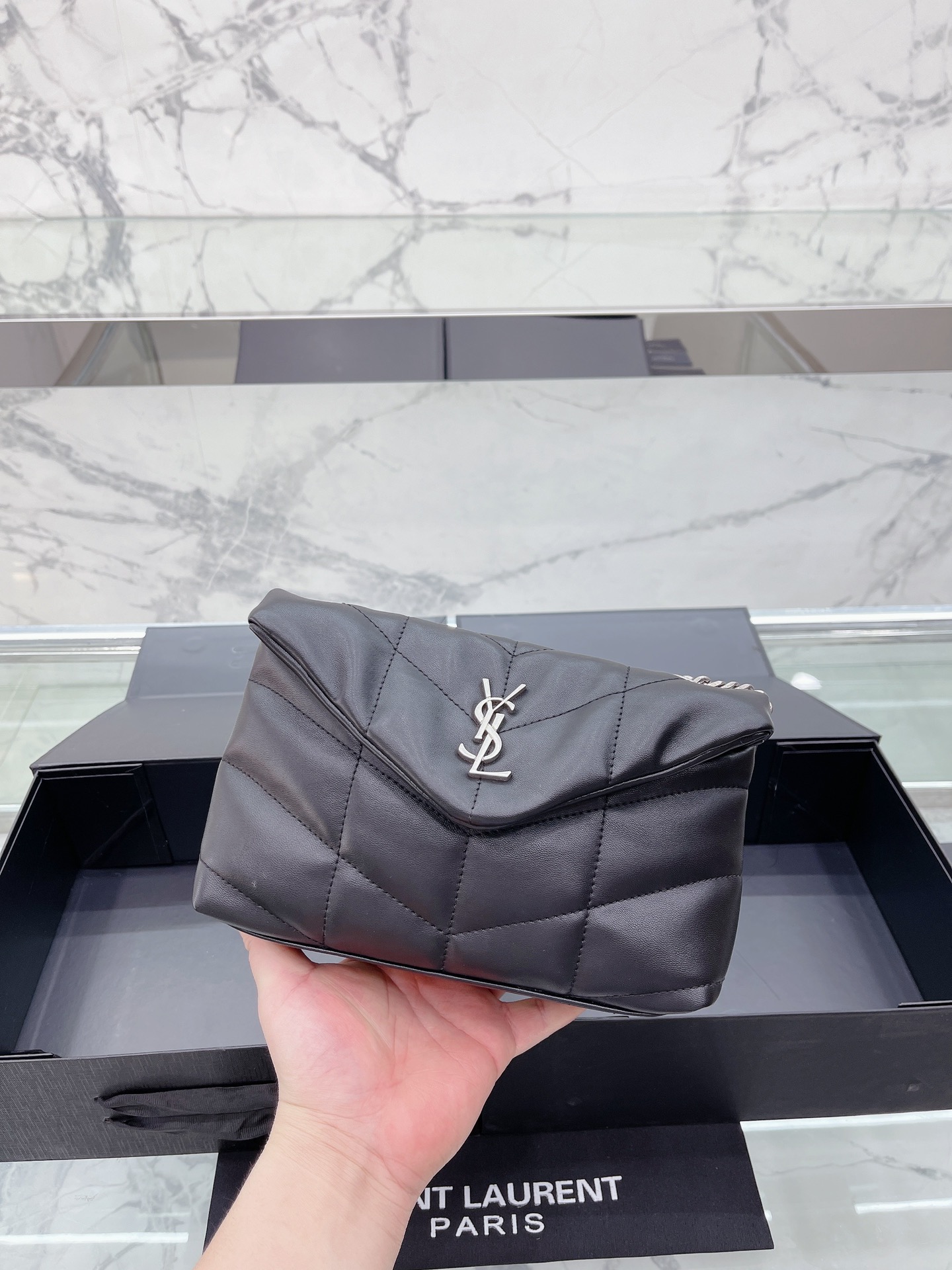 小号 Saint Laurent 圣罗兰 YSL 女士 款 Saint Laurent 圣罗兰 YSL 软糯的云朵包| loulou 包评测这款包我买来我这款金链啦~首先它是小羊皮材质的所以不耐磨大家要小心使用一不小心就会磨破向面但是手感非常非常好都可以当枕头了比香奈儿19软很多摸到真的会惊艳的那种感觉哈哈哈就和棉花糖一样包的本身也很轻完全不用担心会重!后面有上身图可以手拿侧背手提还可以交叉背!打开是信封形的所以容量也非常大可以装下日常出 门要带的所有东西! ! ! black18cm