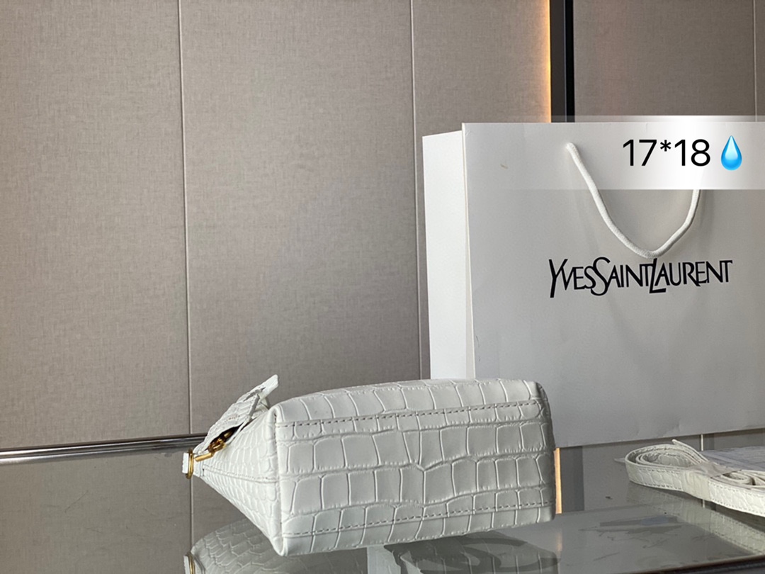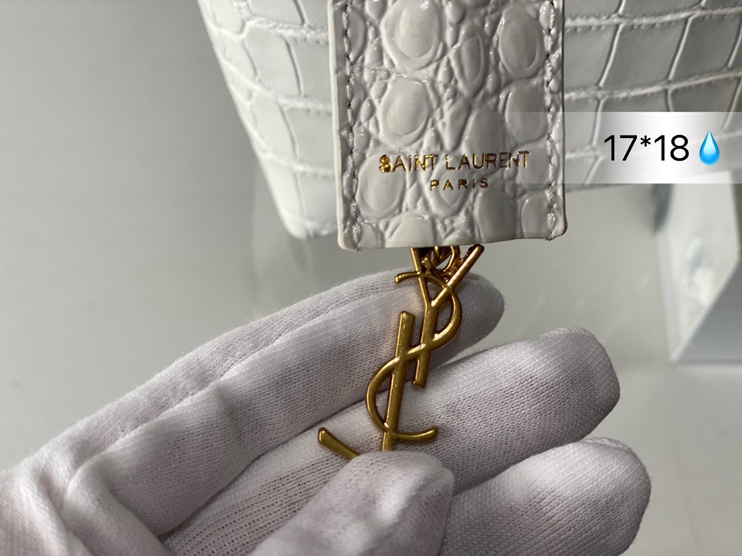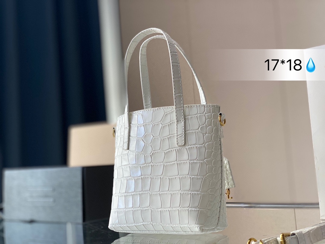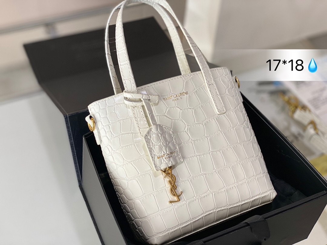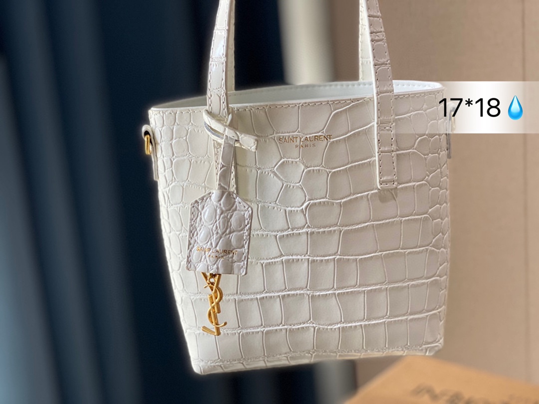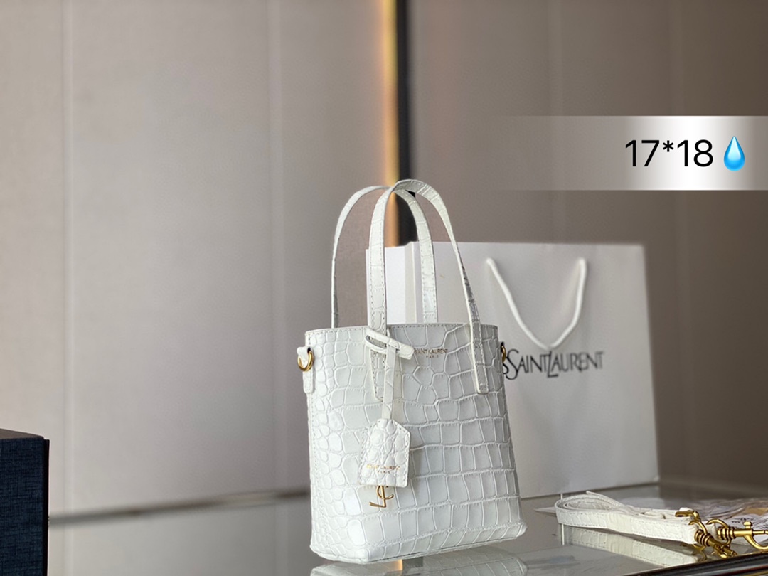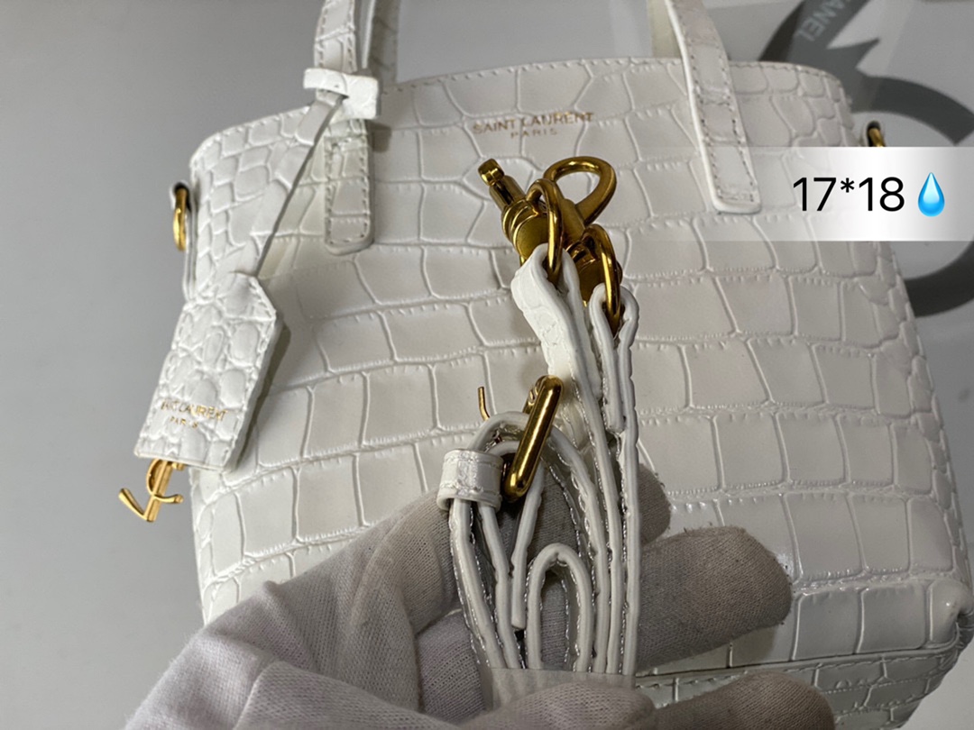 J5 SAINT LAURENT鳄鱼压纹托特包 SL按扣开合设计,搭配可拆卸皮革包覆经典 Saint Laurent 圣罗兰 YSL 标志吊饰。 鳄鱼压纹高级感十足,Tote设计容量足够容纳日常随身小物。圣罗兰 尺寸: 17*18