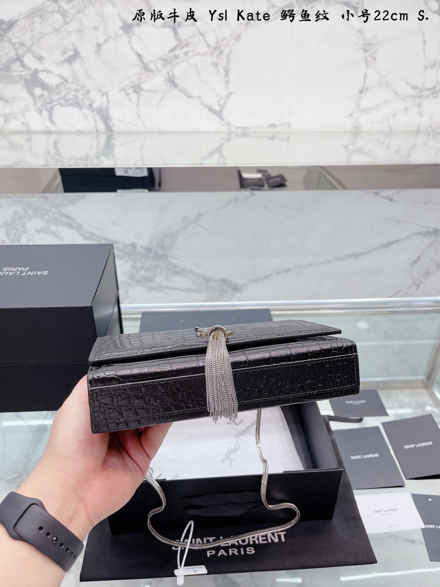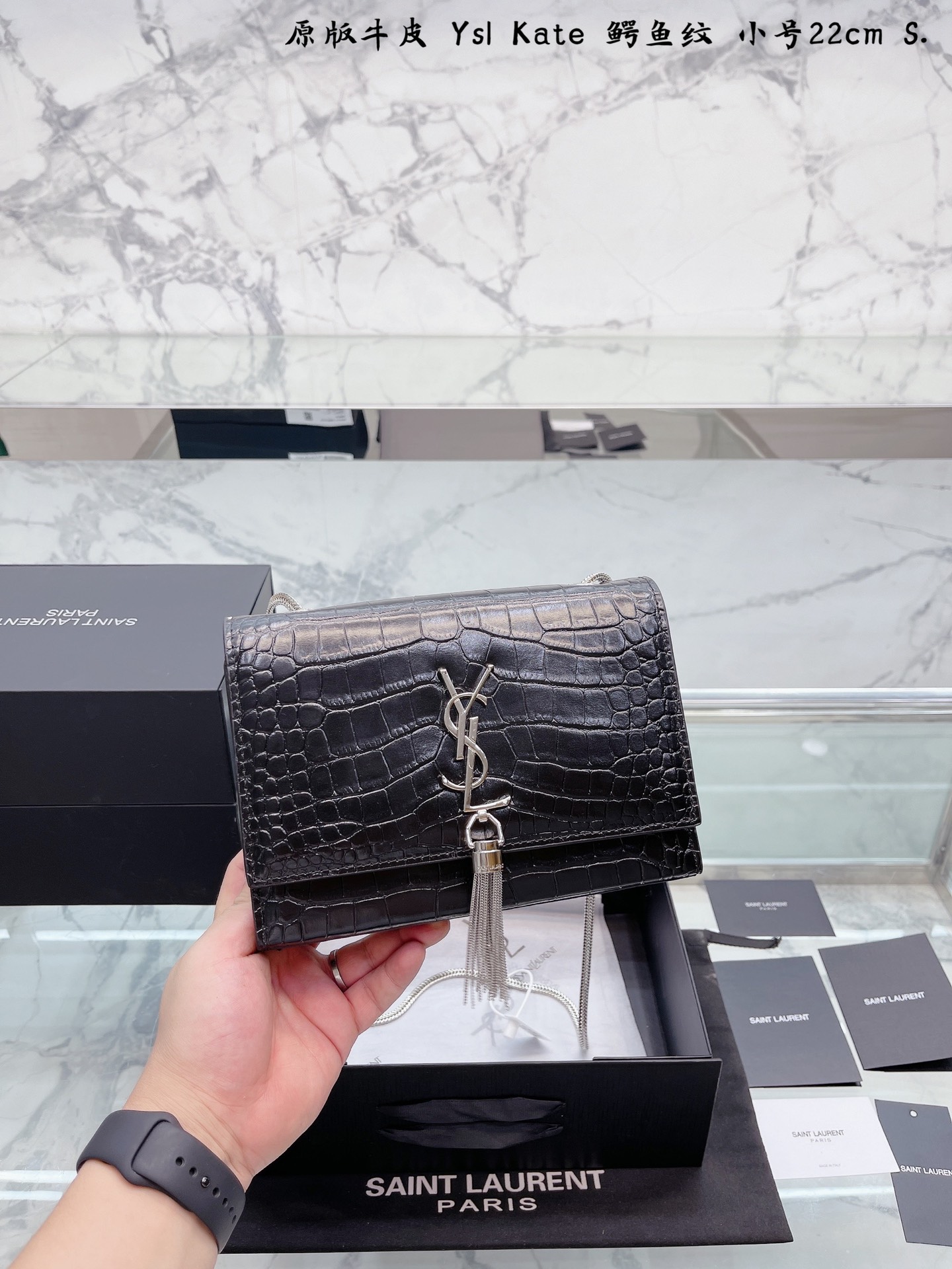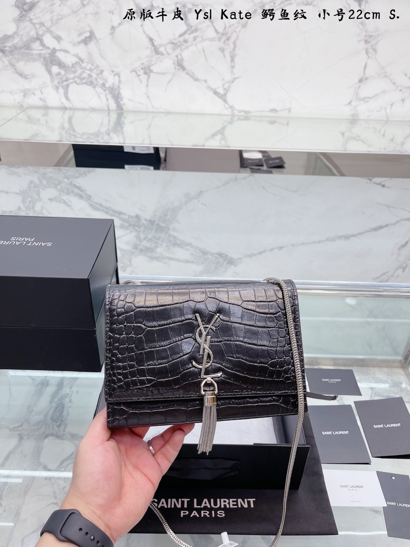 K0 原版牛皮小号 Saint Laurent 圣罗兰 YSL 鳄鱼纹流苏链条包 KATE CHAIN AND TASSEL BAG IN TEXTURED LEATHER 最新最佳最实用这个系列最核心的设计便是Y家 Logo,当年Yves Saint Laurent先生邀请海报艺术家Cassandre设计,三个字母叠加在一起简约又前卫。百分百进口牛皮压鱼子酱纹路,耐磨耐刮绝对是永恒的经典没有一个Y家的流苏包都不敢说自己潮 尺寸:22cm