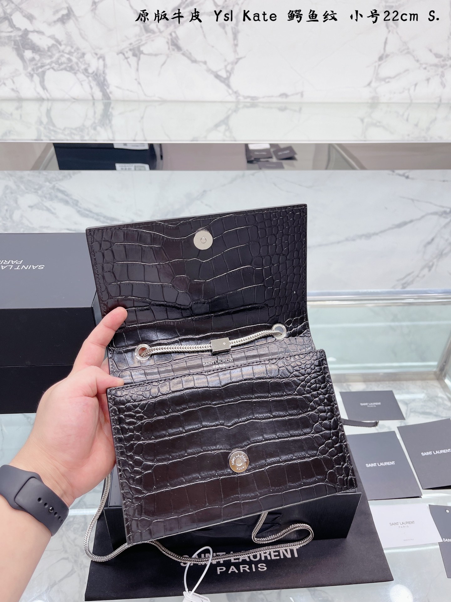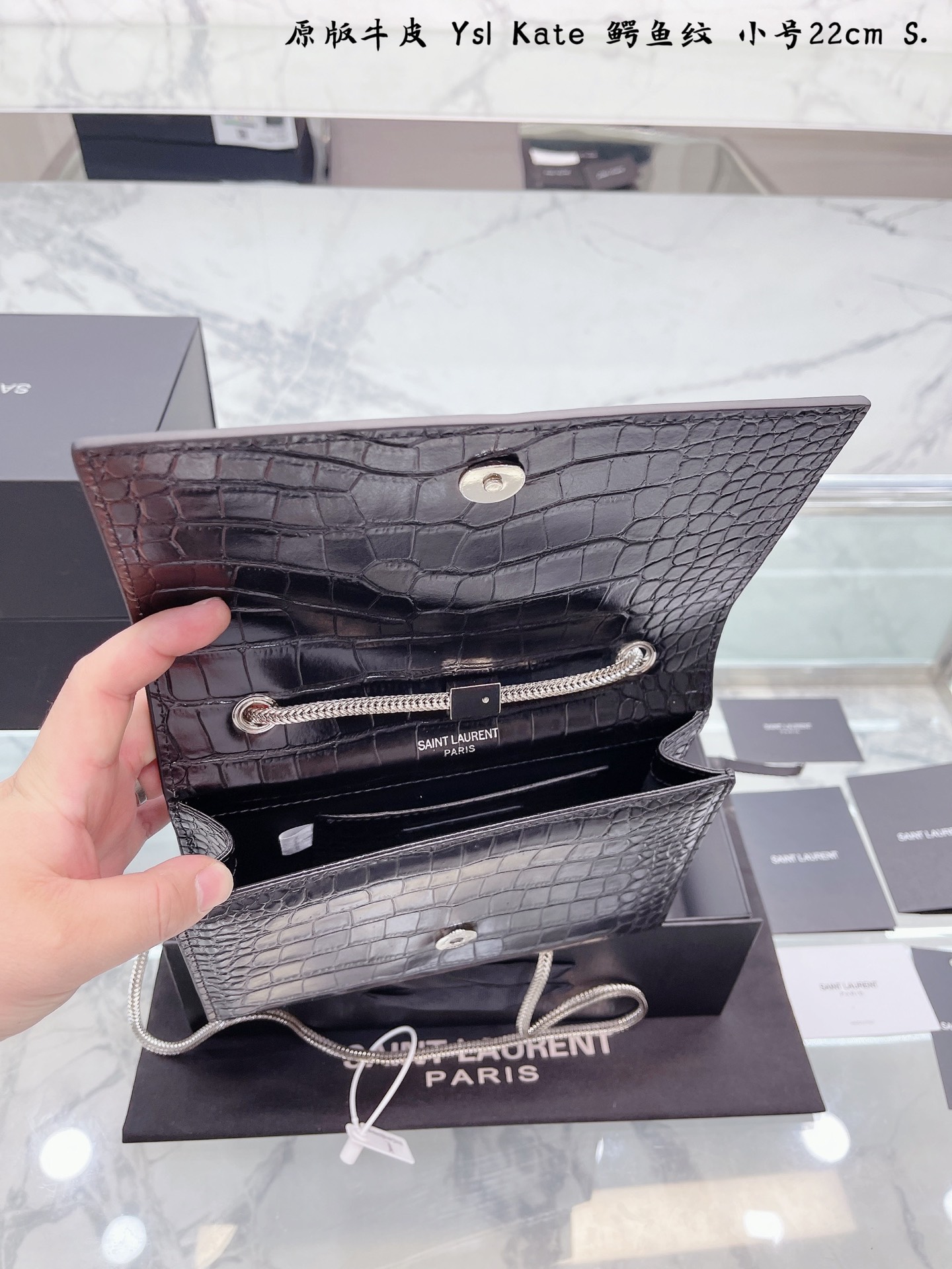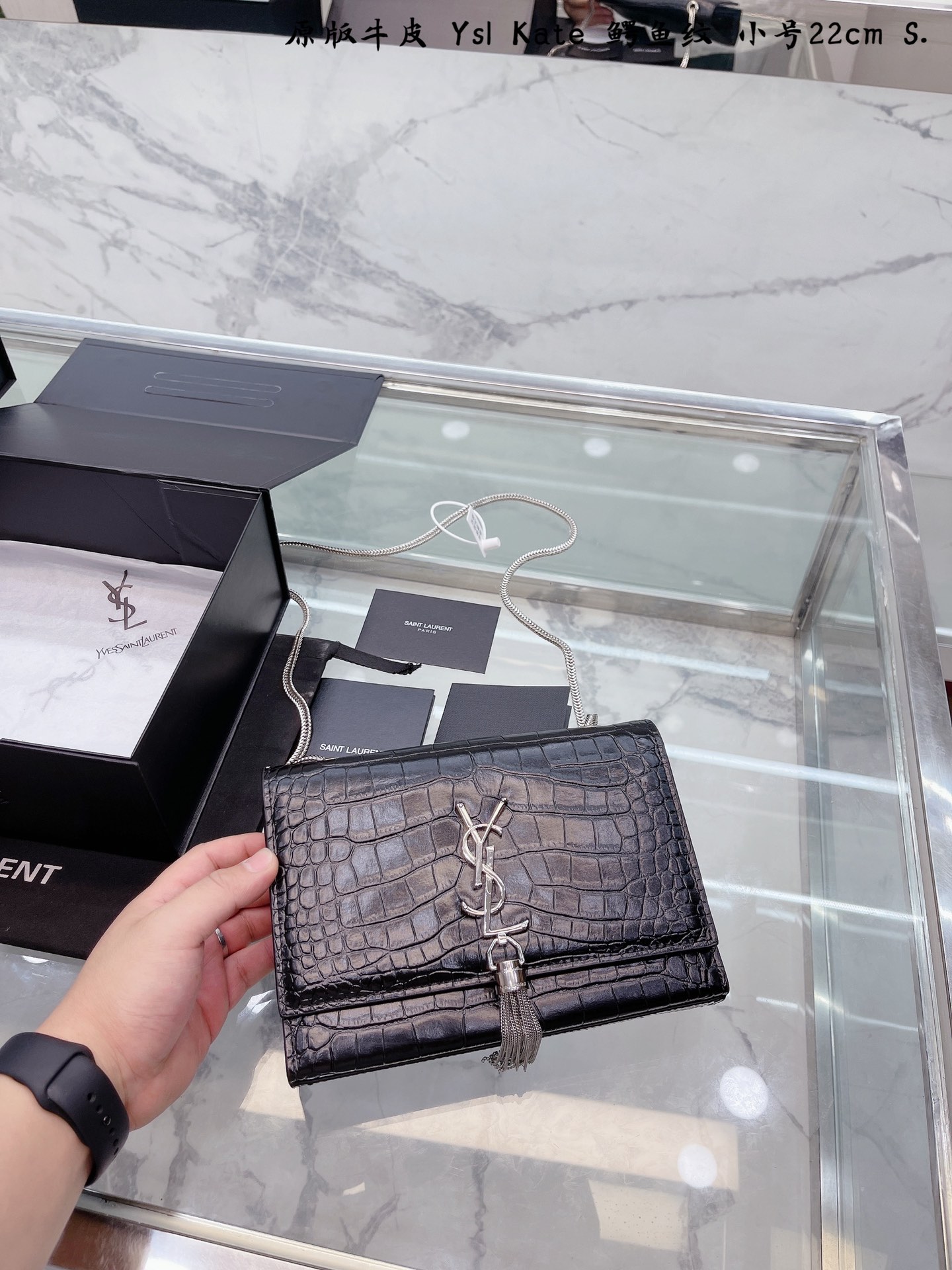 K0 原版牛皮小号 Saint Laurent 圣罗兰 YSL 鳄鱼纹流苏链条包 KATE CHAIN AND TASSEL BAG IN TEXTURED LEATHER 最新最佳最实用这个系列最核心的设计便是Y家 Logo,当年Yves Saint Laurent先生邀请海报艺术家Cassandre设计,三个字母叠加在一起简约又前卫。百分百进口牛皮压鱼子酱纹路,耐磨耐刮绝对是永恒的经典没有一个Y家的流苏包都不敢说自己潮 尺寸:22cm