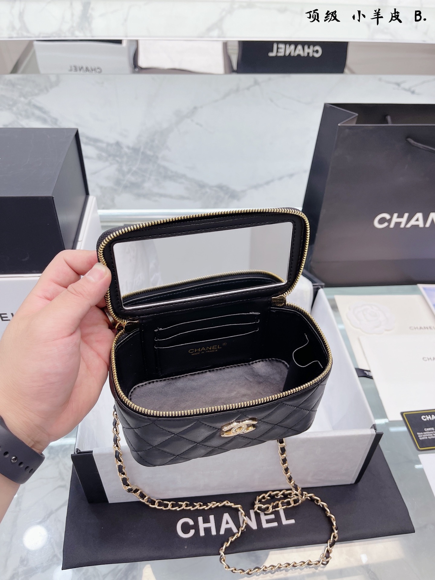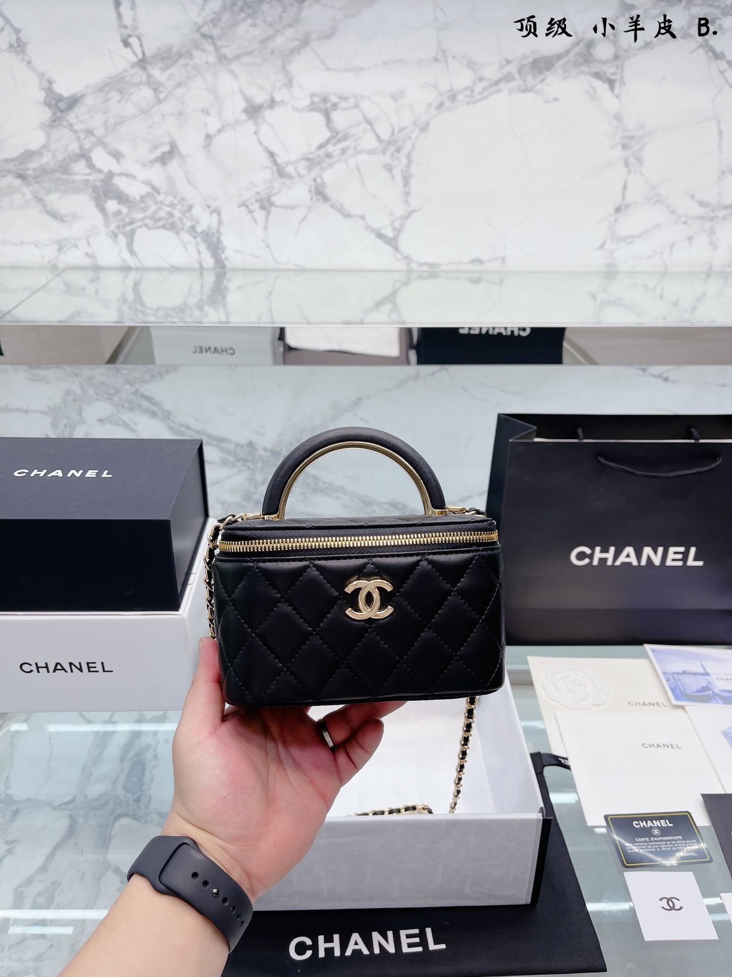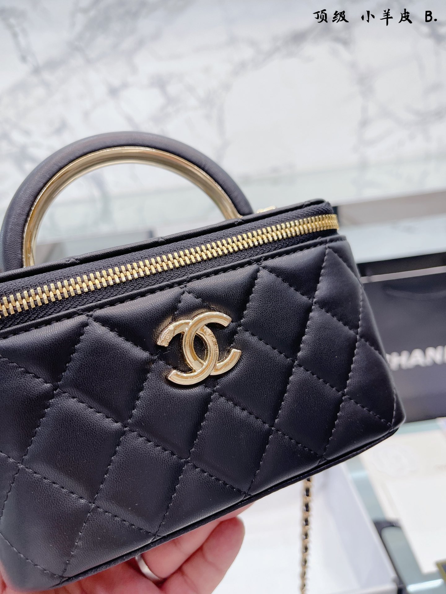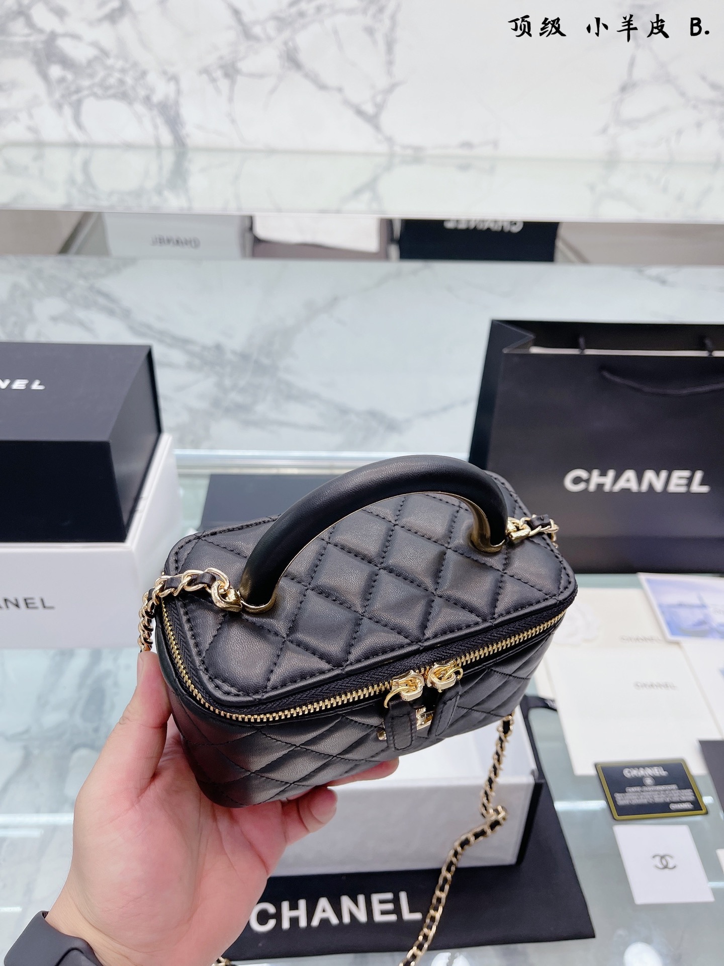 K0 小羊皮 Chanel 22A手柄 化妆箱,冷门又惊艳 很惊喜的一只,多了手柄比经典款更精致了,手拎 也好好看 金属手柄拼接皮质,质感太棒了 可斜挎、腋下、手拎超洋气 可以放 尺寸18 12cm 折叠礼盒包装