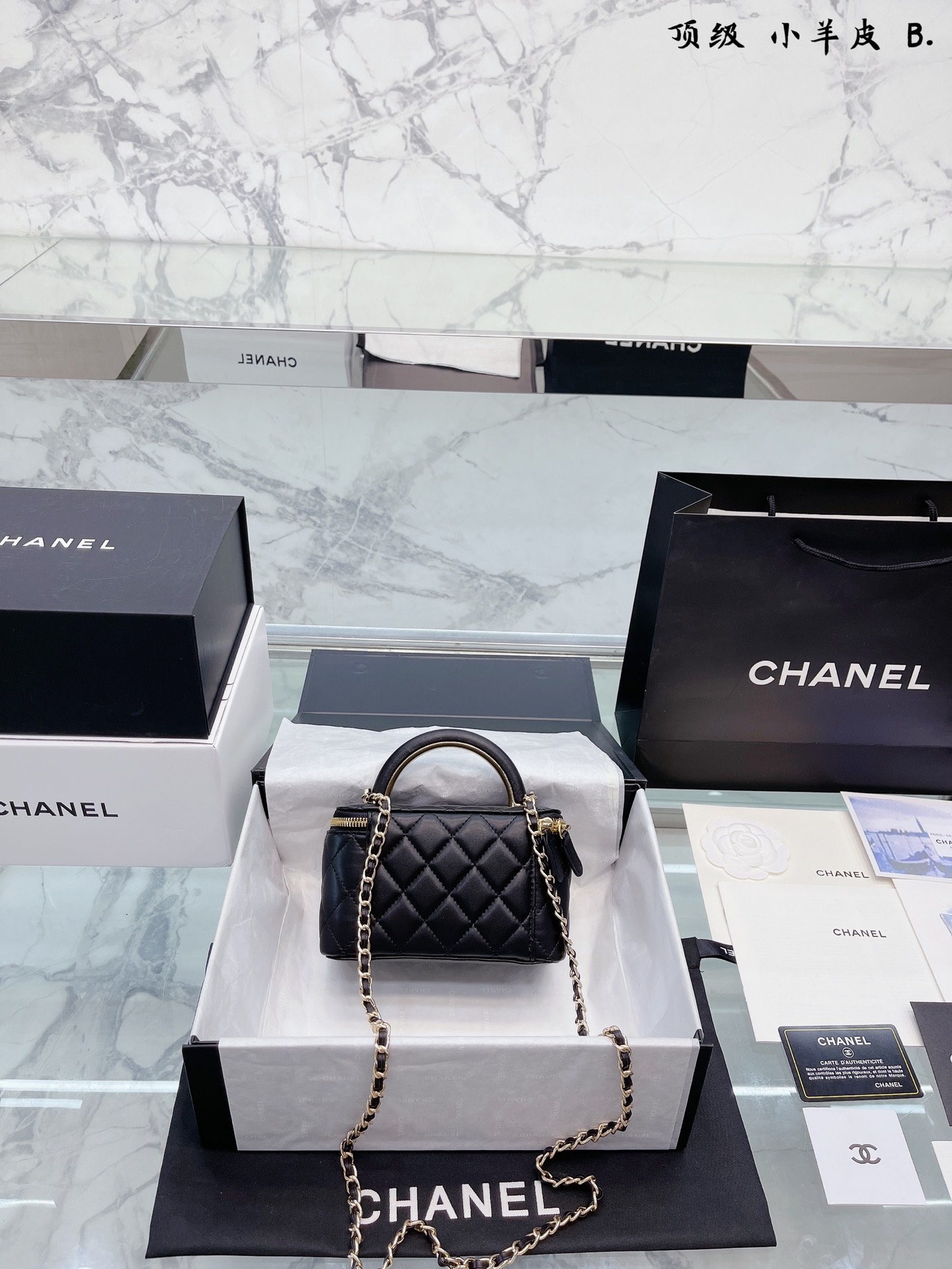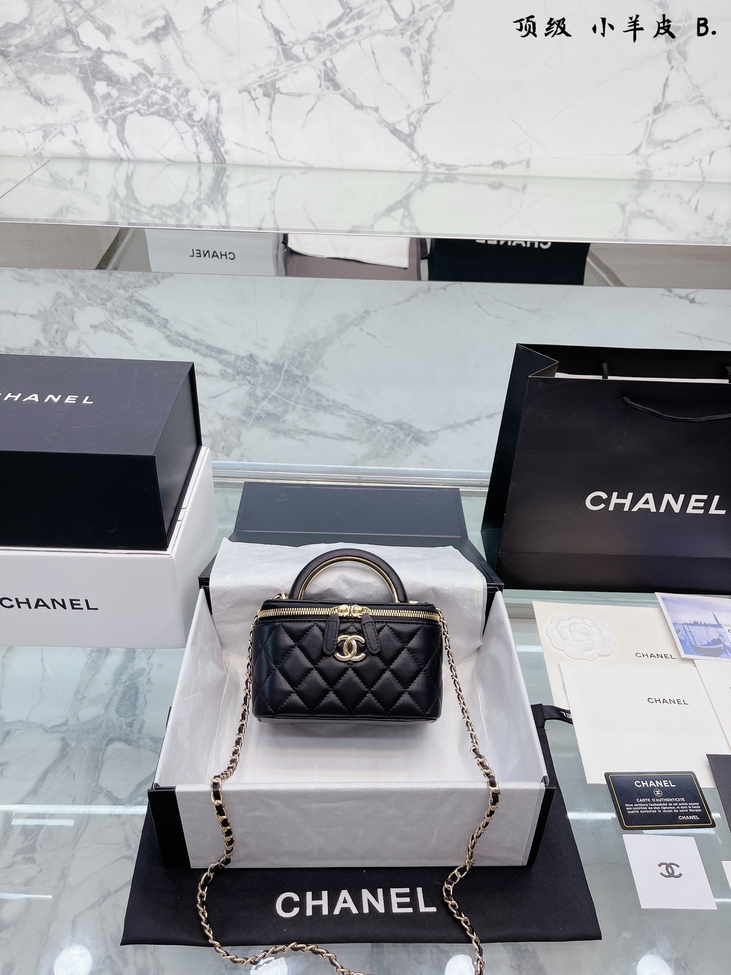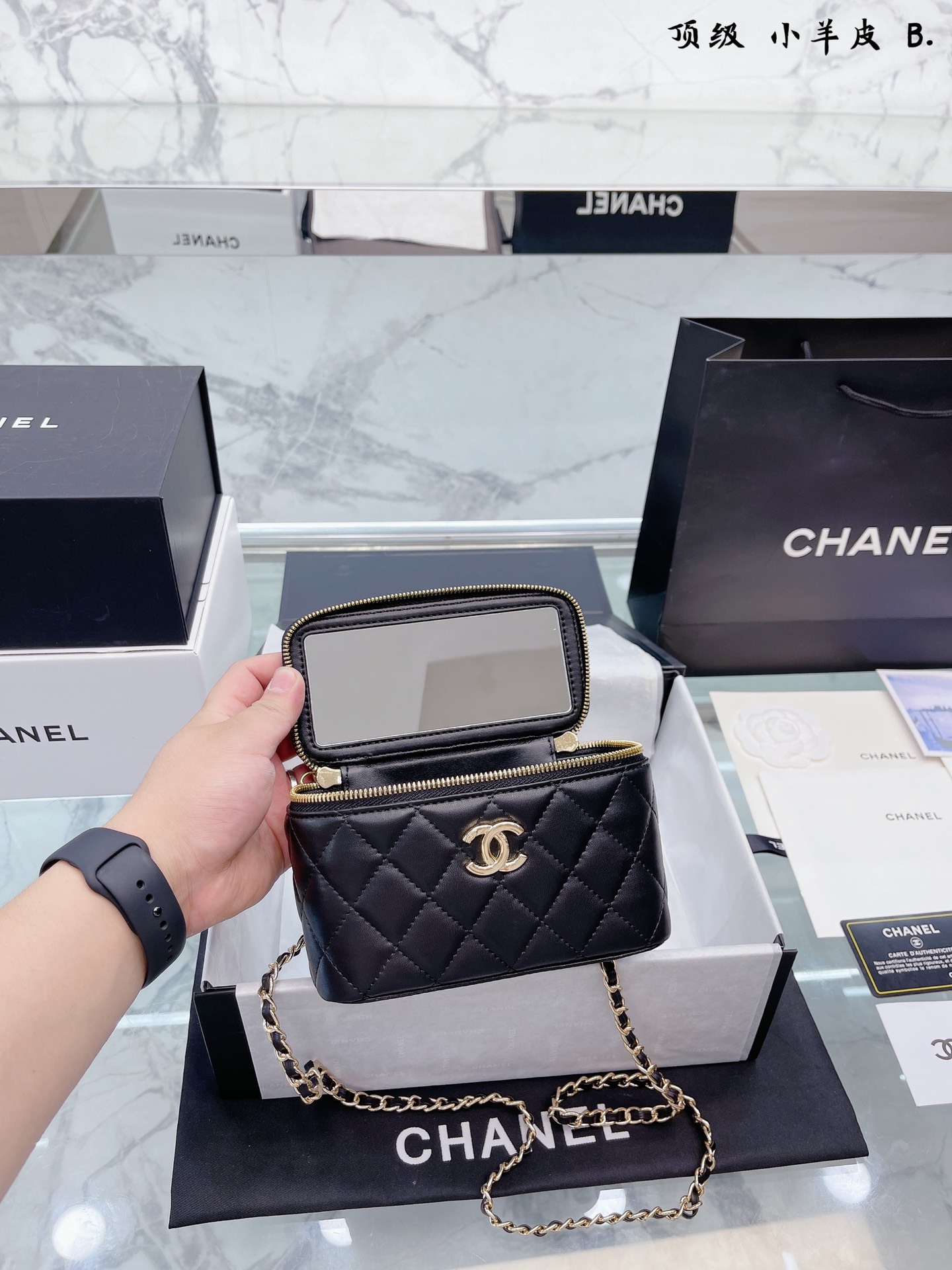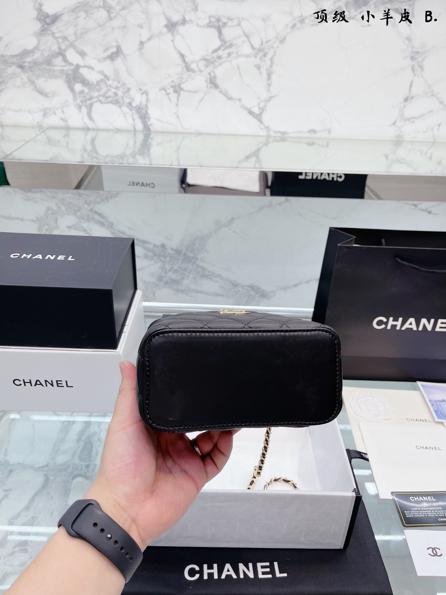 K0 小羊皮 Chanel 22A手柄 化妆箱,冷门又惊艳 很惊喜的一只,多了手柄比经典款更精致了,手拎 也好好看 金属手柄拼接皮质,质感太棒了 可斜挎、腋下、手拎超洋气 可以放 尺寸18 12cm 折叠礼盒包装