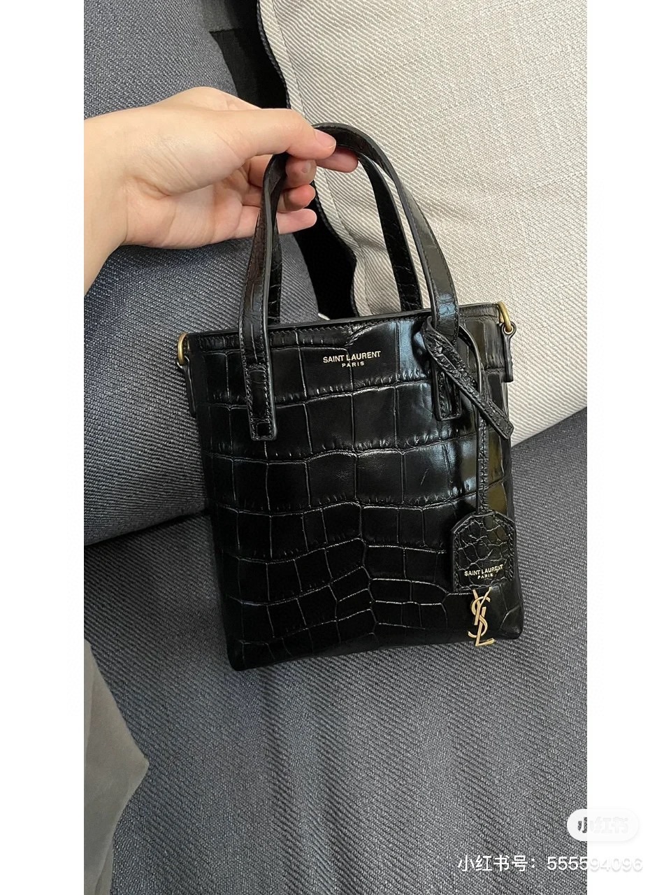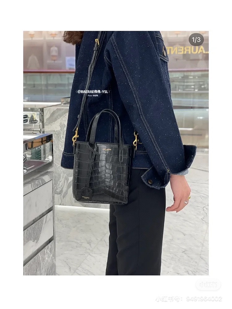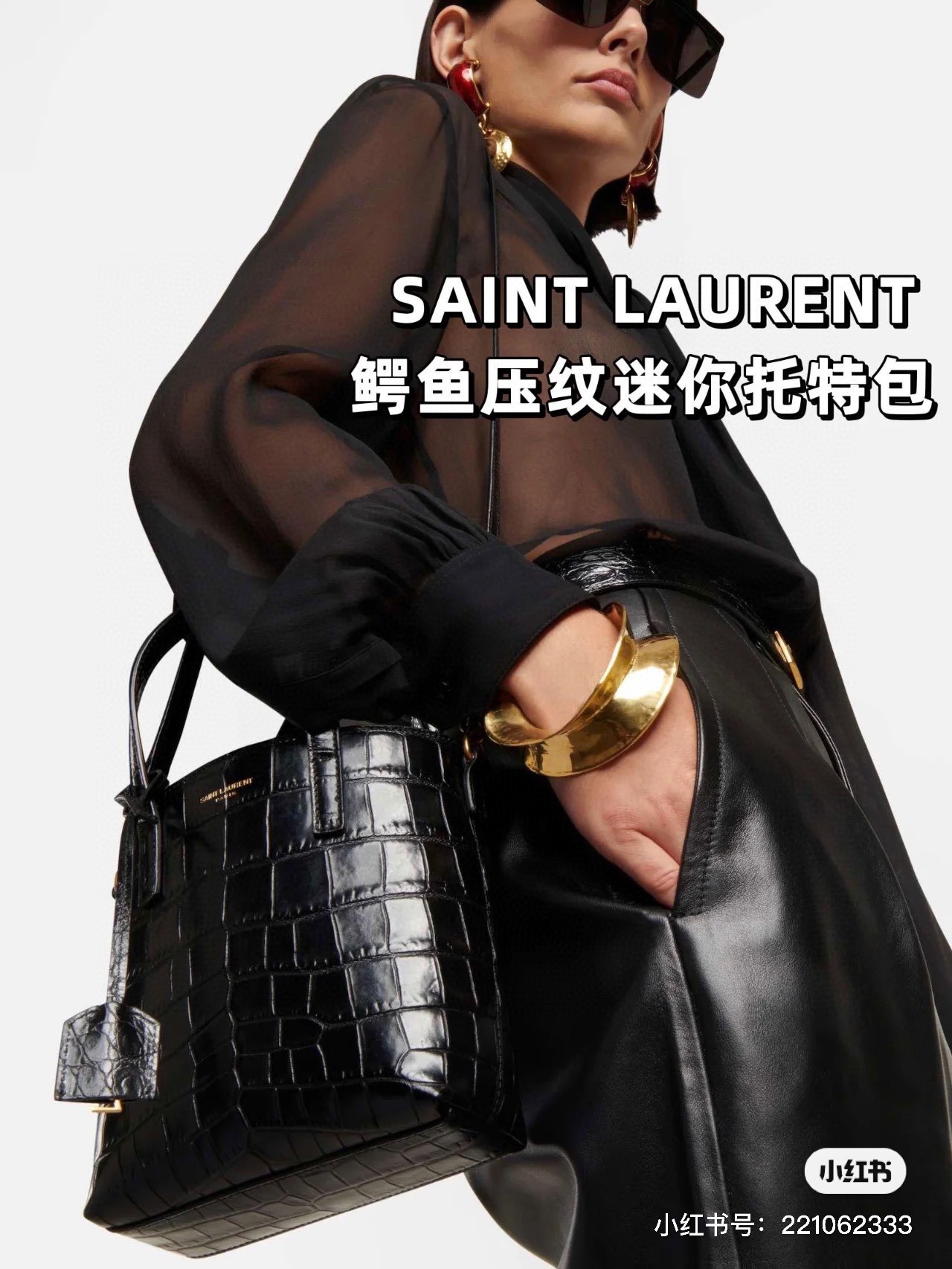 SAINT LAURENT鳄鱼压纹托特包 SL按扣开合设计,搭配可拆卸皮革包覆经典 Saint Laurent 圣罗兰 YSL 标志吊饰。 鳄鱼压纹高级感十足,Tote设计容量足够容纳日常随身小物。