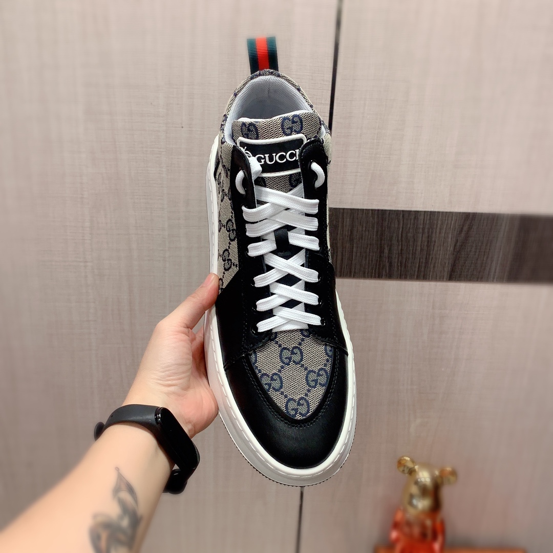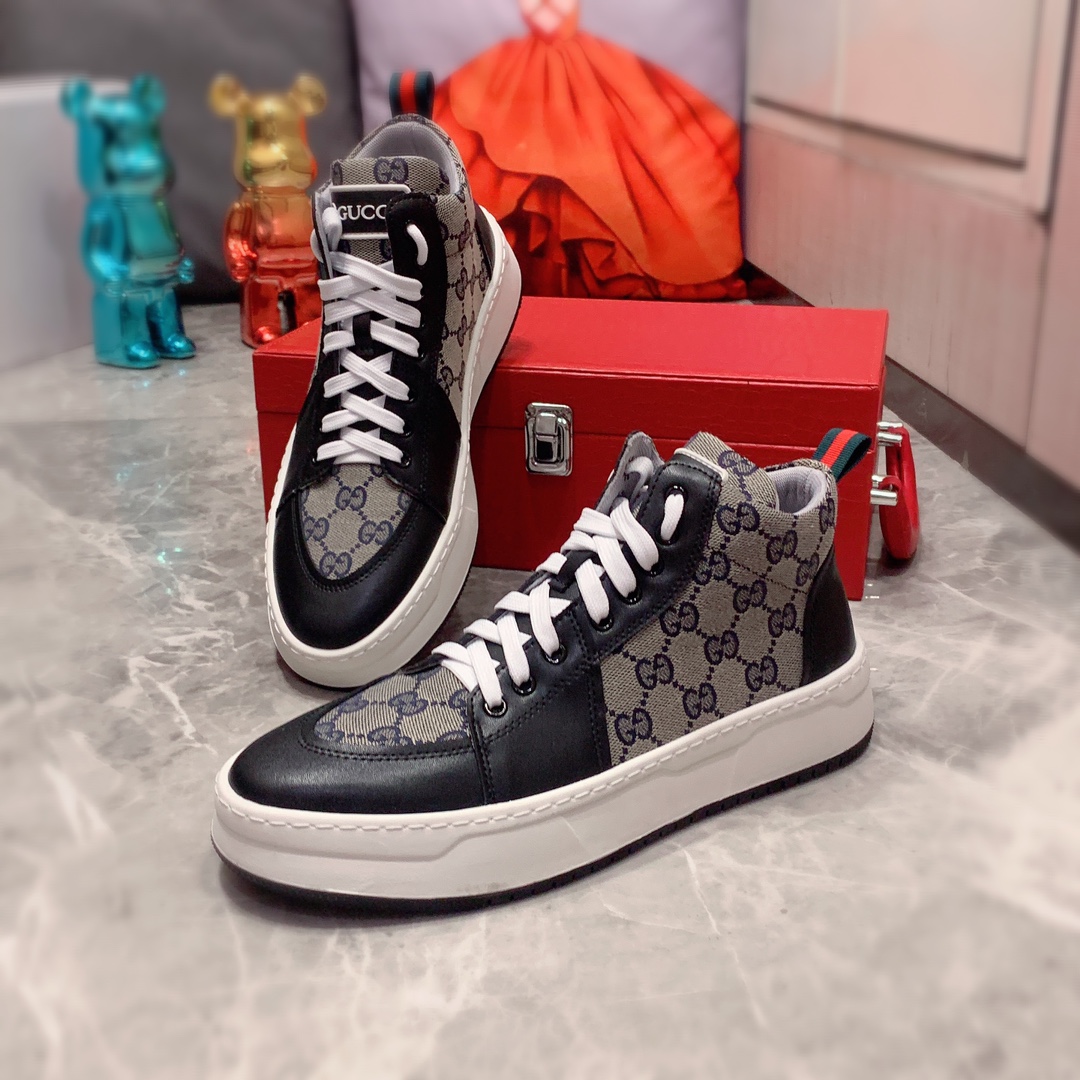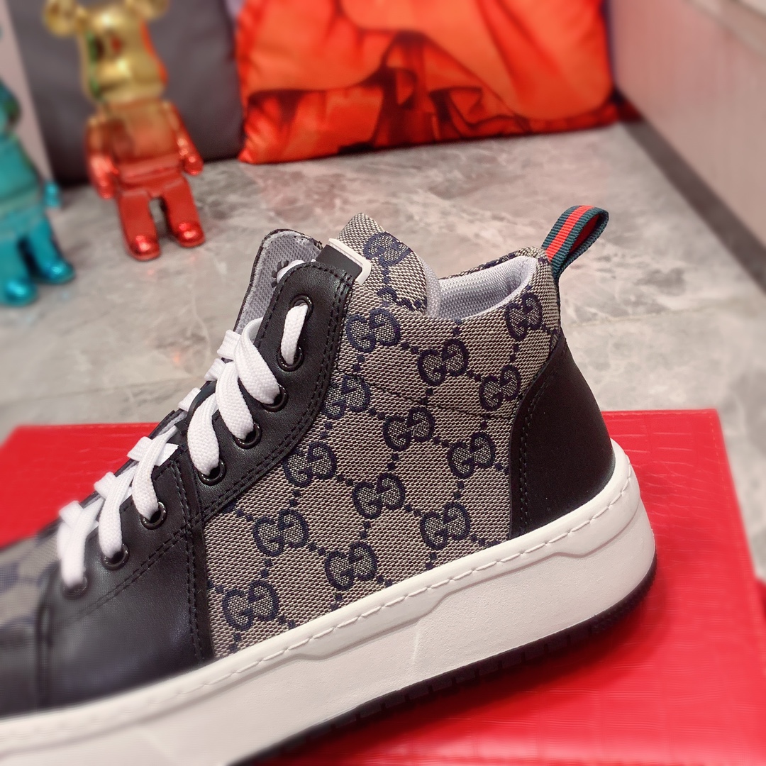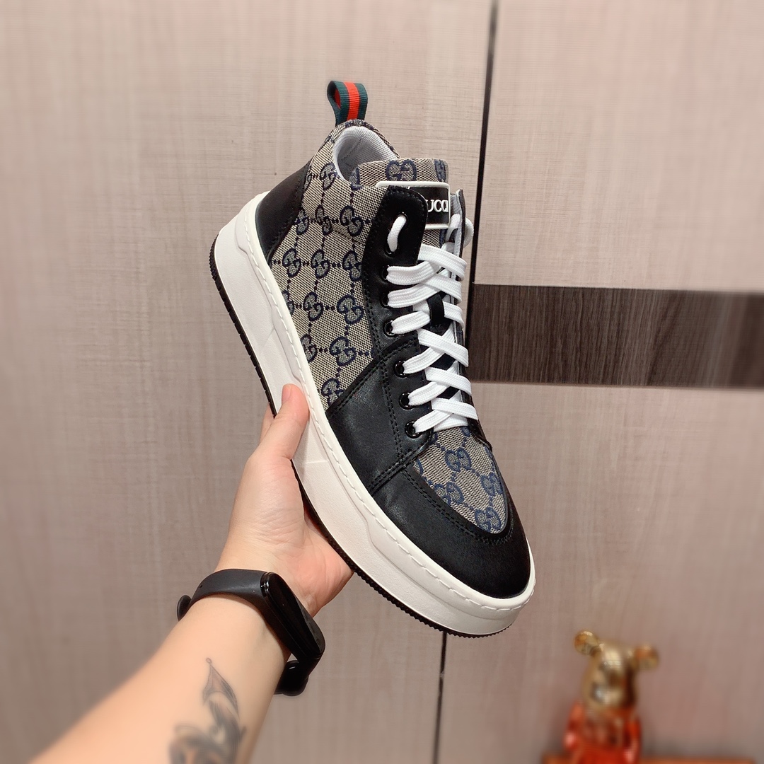 J0 高帮: Gucci 古奇 最新爆款休闲鞋,顶端品牌奢侈~代购,顶级~质量。专柜同卖产品鞋面選用进口透气牛皮搭配布面料材质透气运动内里精细做工。原版个性时尚柔软橡膠耐磨防滑大底,上脚轻巧舒适,实物拍摄實物更好看,广州码: 38-44。2色可选