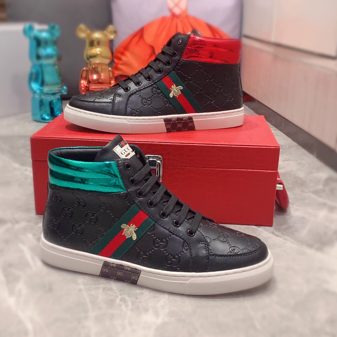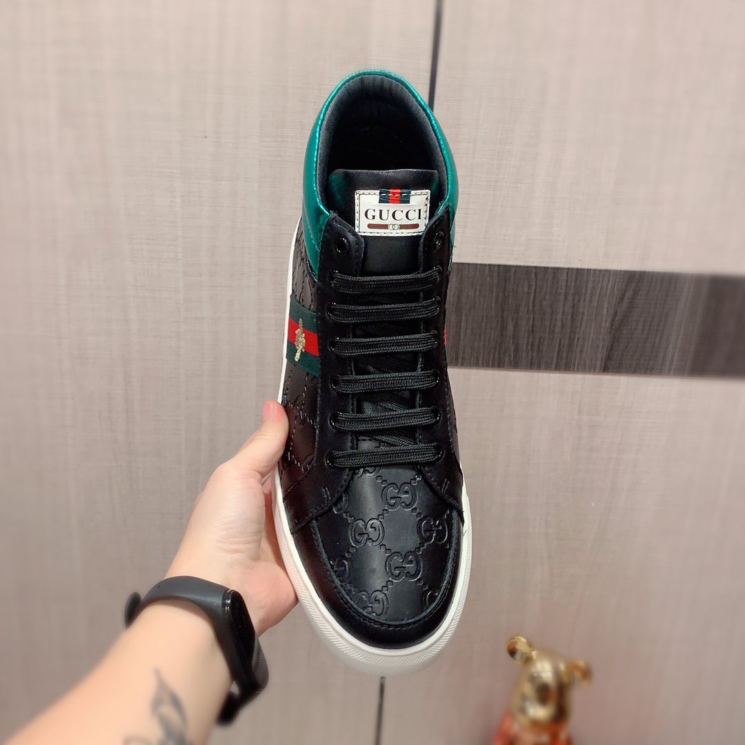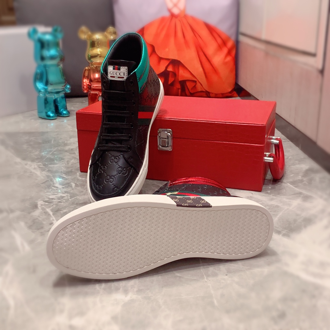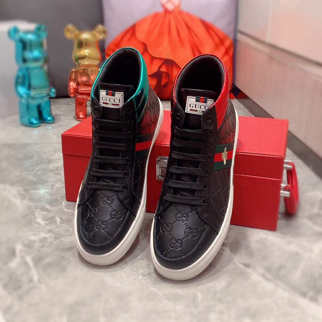J0 高帮: Gucci 古奇 最新爆款休闲鞋,顶端品牌奢侈~代购,顶级~质量。专柜同卖产品鞋面選用进口透气牛皮搭配材质透气羊皮内里精细做工。原版个性时尚柔软橡膠耐磨防滑大底,上脚轻巧舒适,实物拍摄實物更好看,111广州码: 38-44。2色可选