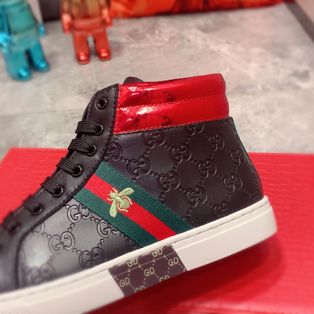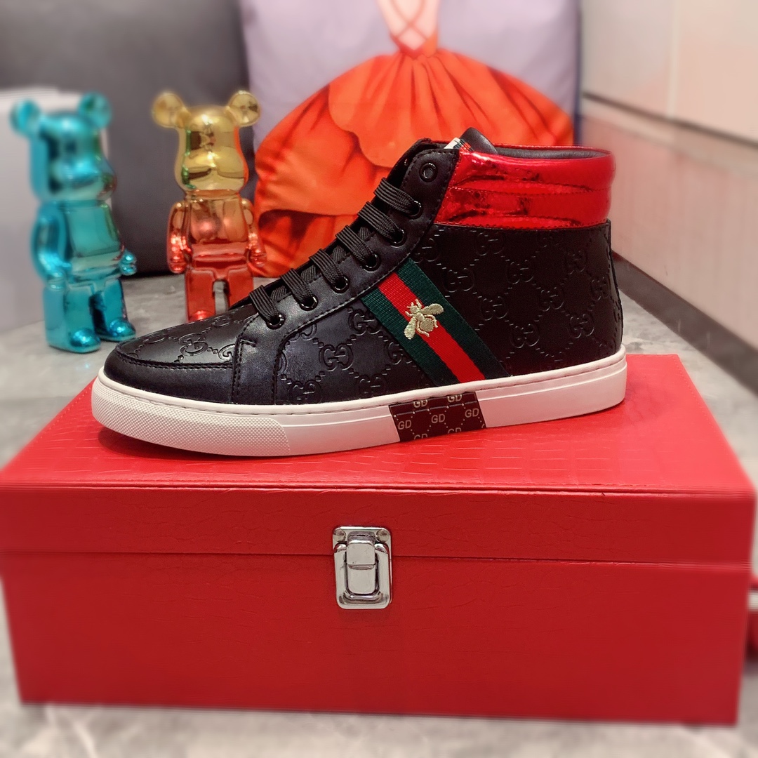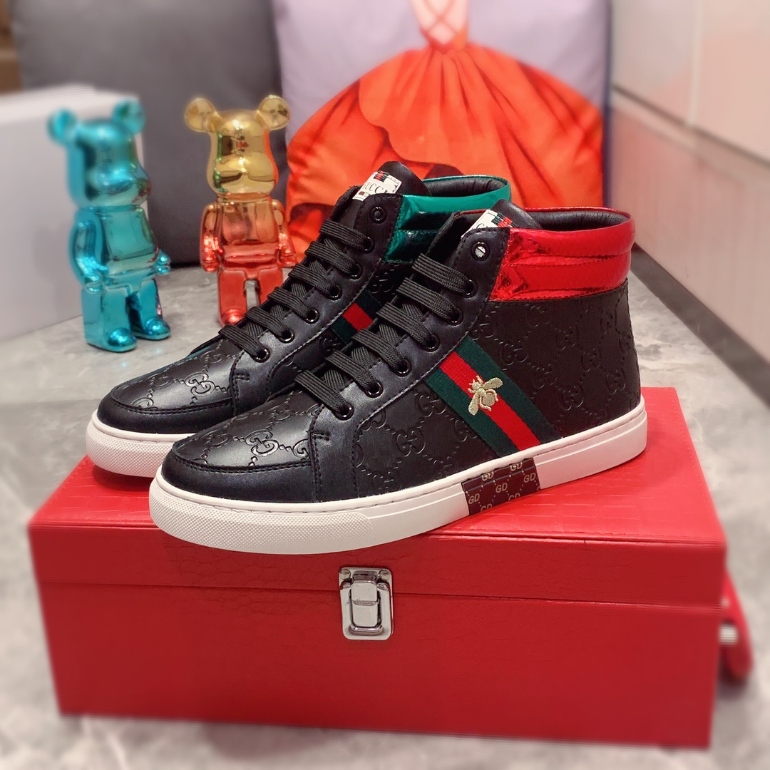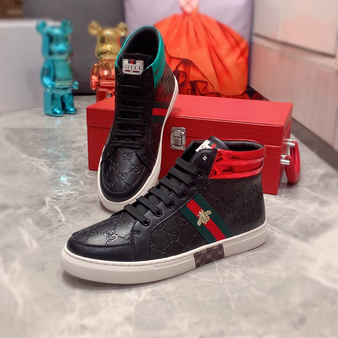 J0 高帮: Gucci 古奇 最新爆款休闲鞋,顶端品牌奢侈~代购,顶级~质量。专柜同卖产品鞋面選用进口透气牛皮搭配材质透气羊皮内里精细做工。原版个性时尚柔软橡膠耐磨防滑大底,上脚轻巧舒适,实物拍摄實物更好看,111广州码: 38-44。2色可选