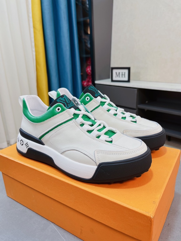 J0 Louis Vuitton 路易威登 LV 低帮休闲男鞋. 时尚潮男必备,香港专柜新品出炉, 大牌风范,欧美大师强力打造独特款式,上脚舒适,大底超柔软,超耐磨.给人视觉冲击感强.材料: 鞋面进口牛皮拼接橡胶大底,橡胶图形搭配,38一44