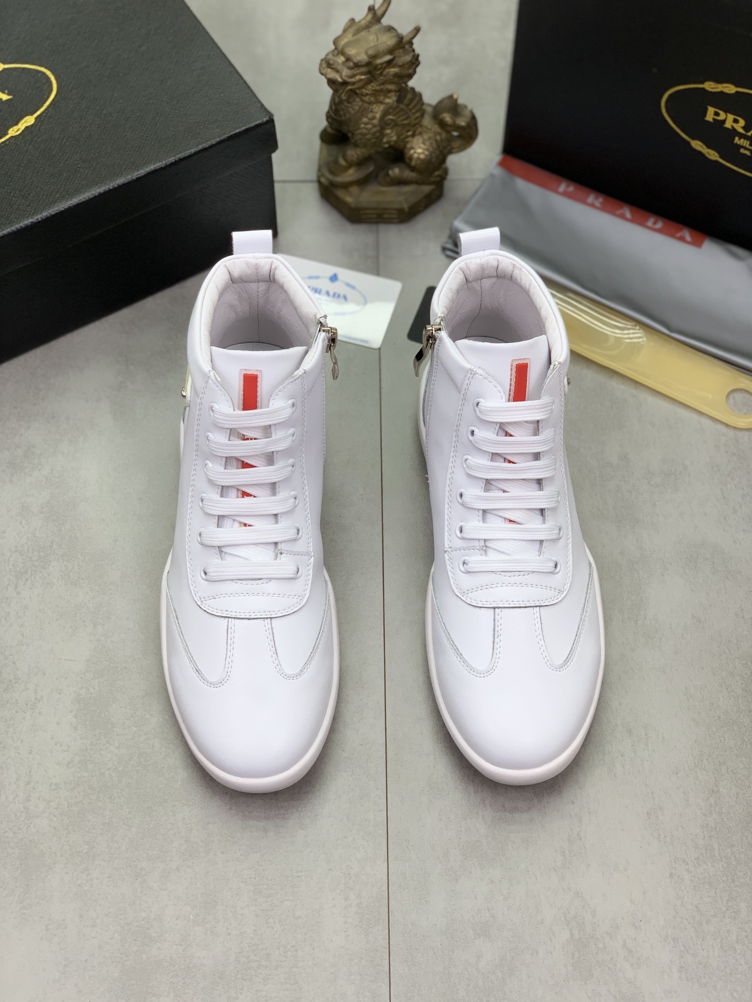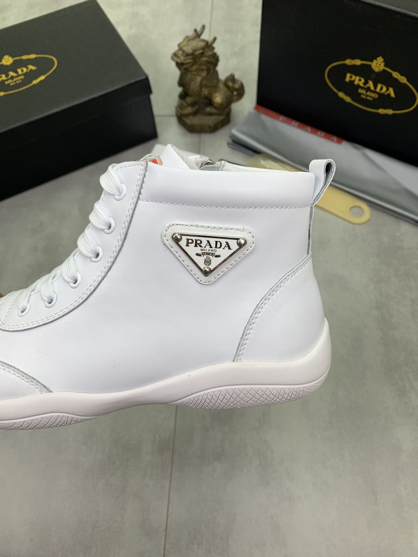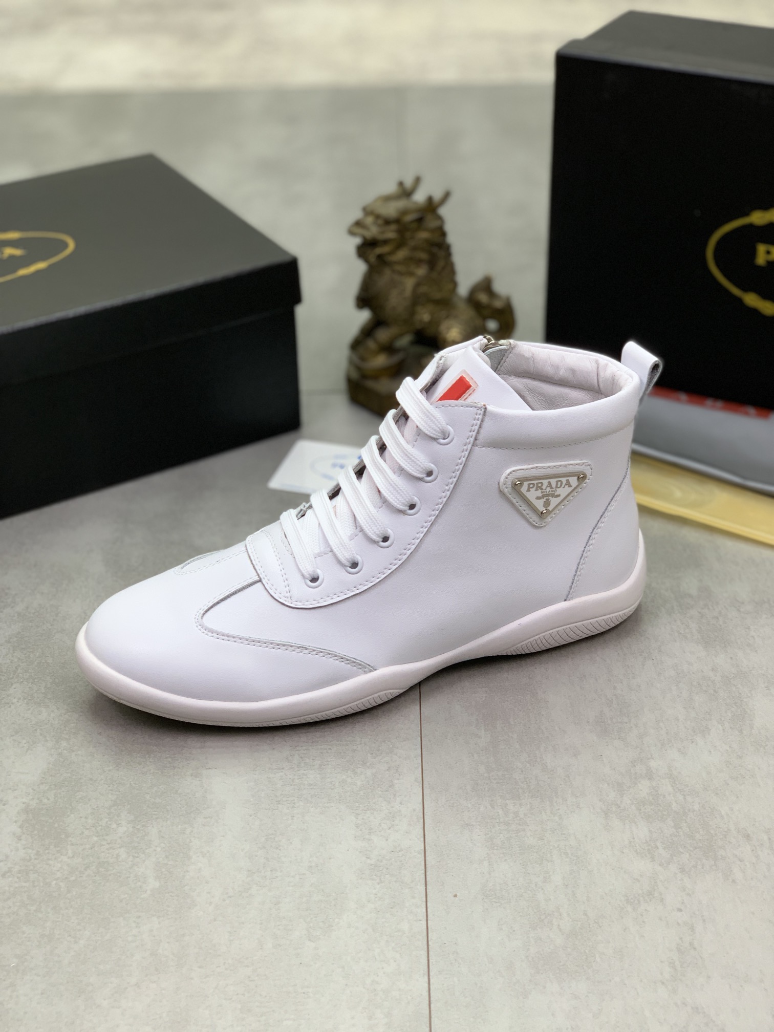J0 高品质羊里Prada 普拉达 高帮男鞋官网经典最上市了1:1复制,香港专柜同步,走秀同台;全部采用进口小牛皮进口柔软舒适羊皮内里、橡胶大底原版1:1防滑耐磨;着脚舒适、款式耐看,做工精细,配以简洁利落的鞋楦,彰显男人的果敢和硬朗,码数38一44;黑色 白色颜色选