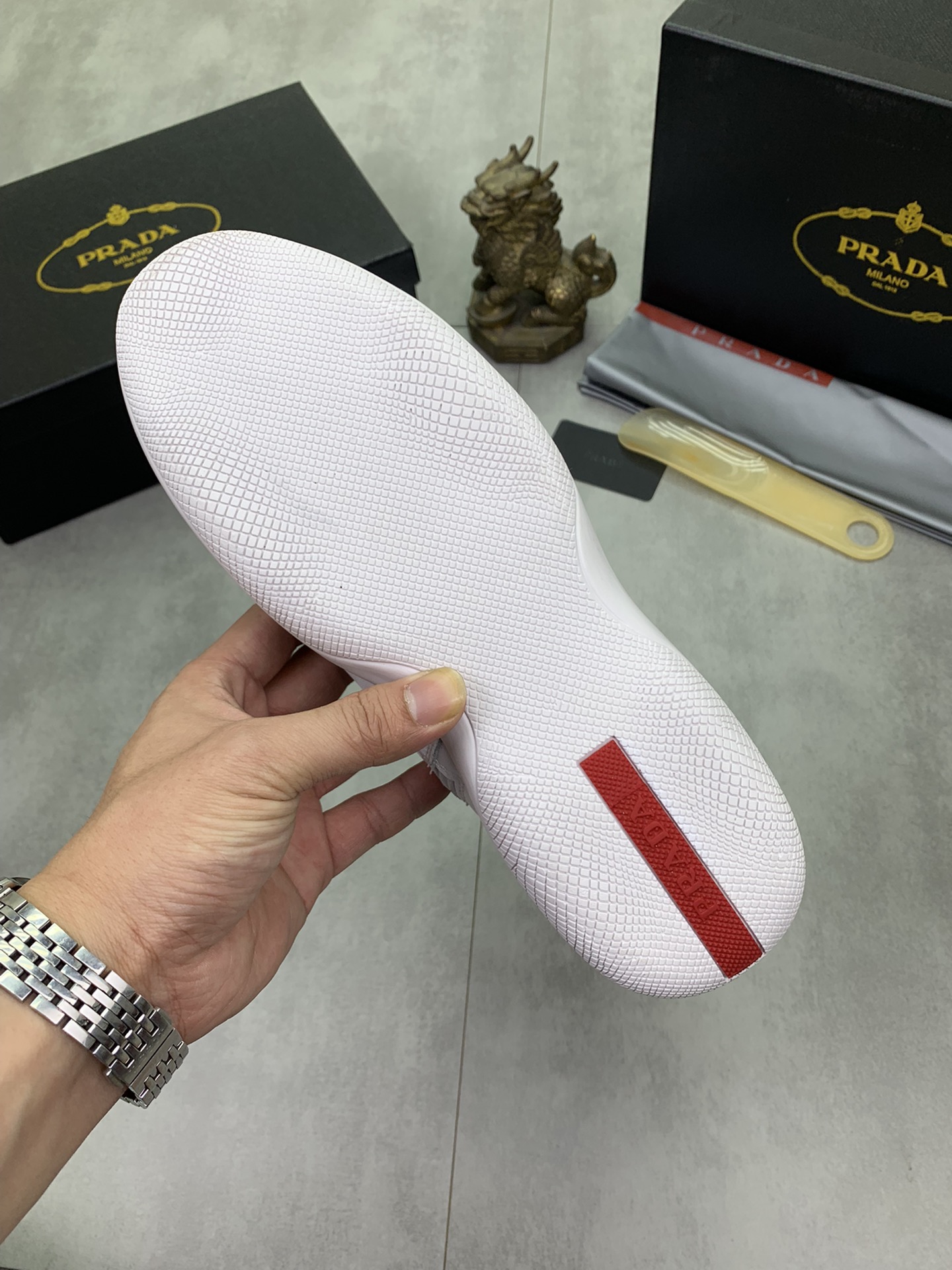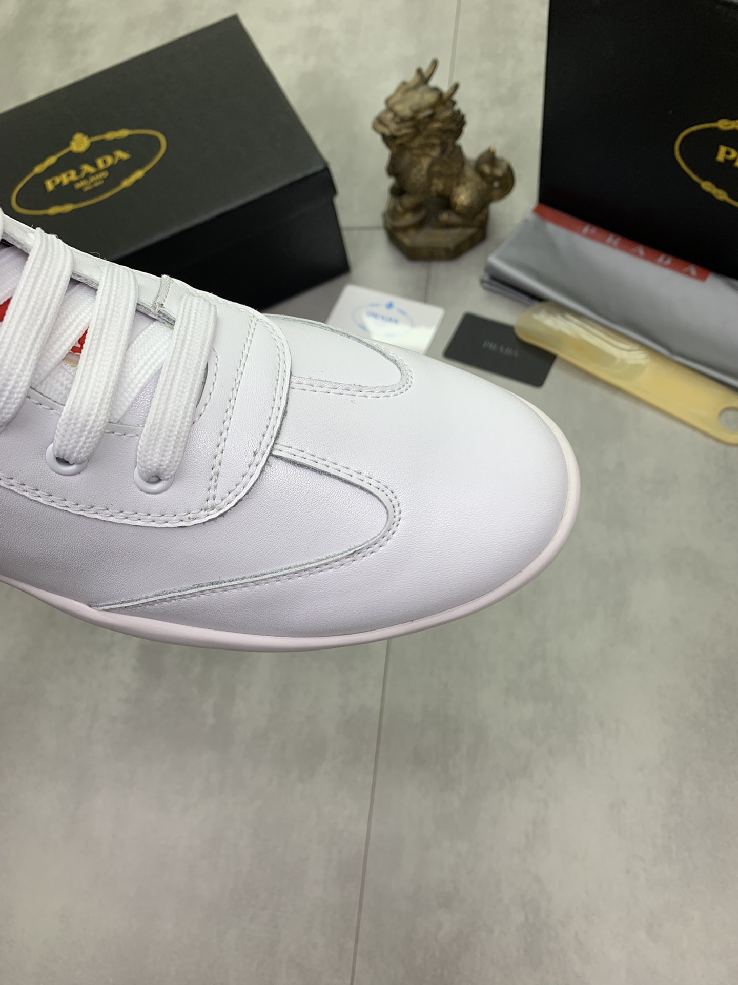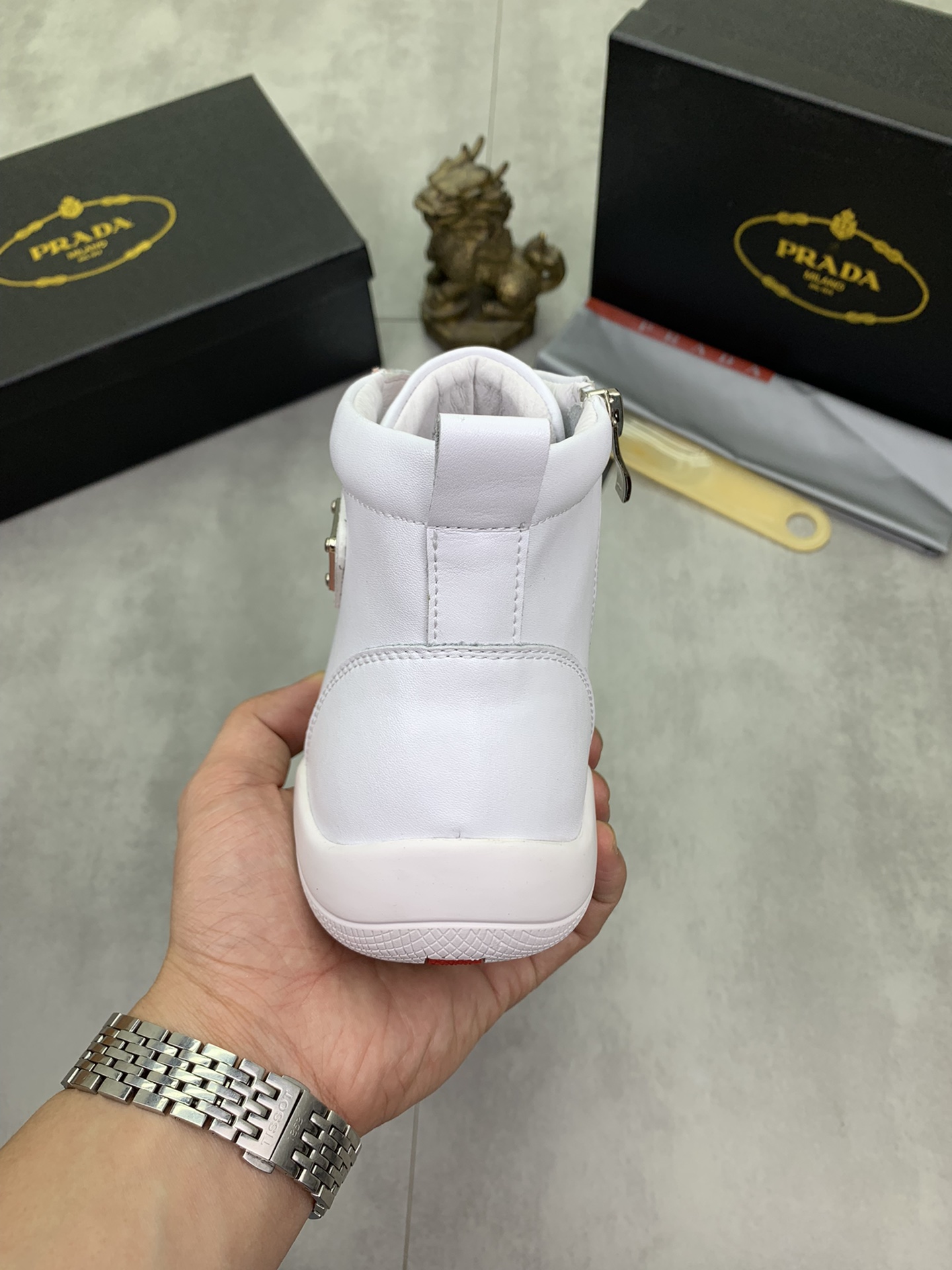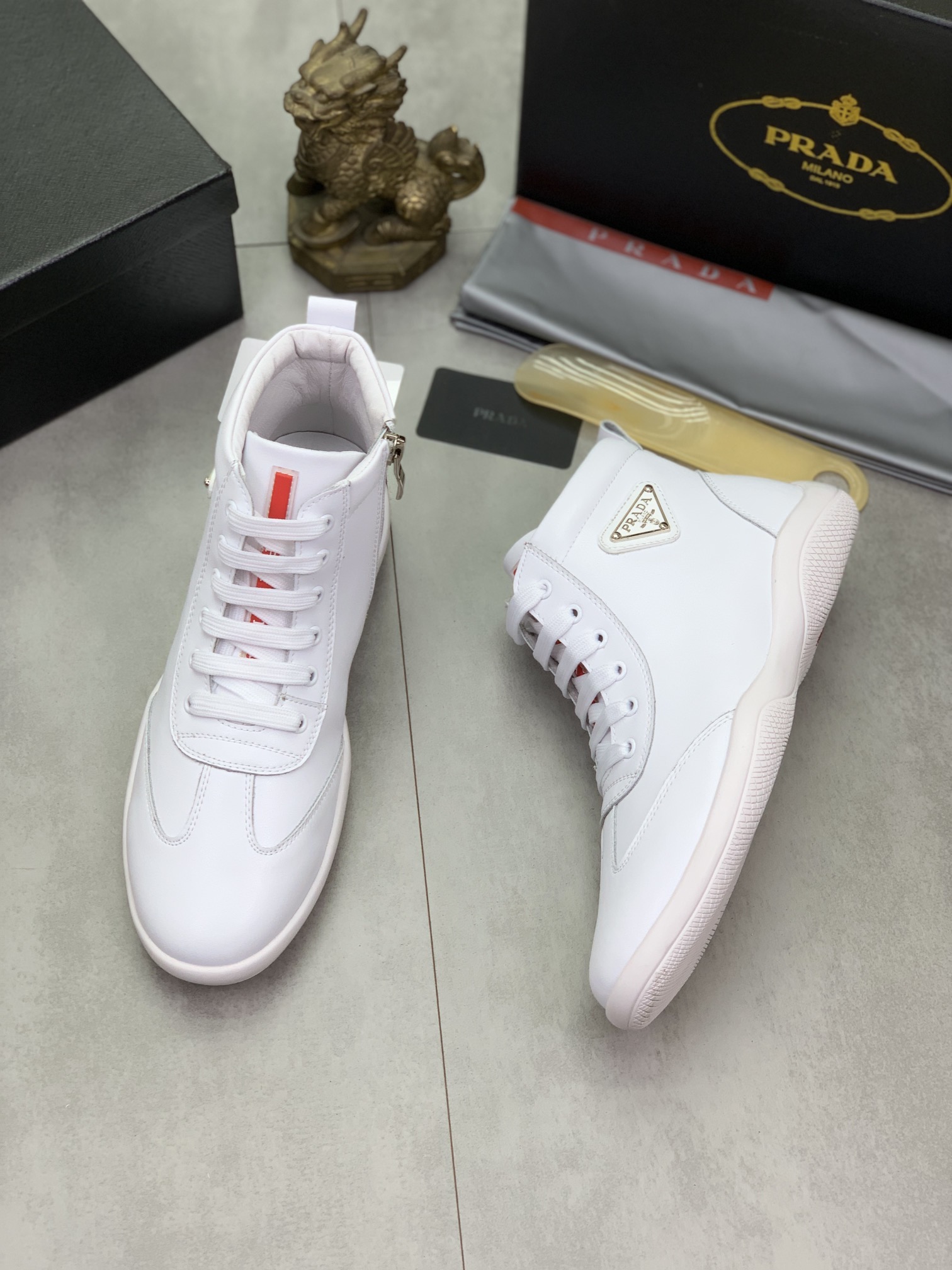 J0 高品质羊里Prada 普拉达 高帮男鞋官网经典最上市了1:1复制,香港专柜同步,走秀同台;全部采用进口小牛皮进口柔软舒适羊皮内里、橡胶大底原版1:1防滑耐磨;着脚舒适、款式耐看,做工精细,配以简洁利落的鞋楦,彰显男人的果敢和硬朗,码数38一44;黑色 白色颜色选