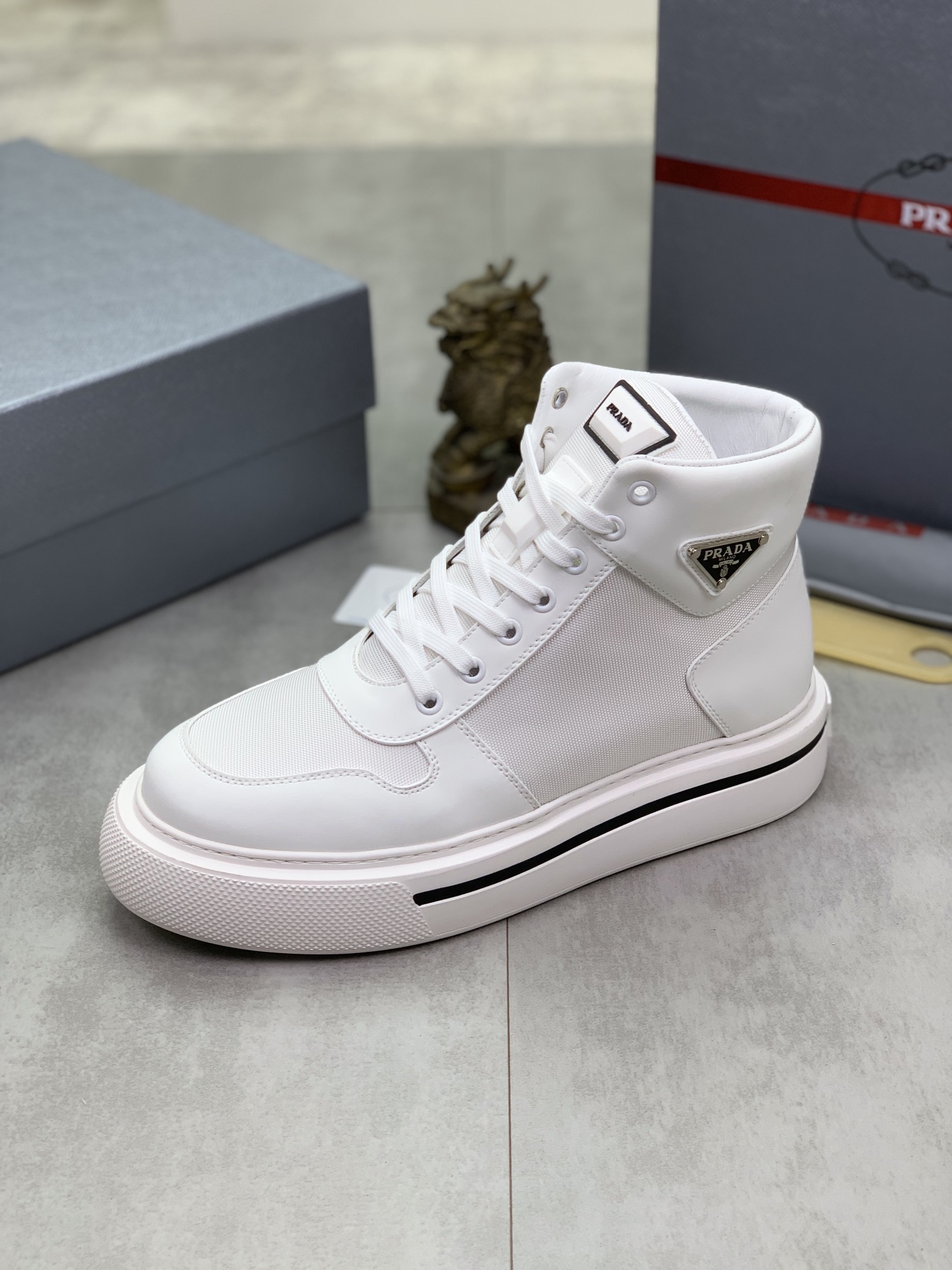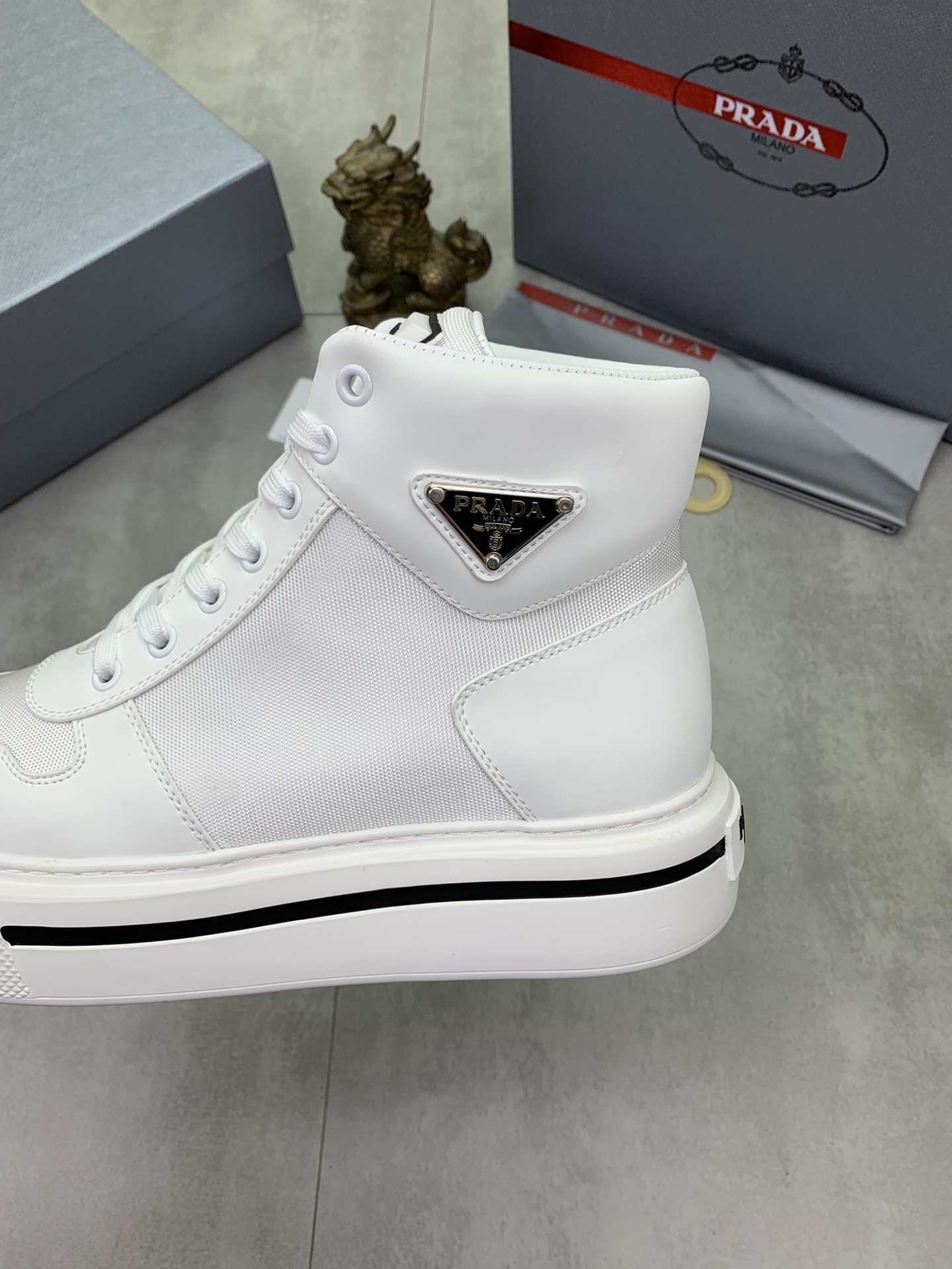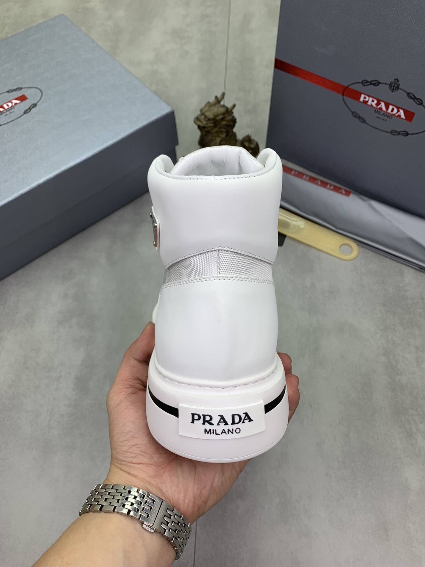 L5 高品质牛里Prada 普拉达 高帮男鞋官网最上市了1:1复制,香港专柜同步,走秀同台;全部采用进口牛皮配原版材质进口透气面牛皮内里、橡胶大底原版1:1防滑耐磨;着脚舒适、款式耐看,做工精细,配以简洁利落的鞋楦,彰显男人的果敢和硬朗,码数38一44;3色选
