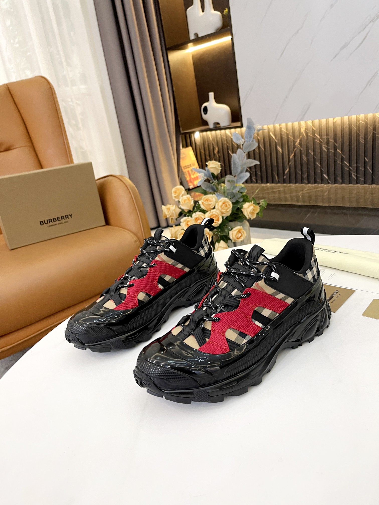L5 Burberry 巴宝莉高版本经典运动鞋爆款,由 Vintage 复古格纹棉质面料打造 ,搭配滚边及品牌徽标贴花.围覆以雨靴灵感的亮泽外缘设计,鞋底的交叉细节汲取品牌标志性格纹的设计灵感 面料:丝绸牛皮 内里:原板网里+绵羊皮 大底:3层组合TPU 颜色:黑/红 码数:男款39-4539,45定制 包装:原板包装