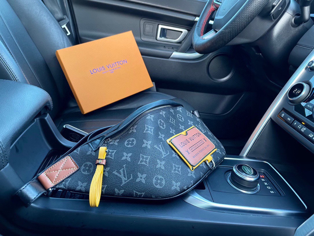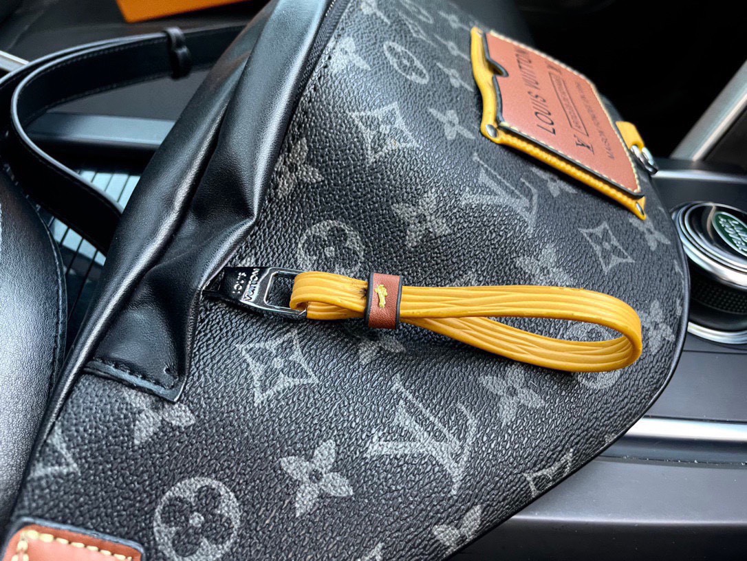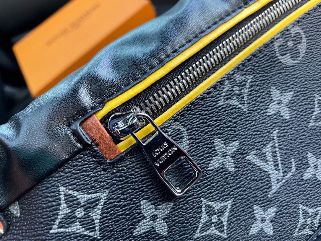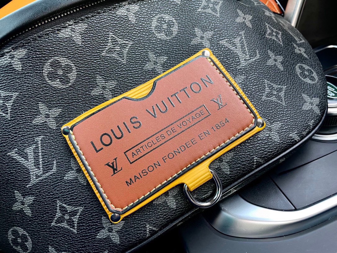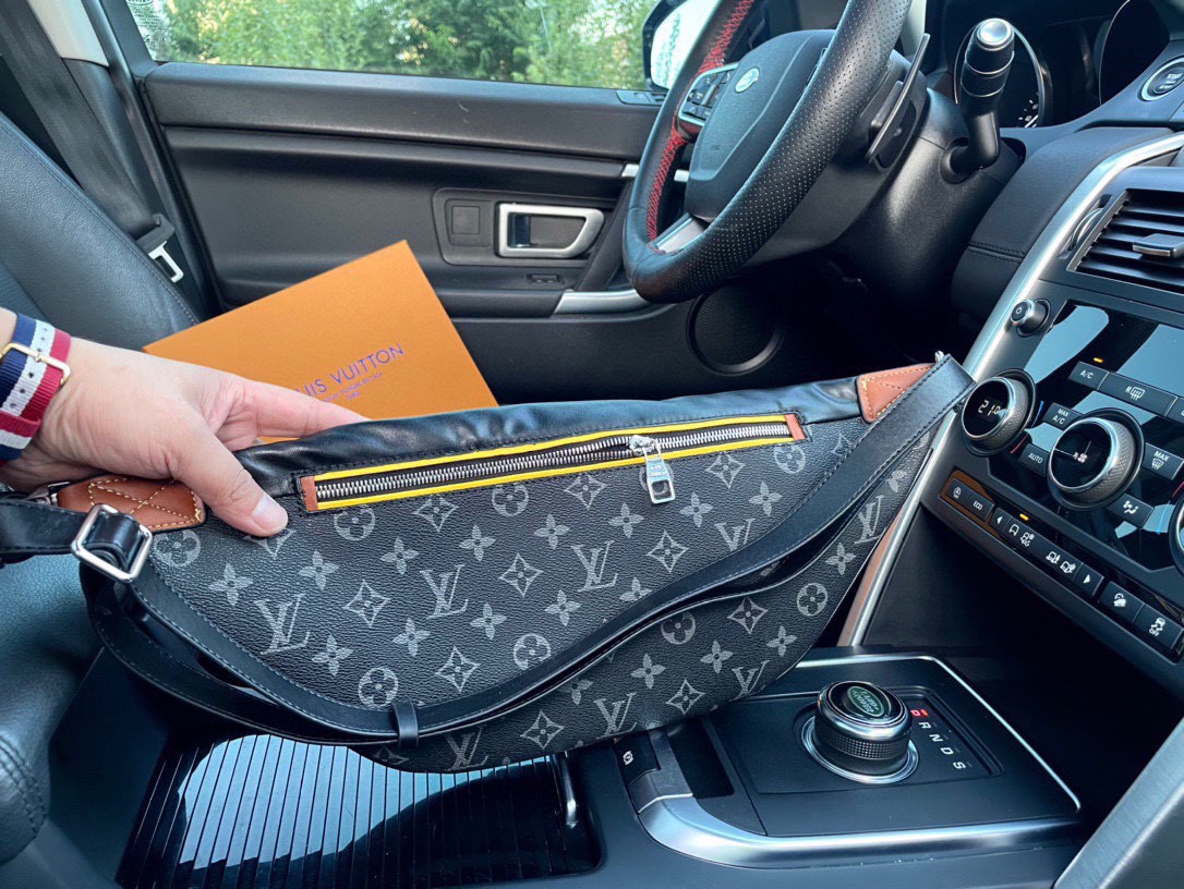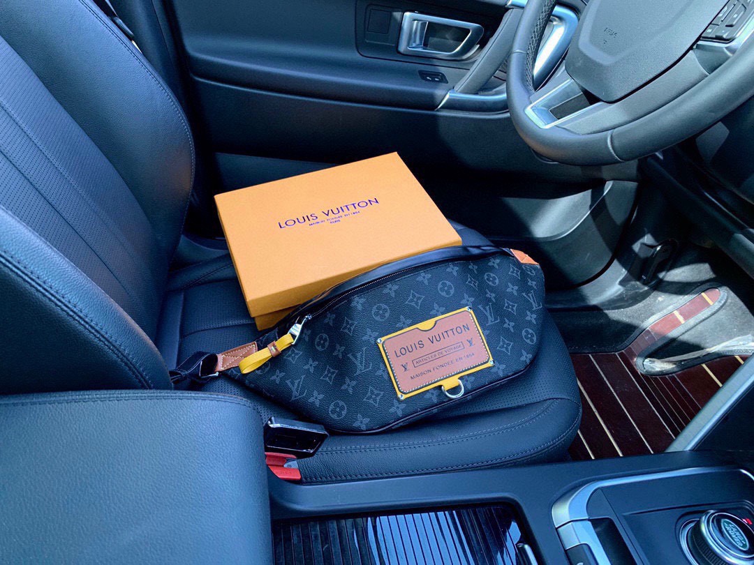 H0 高端货 “Louis Vuitton”胸包M44336 DISCOVERY 腰包 Discovery 腰包属于 Gaston Labels 系列,由 Monogram Eclipse 帆布制成, 饰有压纹皮革贴饰.此限量版款式借鉴路易威登之孙 Gaston-Louis Vuitton 收藏的复古行李标签设计.配有可调节腰带和多个拉链口袋,可安全容纳贵重物品47.0x 20.0x 9.0 cm 背面拉链袋配:礼盒