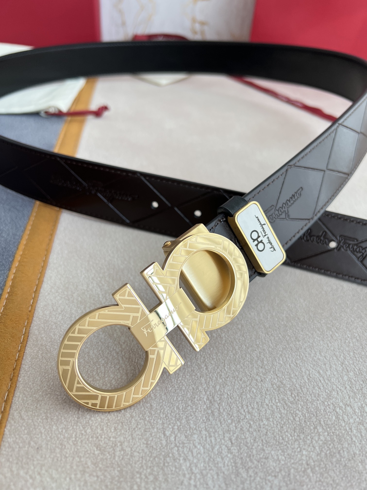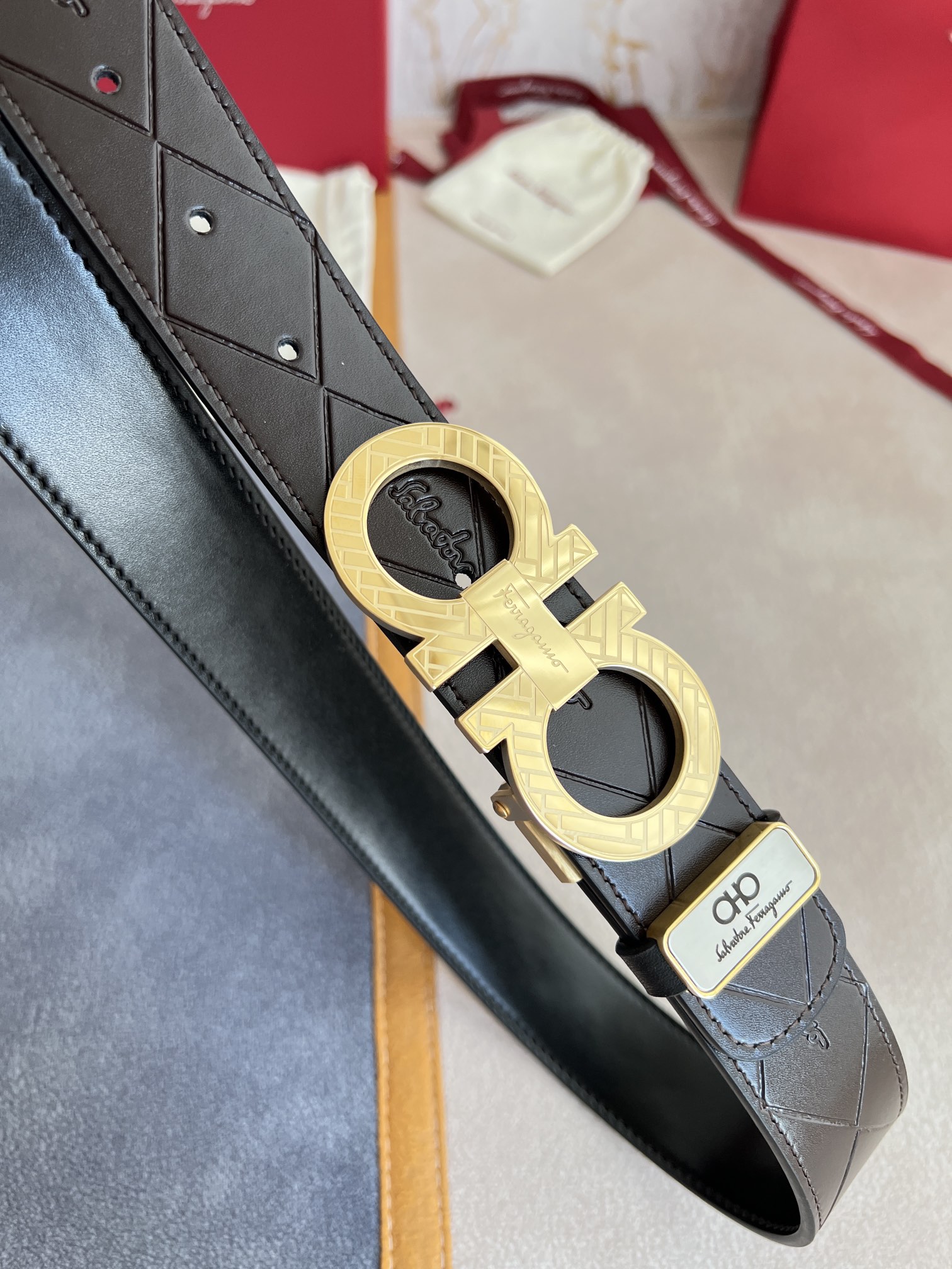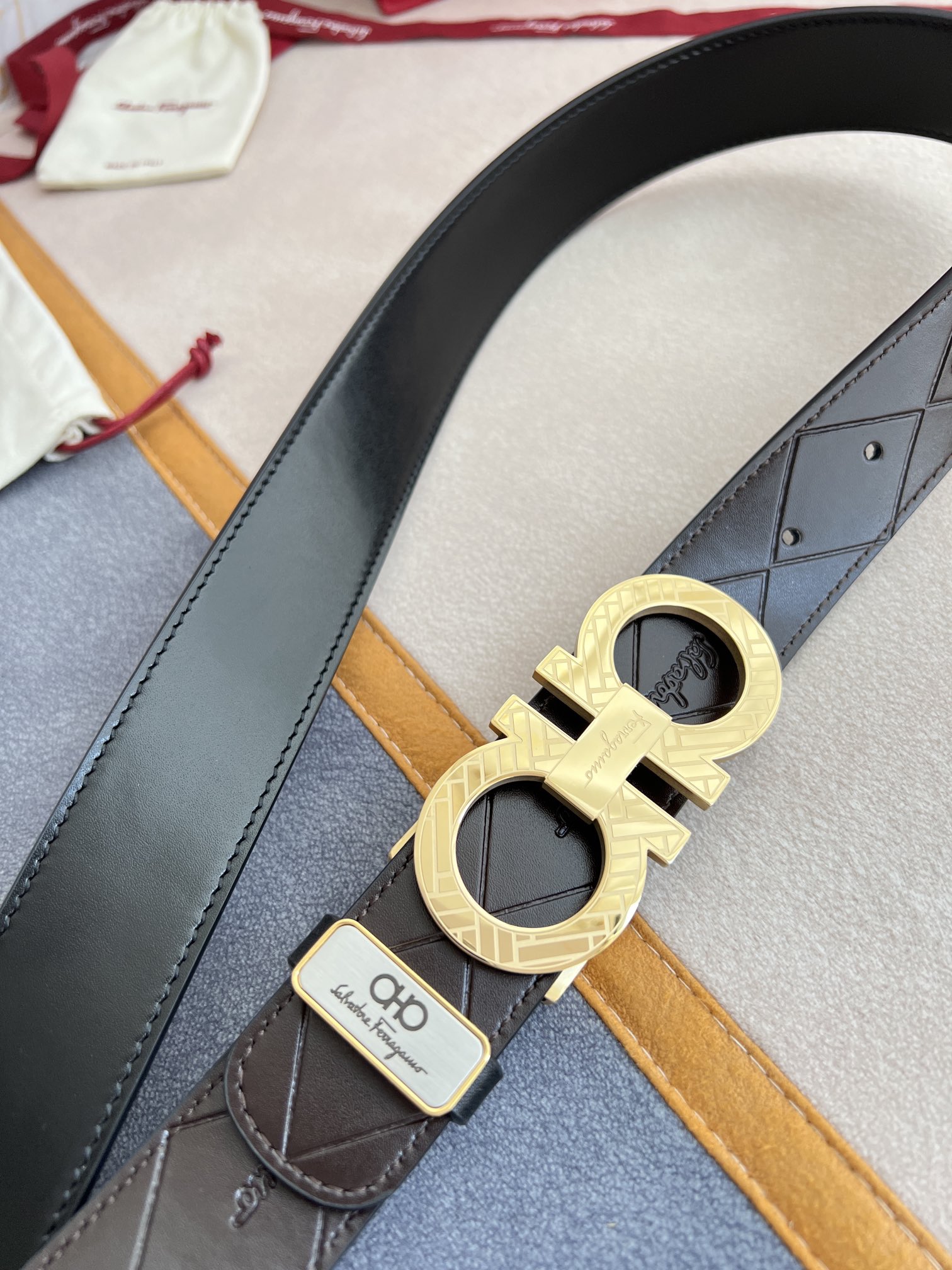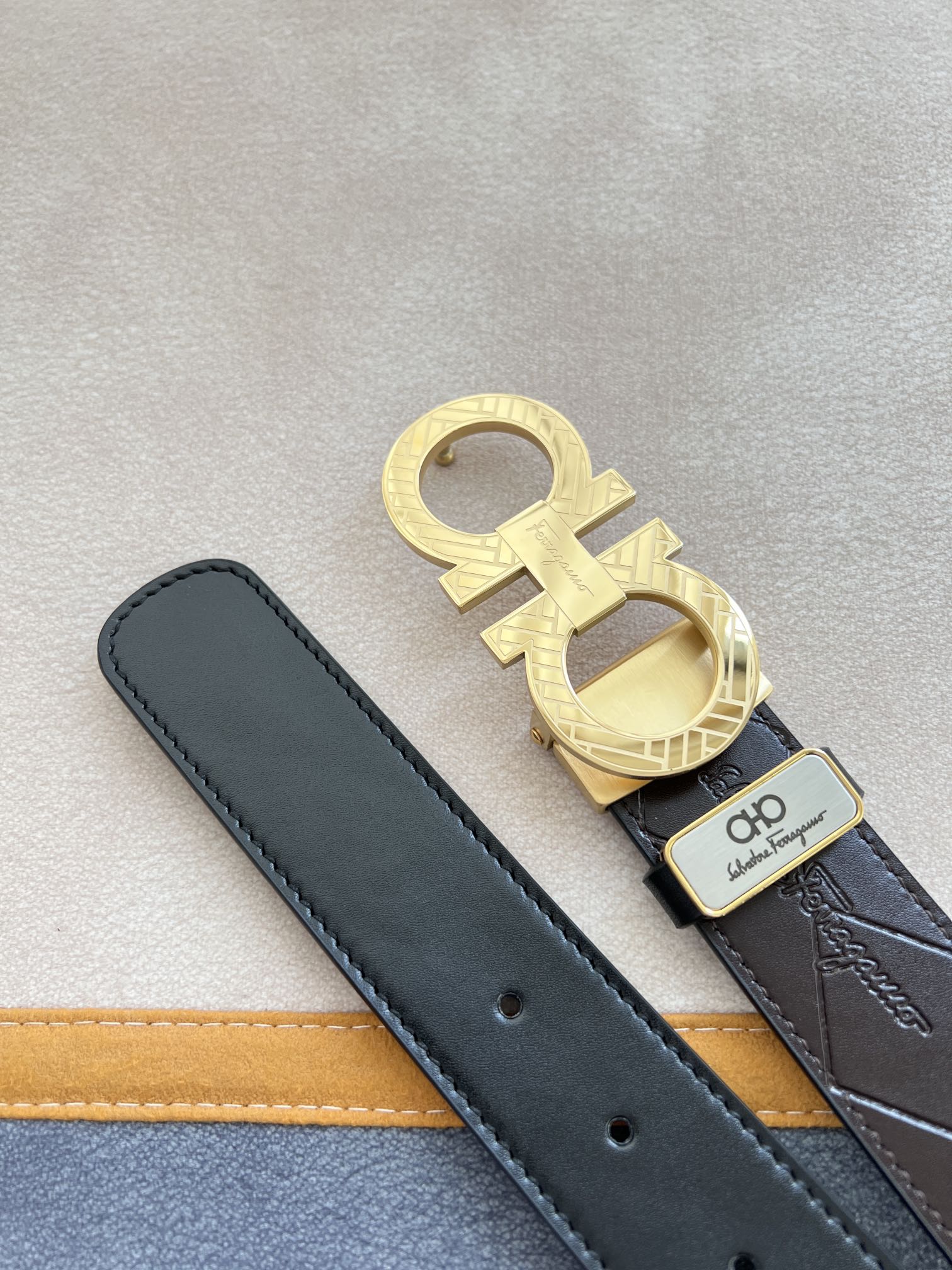 I0 Ferragamo 菲拉格慕 腰带·皮带·原单 型号:挂扣,纯钢材质挂扣,实物拍摄,头层牛皮 材料:百分百头层牛皮,保证真皮.纯钢材质,永不掉色,双面可用专柜同等质量,经典头层牛皮双面光滑平面印花,黑咖,金扣,纯钢材质花纹挂扣,带身可自由裁剪,可双面使用,送人自用首选 包装:请认准如图专柜包装,赠送打孔器,原版电子票,宽度3.5mm