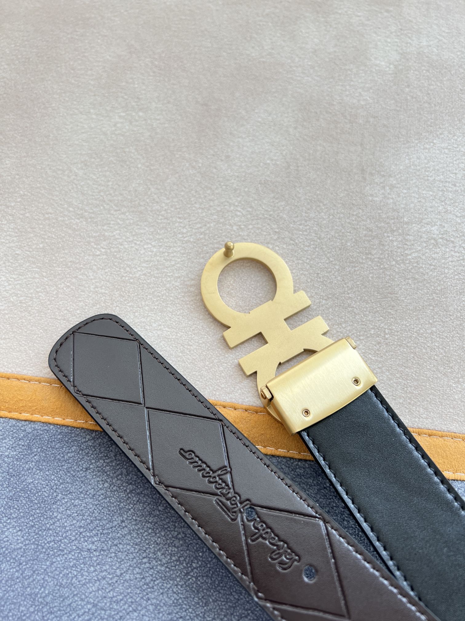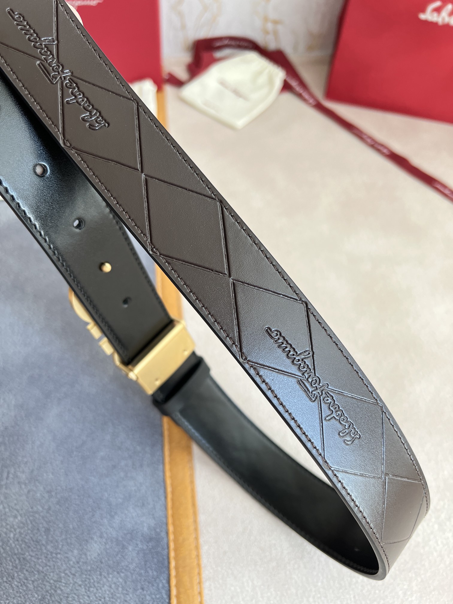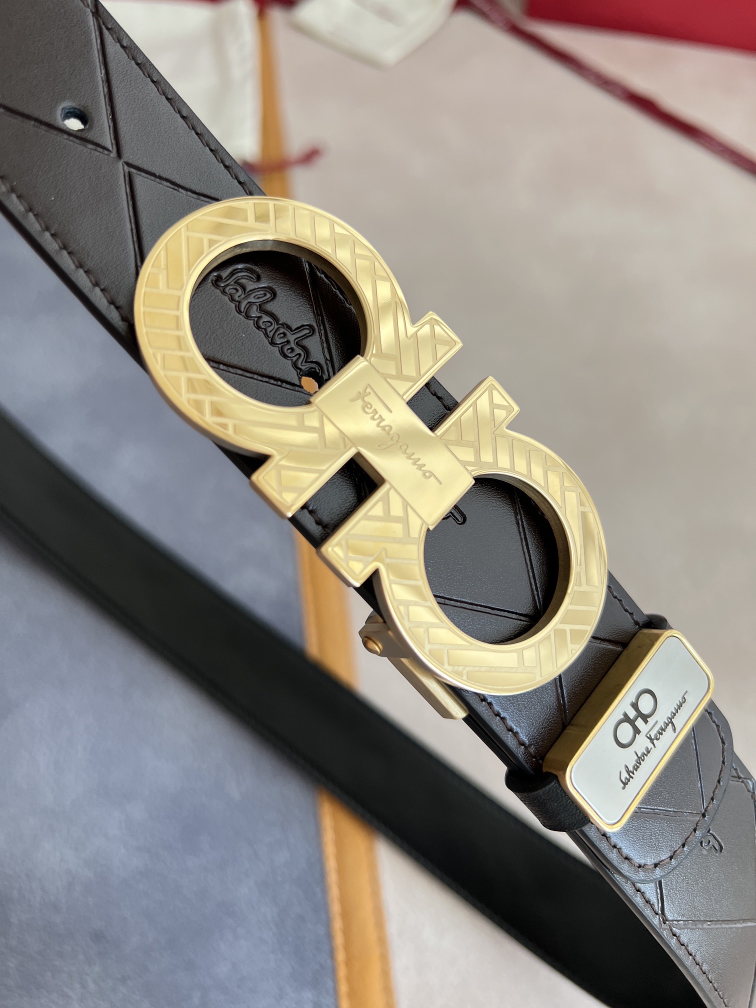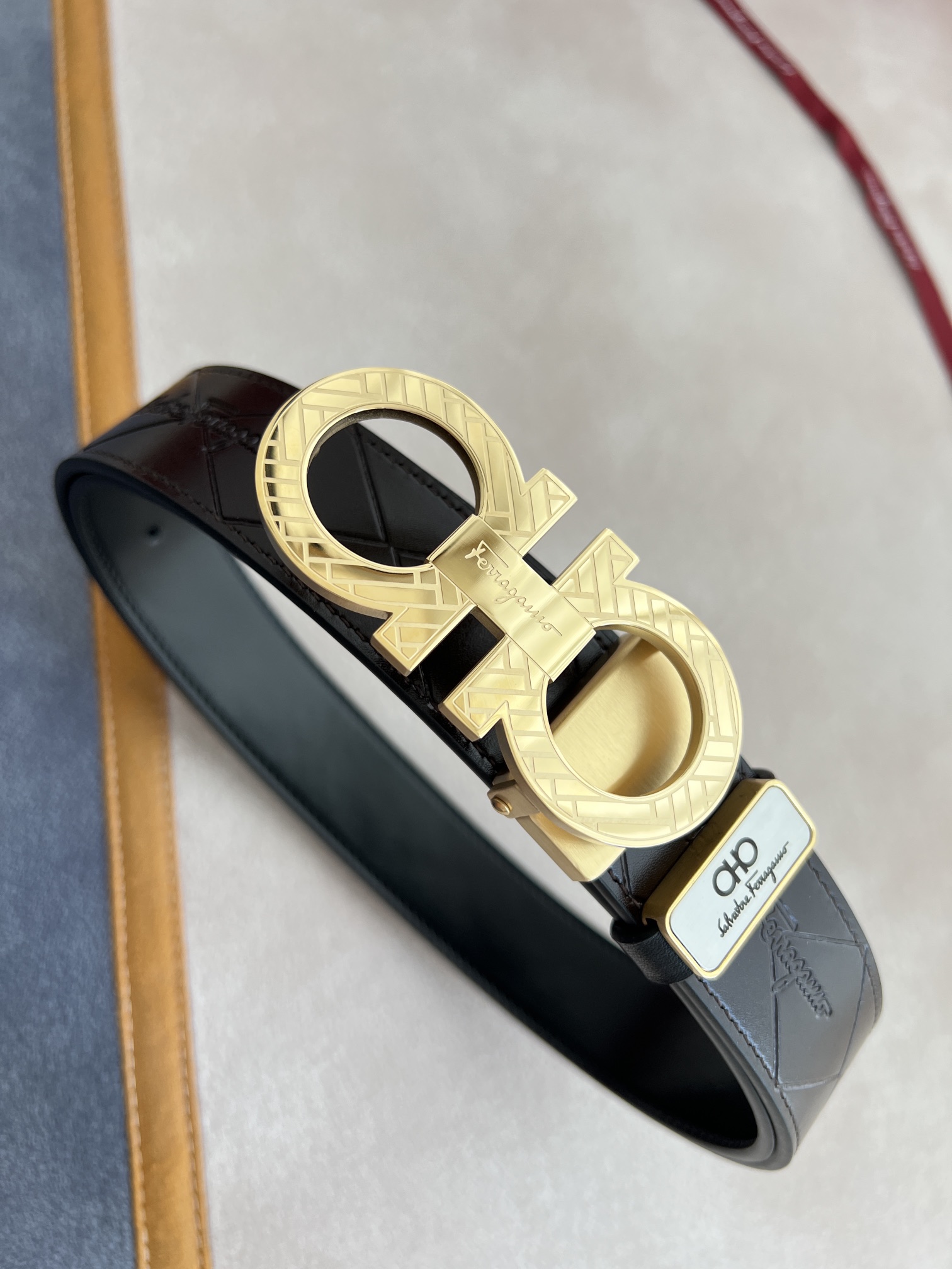 I0 Ferragamo 菲拉格慕 腰带·皮带·原单 型号:挂扣,纯钢材质挂扣,实物拍摄,头层牛皮 材料:百分百头层牛皮,保证真皮.纯钢材质,永不掉色,双面可用专柜同等质量,经典头层牛皮双面光滑平面印花,黑咖,金扣,纯钢材质花纹挂扣,带身可自由裁剪,可双面使用,送人自用首选 包装:请认准如图专柜包装,赠送打孔器,原版电子票,宽度3.5mm