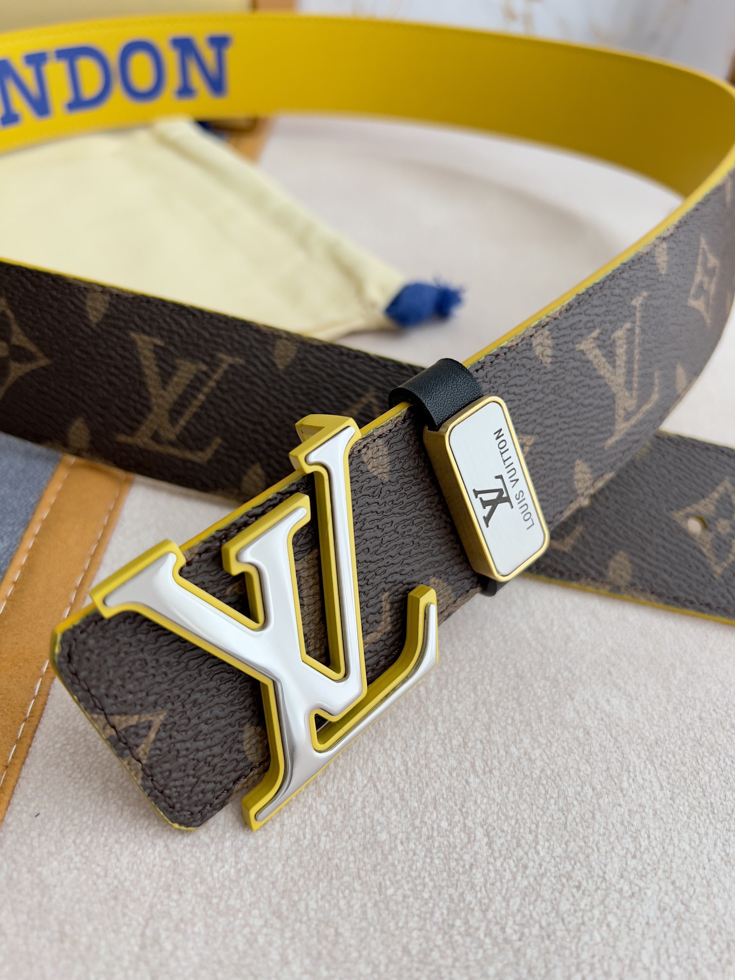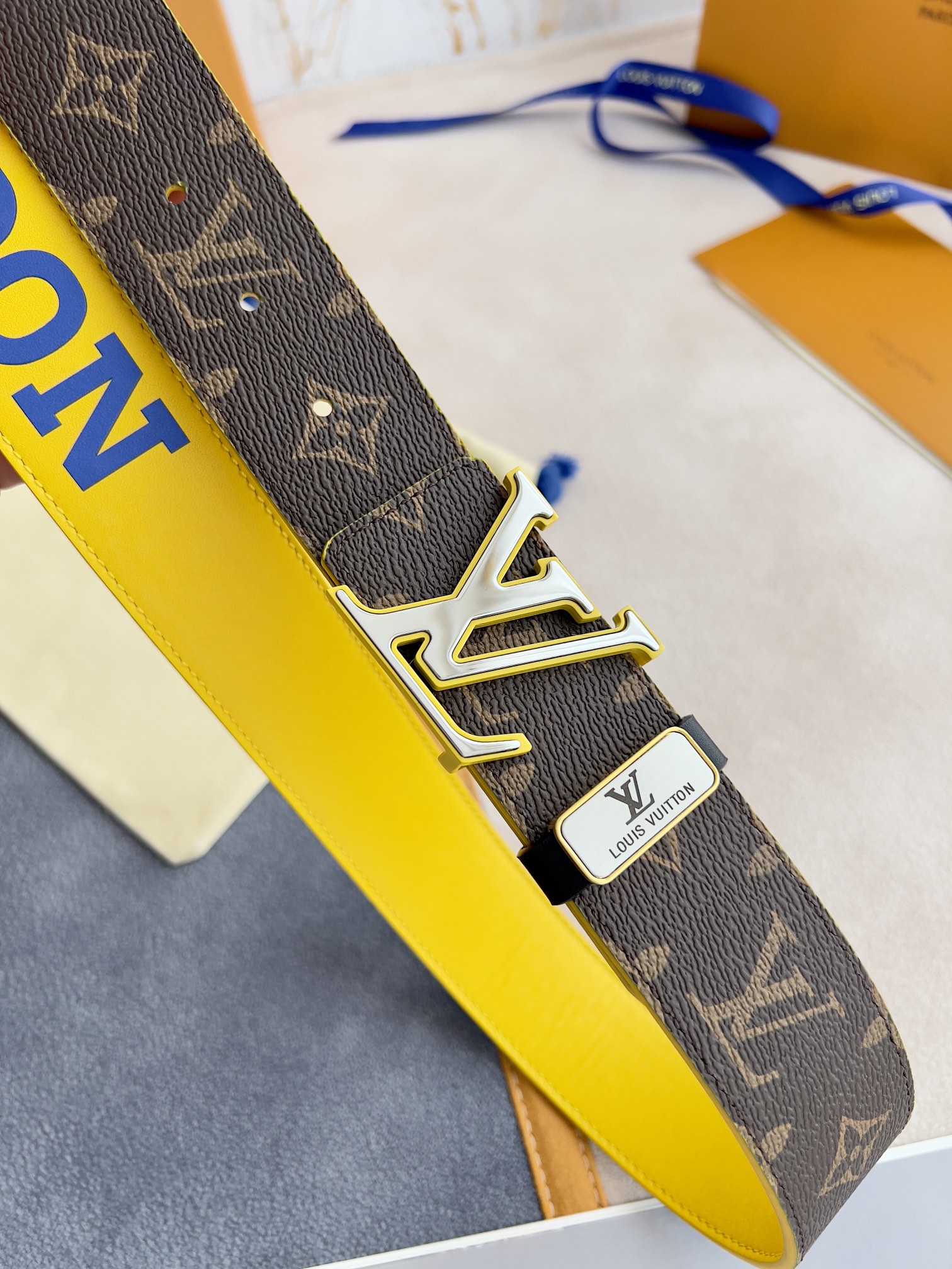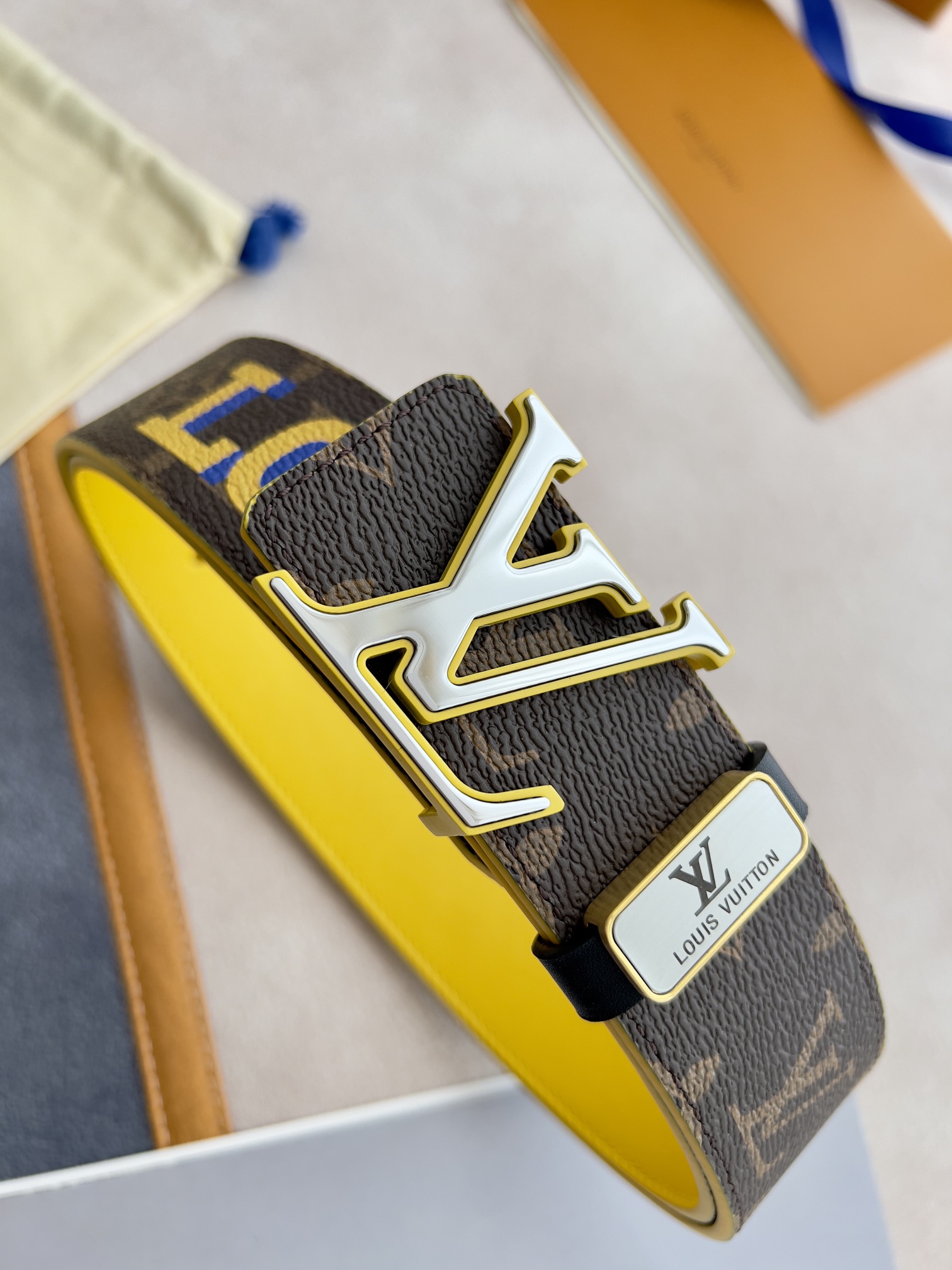 I5 Louis vuitton 路易威登 LV 腰带皮带原单 型号:挂扣,经典纯钢材质双色挂扣,图片实物拍摄 材料:头层牛皮,挂扣系列,纯钢材质扣头,钯镀电镀工艺永不掉色.原版印花咖老花头层平纹皮底黄,黄配银扣,双面可用,专柜同等质量,送人自用首选 包装如图专柜包装,赠送打孔器,原版电子票,宽度3.8cm
