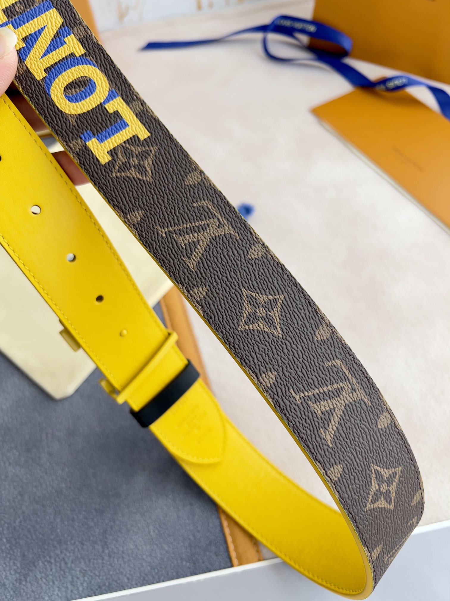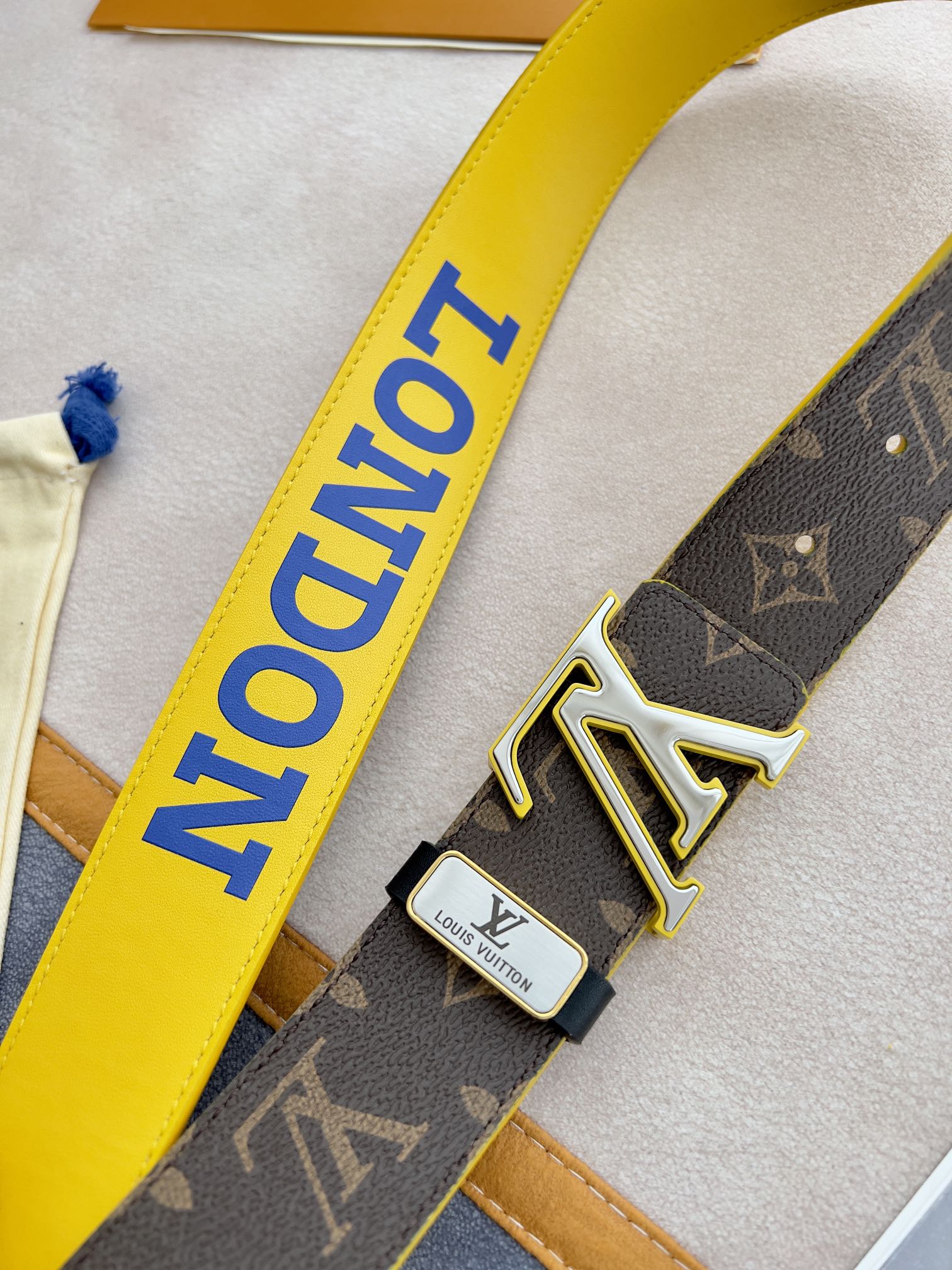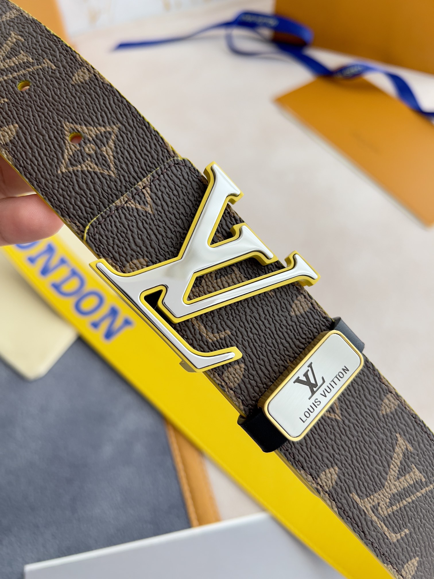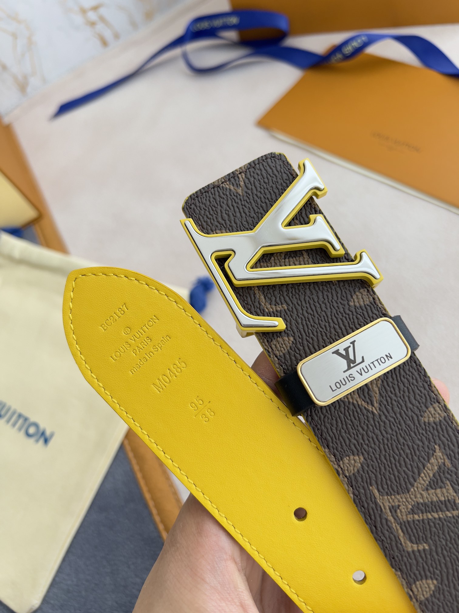 I5 Louis vuitton 路易威登 LV 腰带皮带原单 型号:挂扣,经典纯钢材质双色挂扣,图片实物拍摄 材料:头层牛皮,挂扣系列,纯钢材质扣头,钯镀电镀工艺永不掉色.原版印花咖老花头层平纹皮底黄,黄配银扣,双面可用,专柜同等质量,送人自用首选 包装如图专柜包装,赠送打孔器,原版电子票,宽度3.8cm
