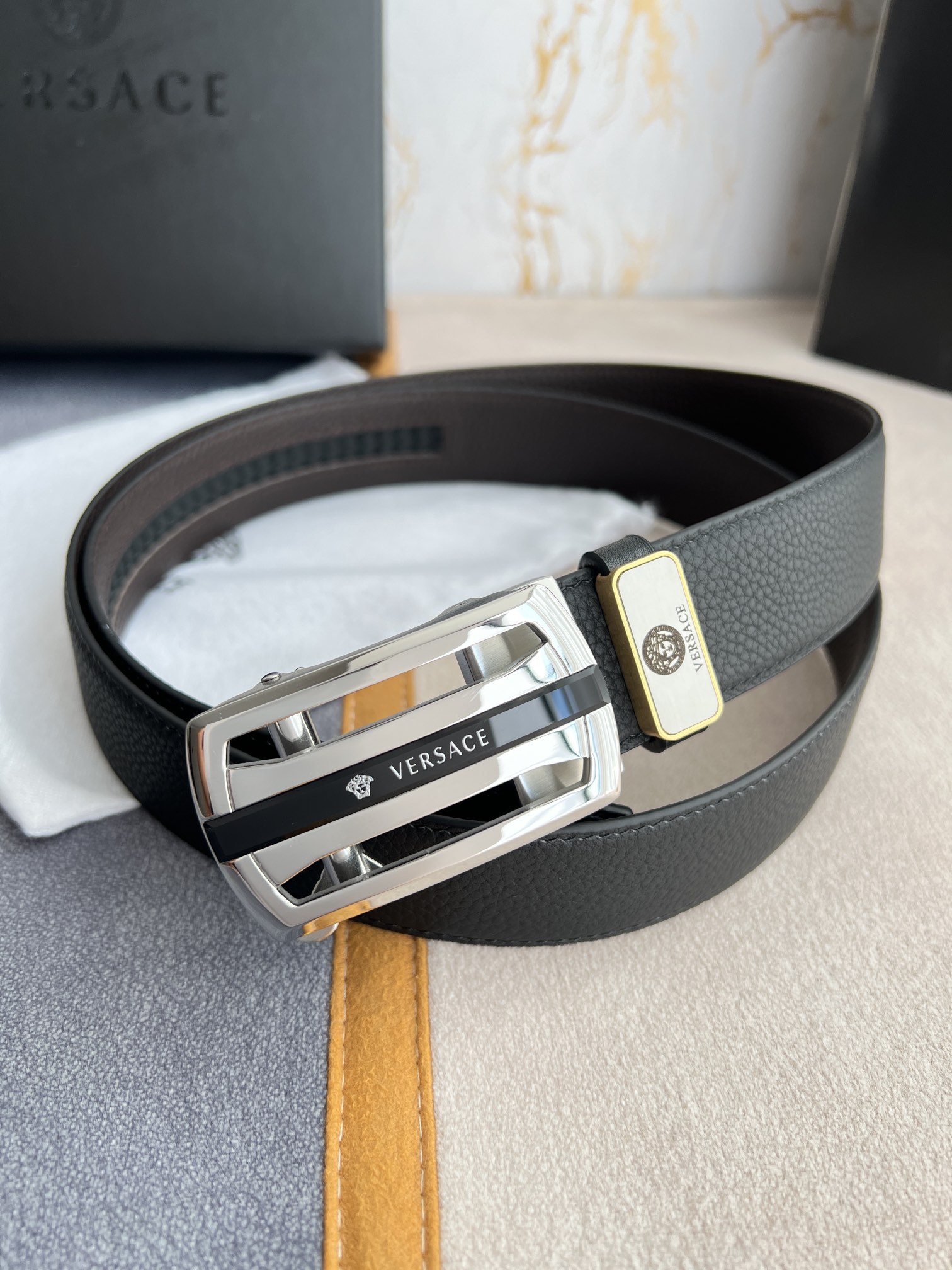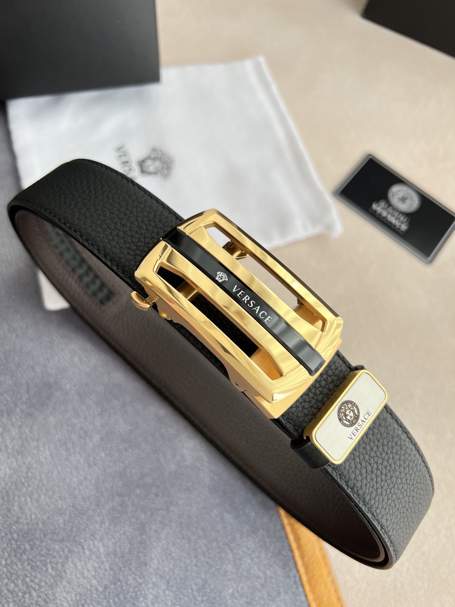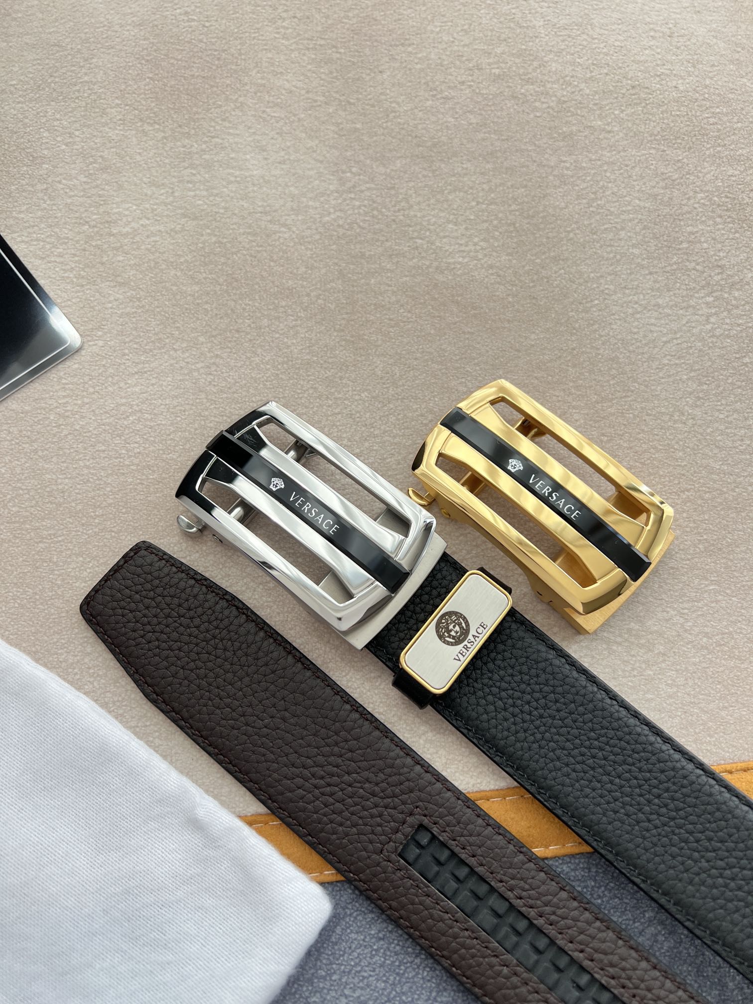 I5 Versace 范思哲 VERSACE.皮带腰带自动皮带p 型号:自动带身,纯钢材质经典人头自动扣,图片实物拍摄 腰带:百分百头层牛皮,自动带身,保证真皮.24k纯钢扣永不掉色专柜同等质量,经典头层牛皮双面荔枝纹,黑咖,镂空人头纯钢材质扣头,可自由裁剪,送人自用首选 包装请认准如图专柜包装,赠送拆卸工具,原版电子票,宽度3.5cm