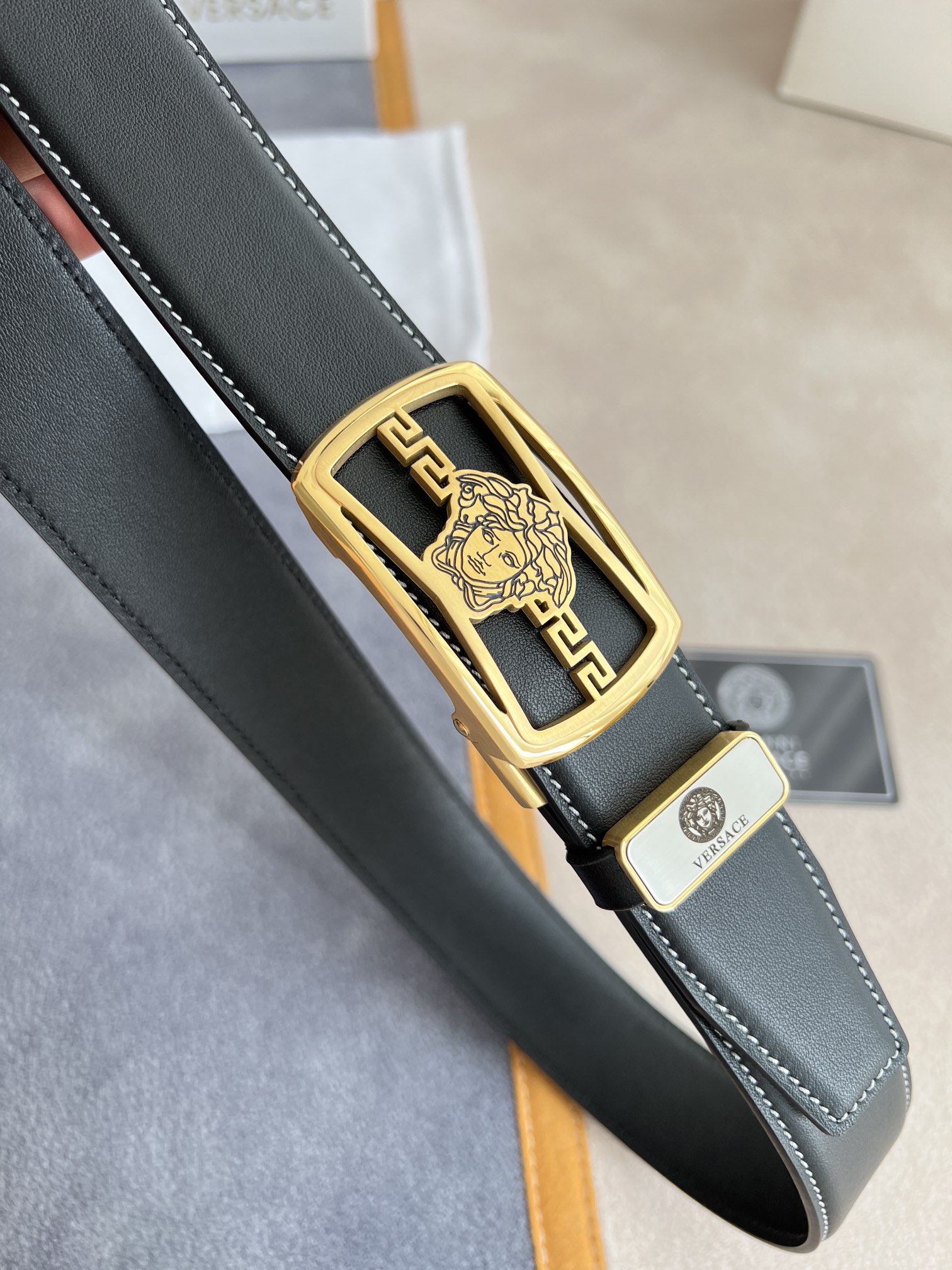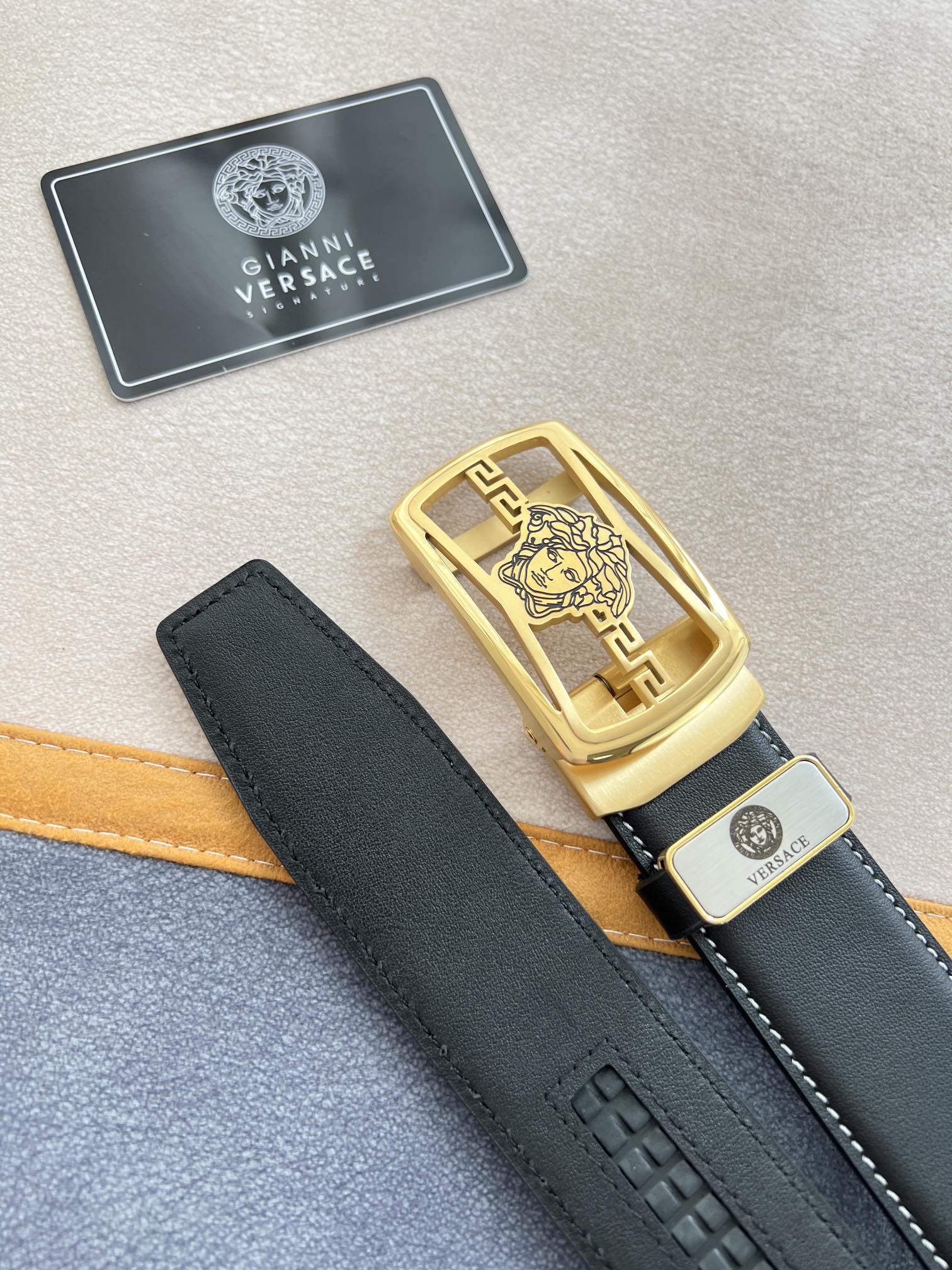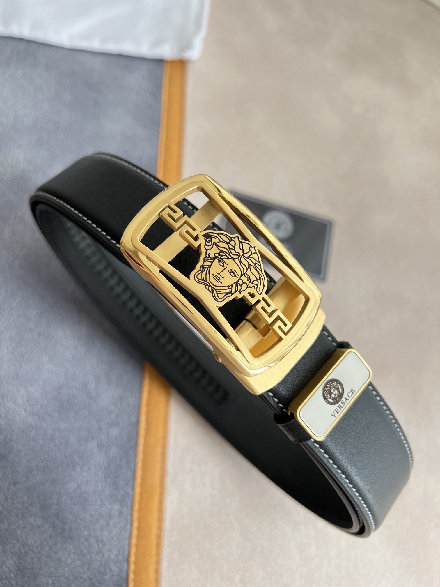 I5 Versace 范思哲 VERSACE.皮带腰带自动皮带p 型号:自动带身,纯钢材质经典人头自动扣,图片实物拍摄 腰带:百分百头层牛皮,自动带身,保证真皮.24k纯钢扣永不掉色专柜同等质量,经典头层牛皮平纹白线头层牛皮平纹底,金扣,镂空人头纯钢材质扣头,可自由裁剪,送人自用首选 包装请认准如图专柜包装,赠送拆卸工具,原版电子票,宽度3.5cm