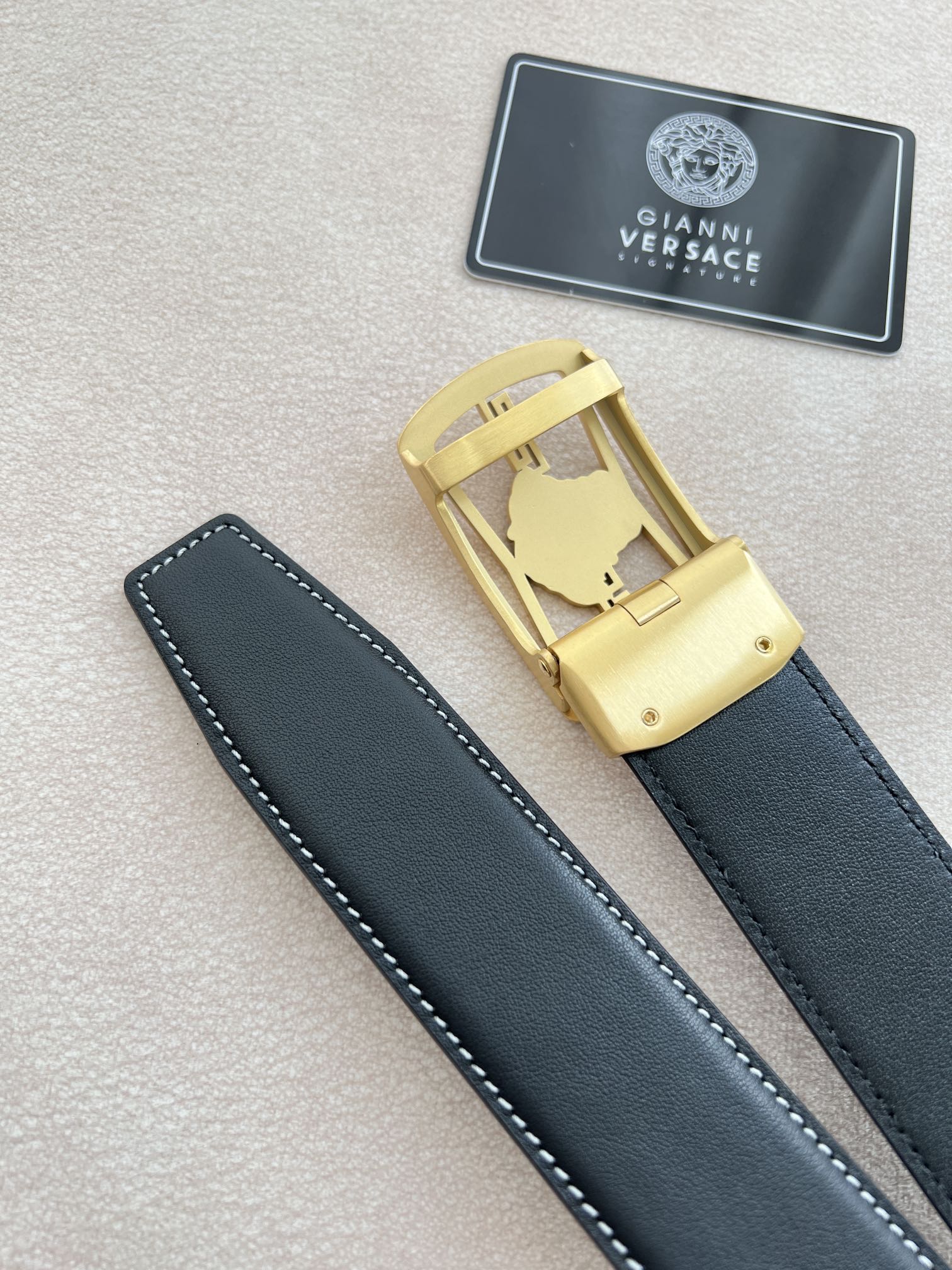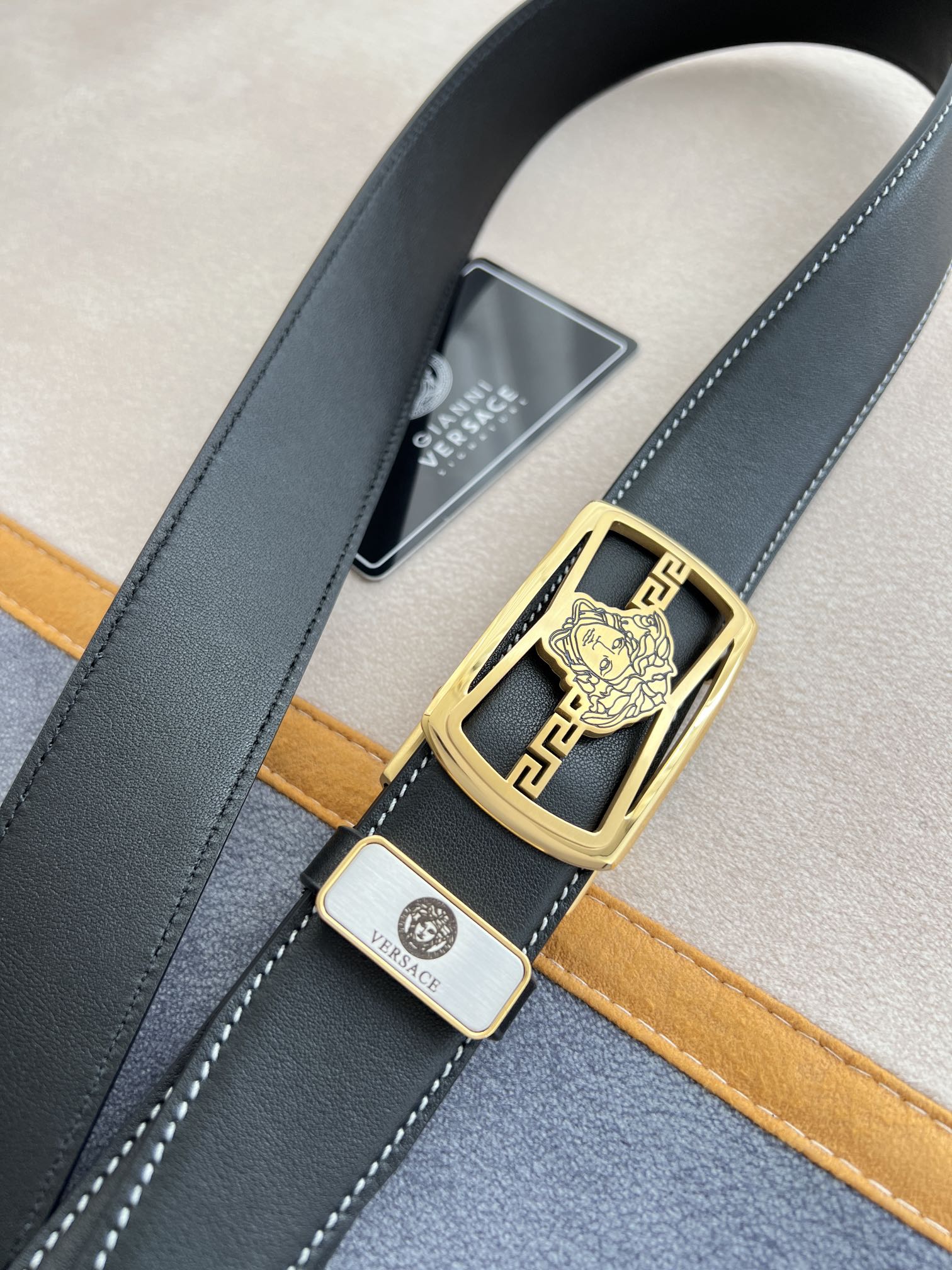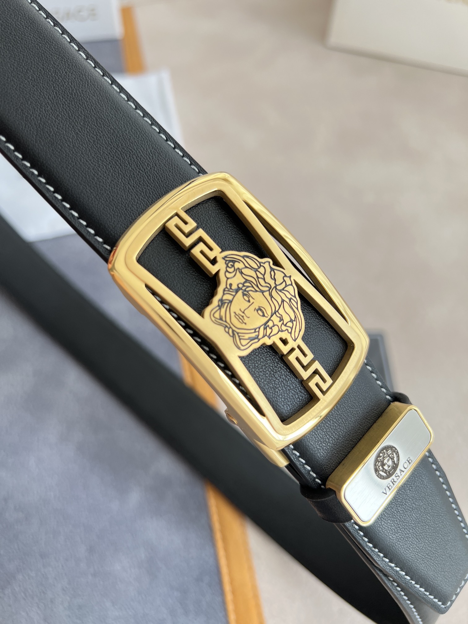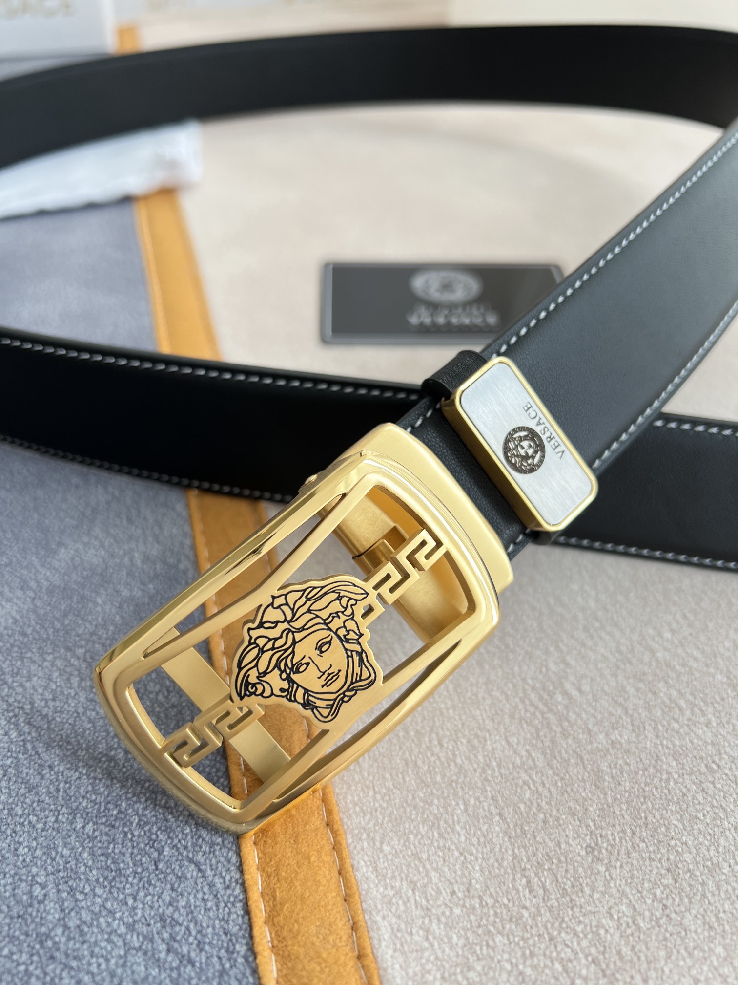 I5 Versace 范思哲 VERSACE.皮带腰带自动皮带p 型号:自动带身,纯钢材质经典人头自动扣,图片实物拍摄 腰带:百分百头层牛皮,自动带身,保证真皮.24k纯钢扣永不掉色专柜同等质量,经典头层牛皮平纹白线头层牛皮平纹底,金扣,镂空人头纯钢材质扣头,可自由裁剪,送人自用首选 包装请认准如图专柜包装,赠送拆卸工具,原版电子票,宽度3.5cm